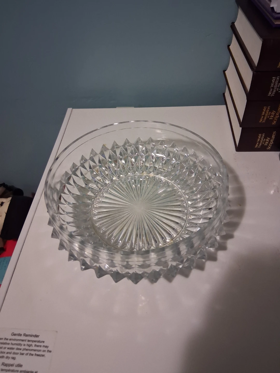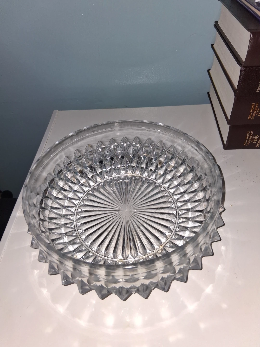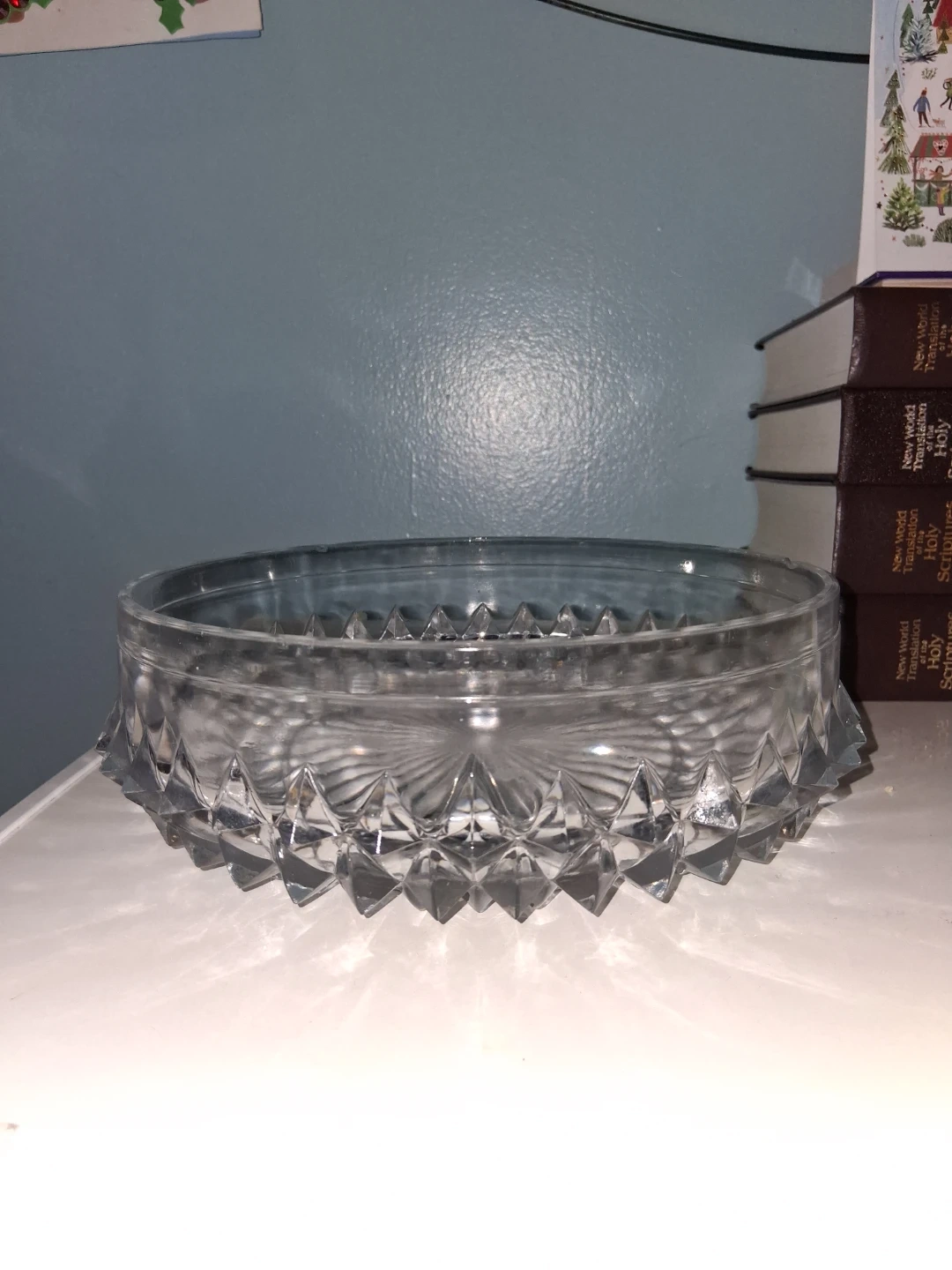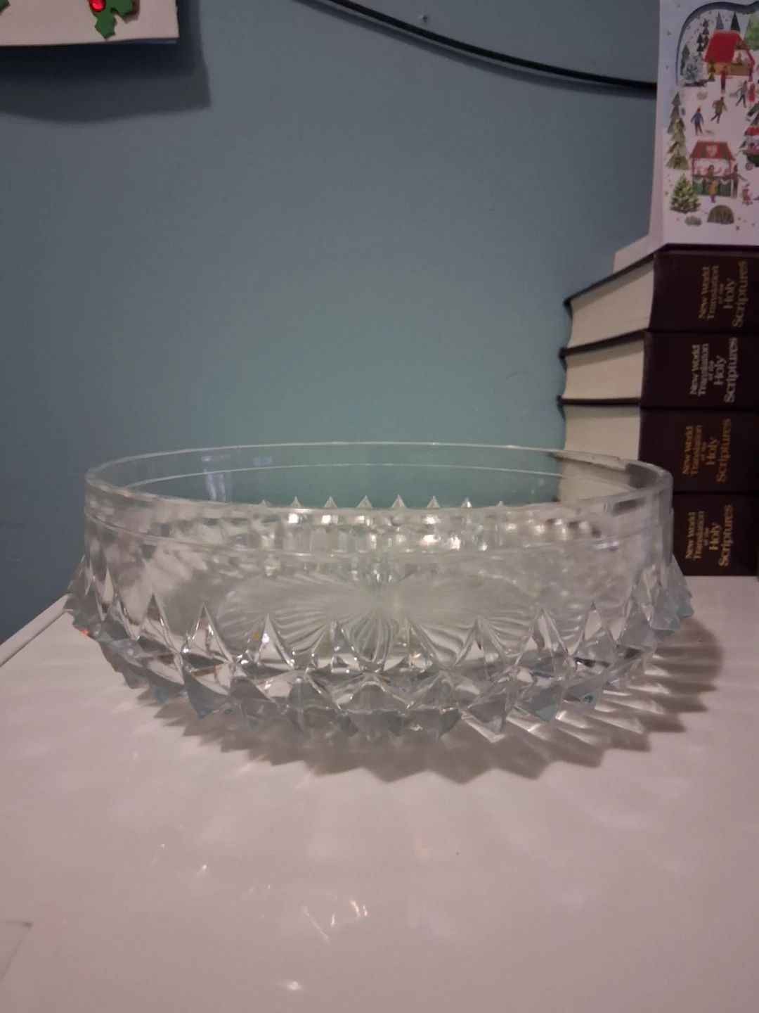 Selling a lovely crystal glass bowl! It's in great condition and would look beautiful as a centrepiece or for serving. It has a unique design with a starburst pattern in the centre and a decorative edge. Perfect for adding a touch of elegance to your home. It's a heavy bowl. Almost 9 inches across and just slightly over 3 inches deep.