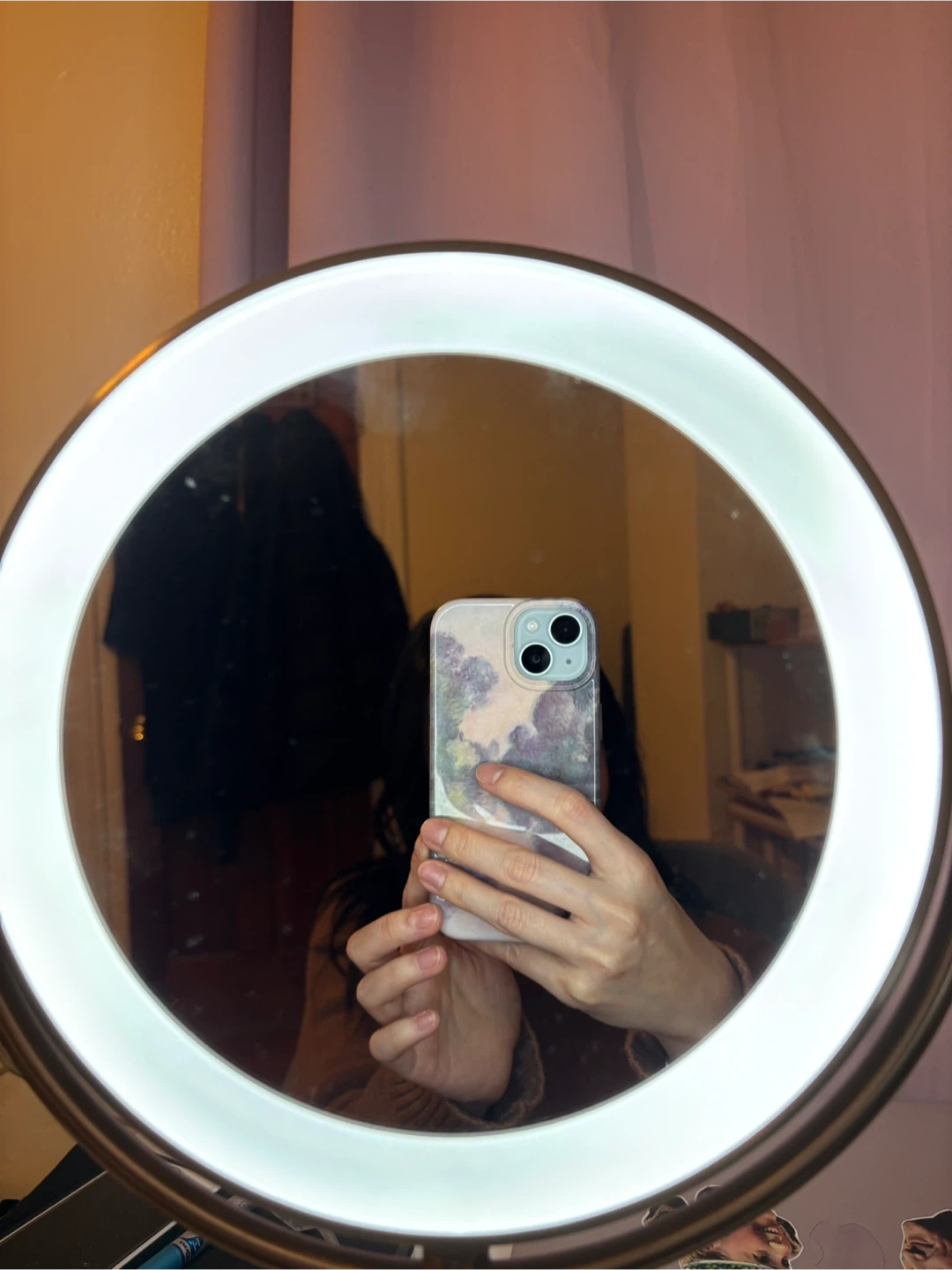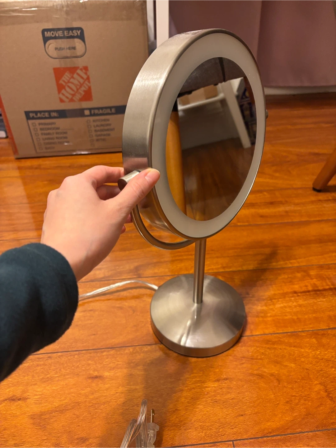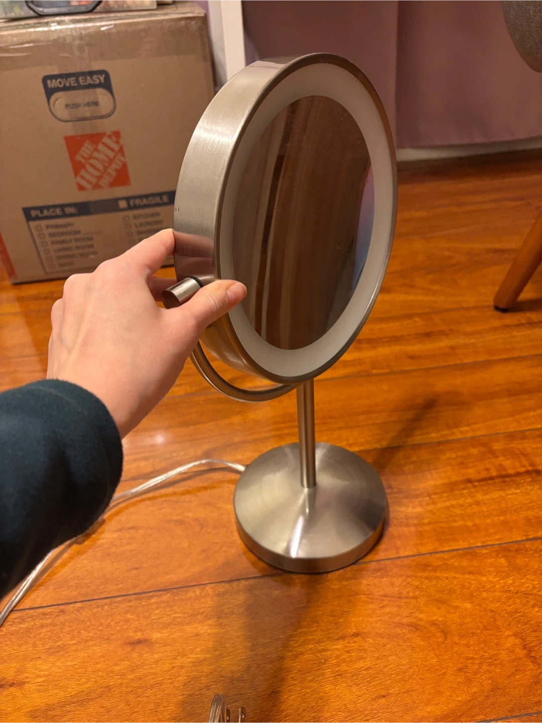 Selling a LED lighted makeup mirror! It's double-sided; one side is regular, and the other side features a 10x larger image. It's in great condition.