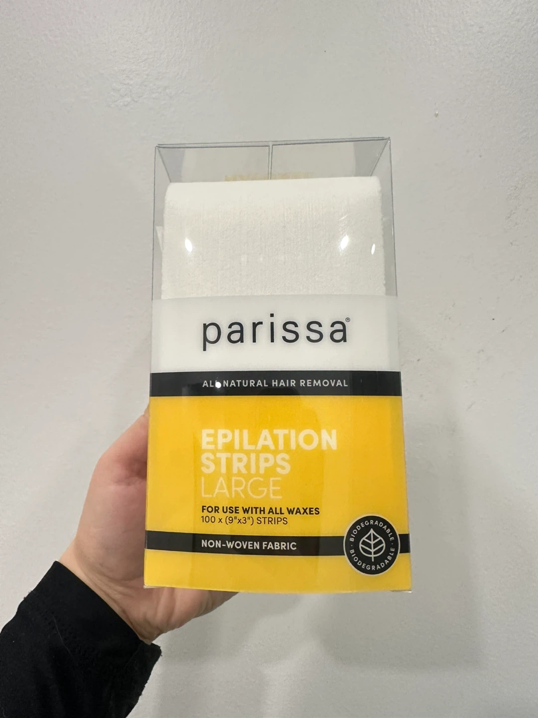 Selling a new pack of Parissa Epilation Strips in the large size! These are all-natural hair removal strips, perfect for use with all waxes. You'll get 100 strips, each measuring 9"x3". They're made of non-woven fabric and are biodegradable✨