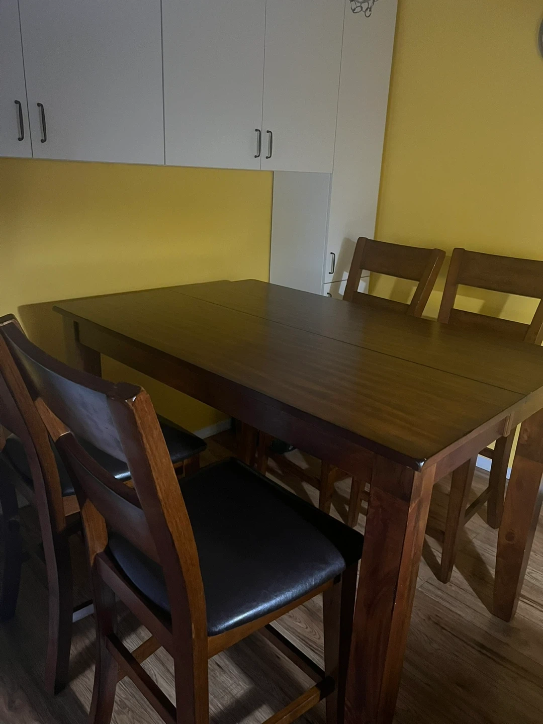 Selling a dining table with four chairs! The set is made of solid wood with a dark finish. It's perfect for a dining area or kitchen. The high chairs have black seats, which are easy to clean. It is in good condition and ready for a new home!