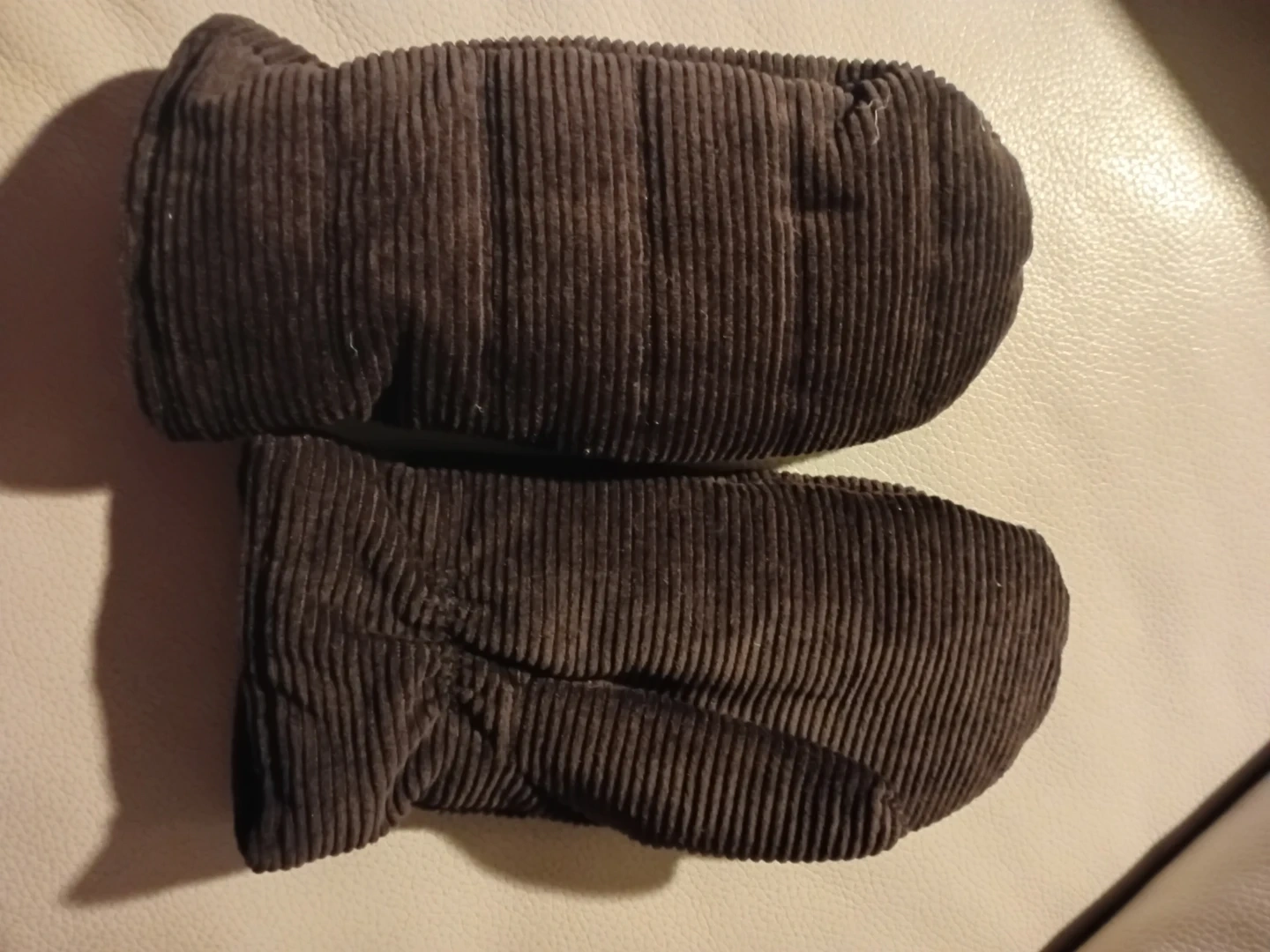 Here are some cozy brown corduroy mittens! They're in great condition and ready to keep your hands warm during the colder months. Perfect for kids or adults with smaller hands
