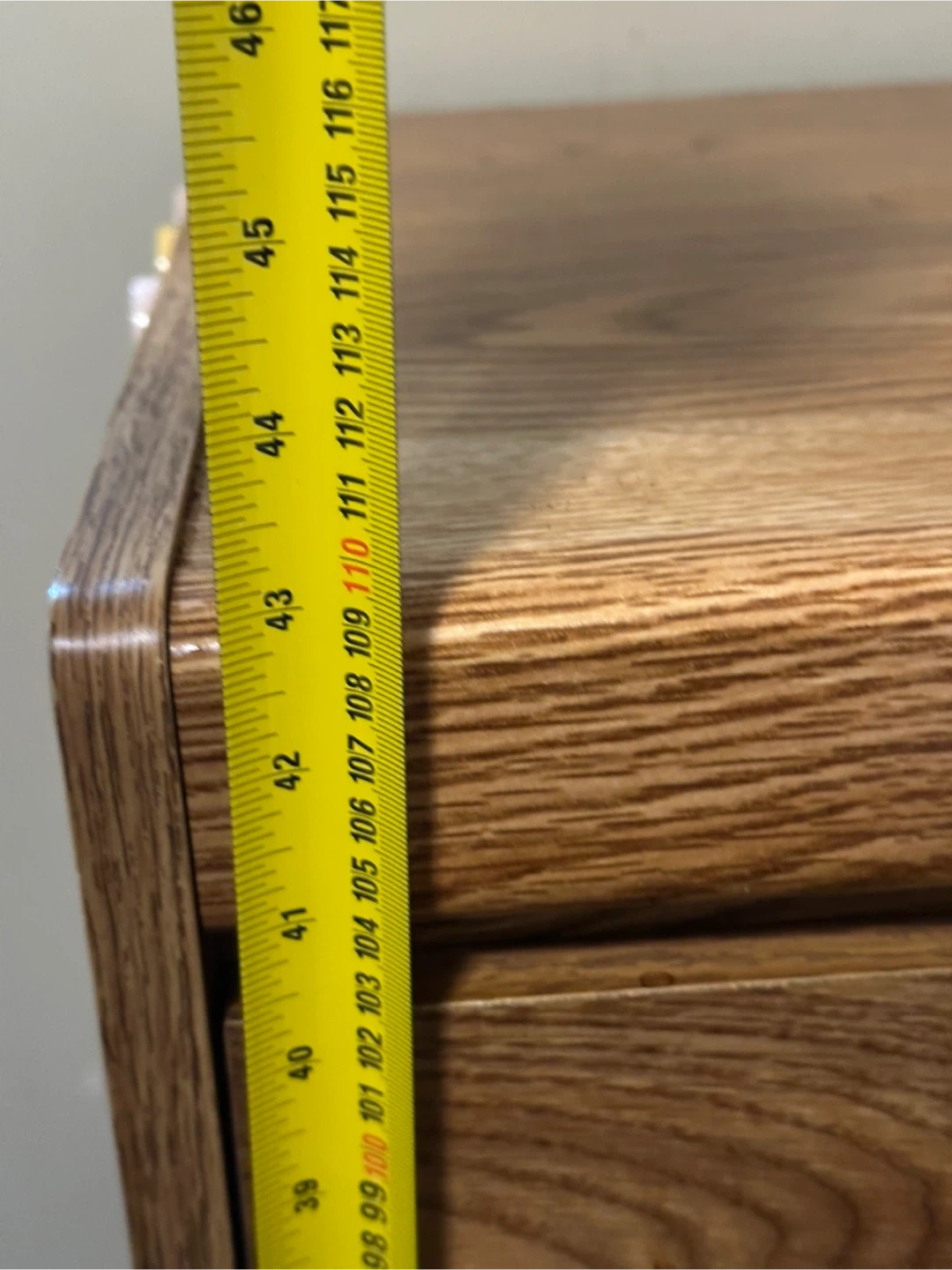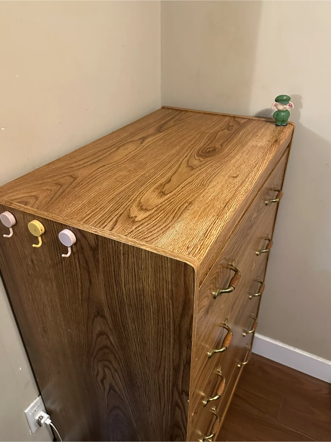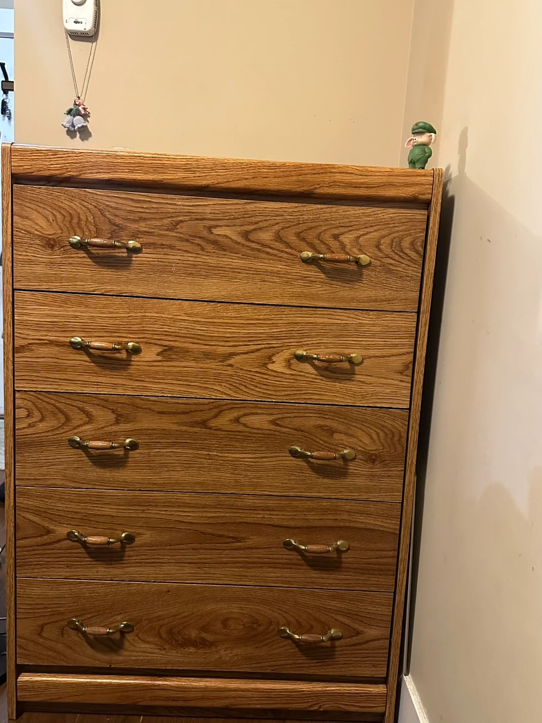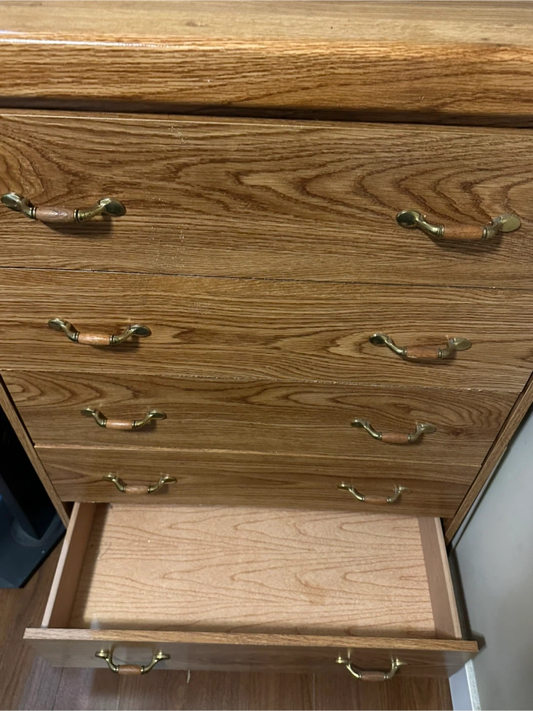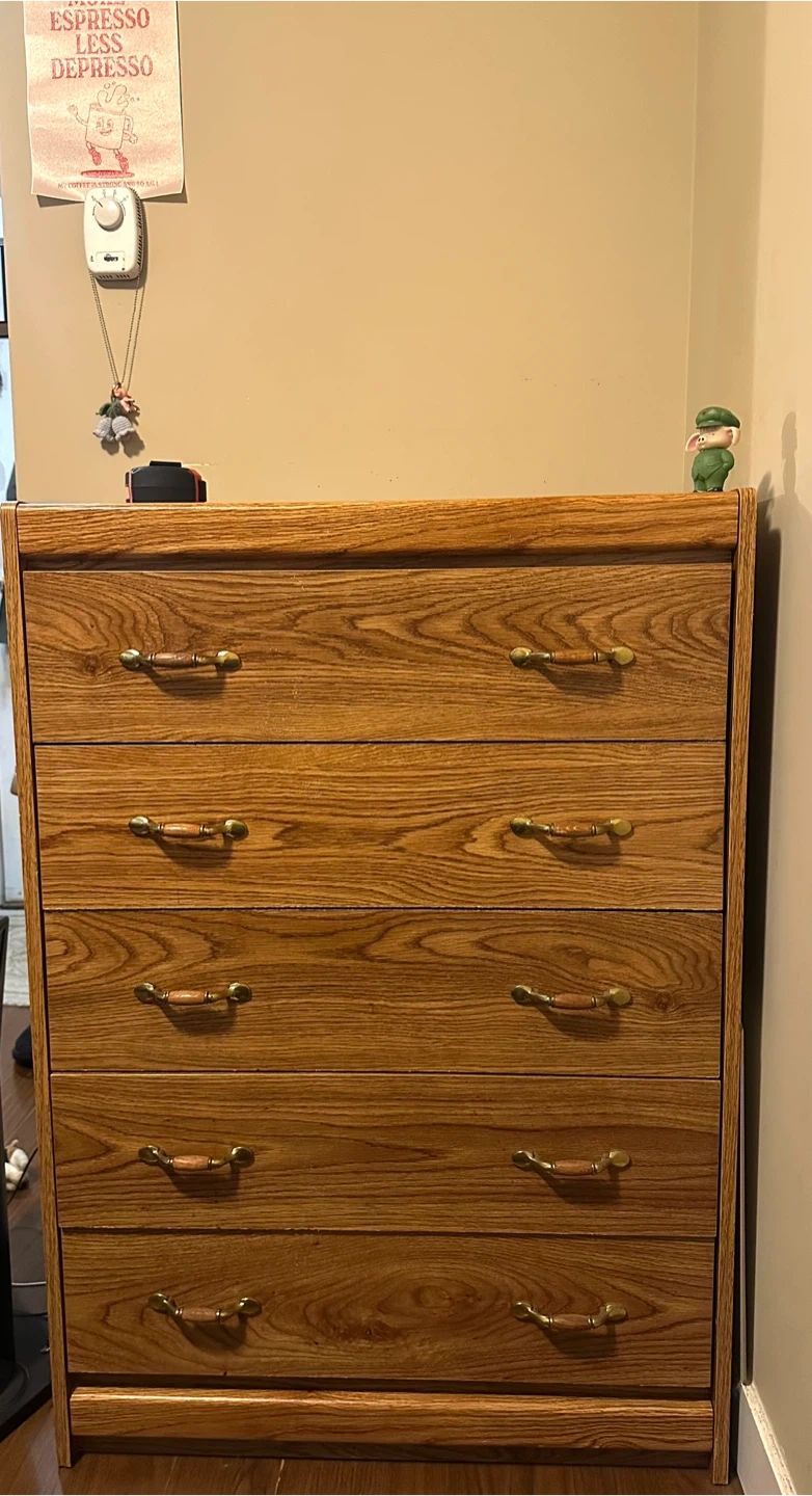 Here's a wood dresser with 6 drawers! It's in good condition and ready for a new home. The dresser has a light brown wood-grain finish and brass-coloured handles. It measures approximately 49-50 inches across