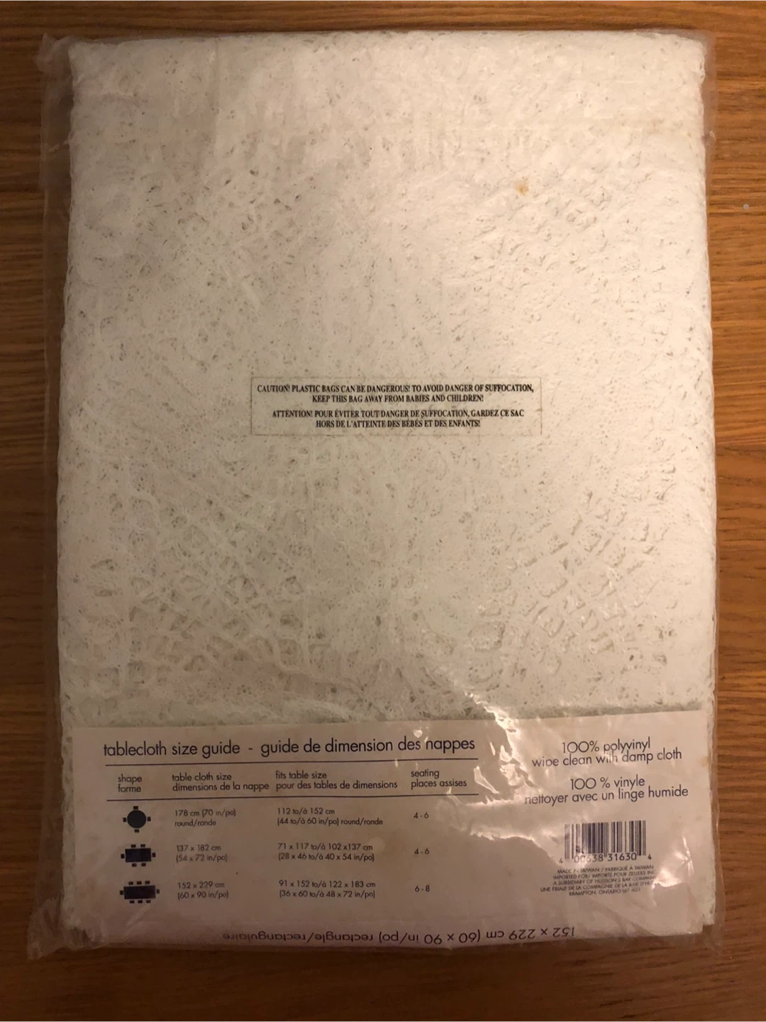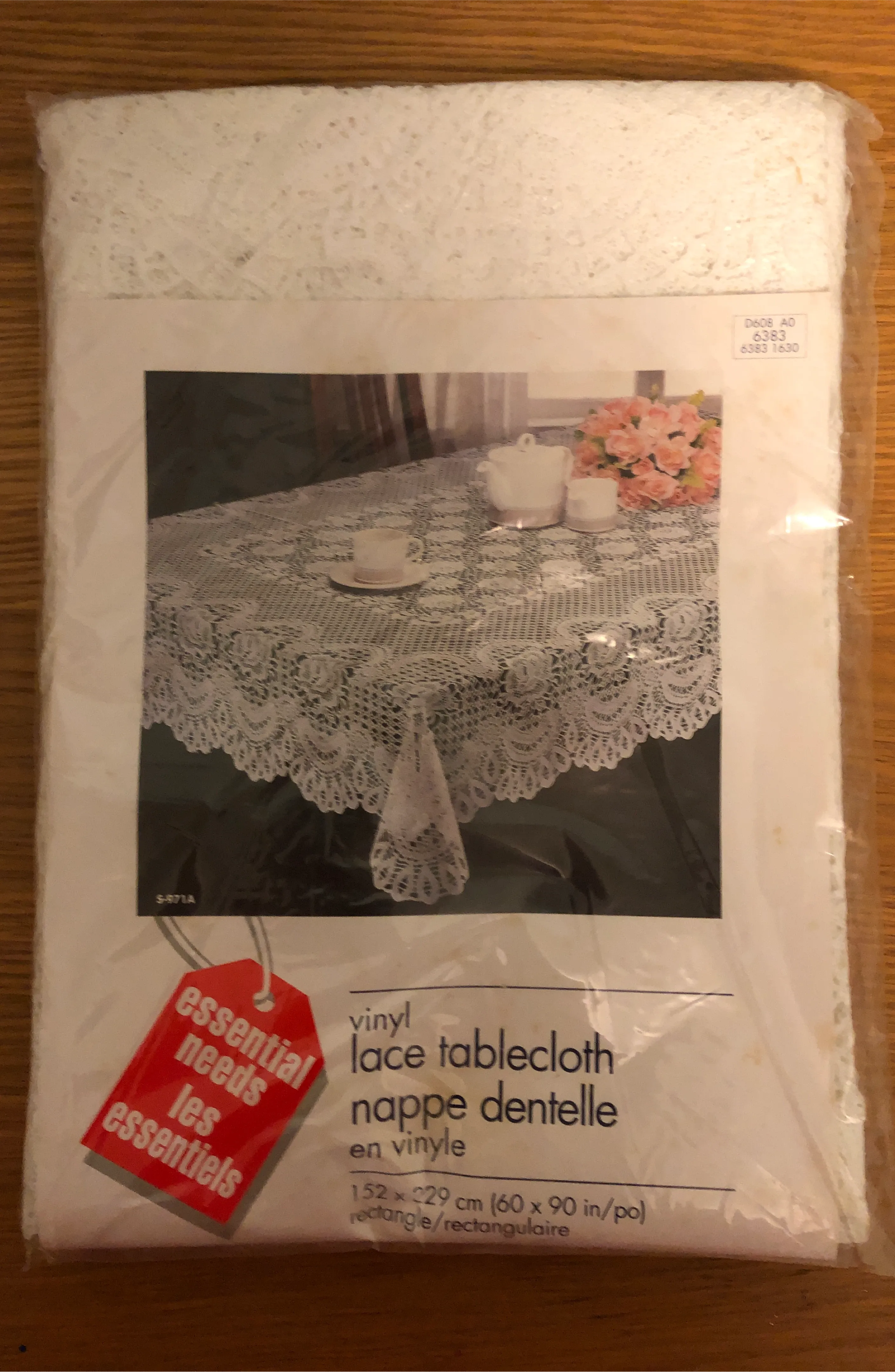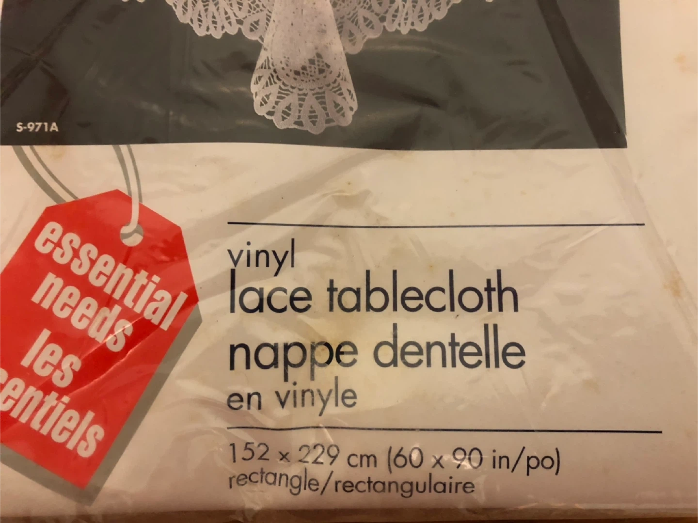 Selling a brand new, still-in-packaging, Essential Needs vinyl lace tablecloth! It measures 152 x 229 cm (60 x 90 inches). It's 100% vinyl and can be easily cleaned with a damp cloth. Perfect for adding a touch of elegance to your dining table!