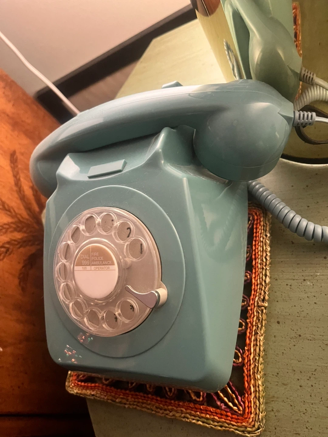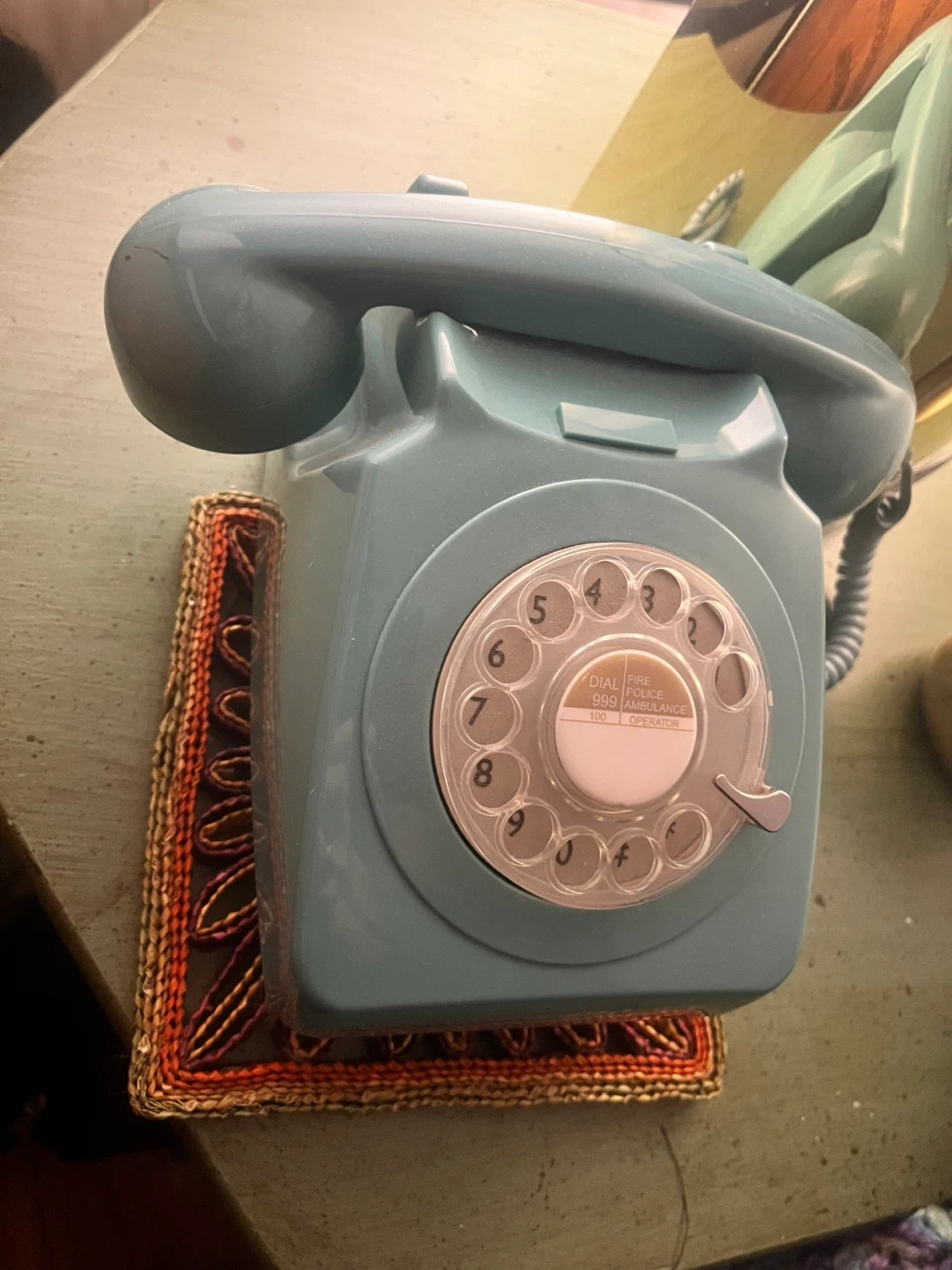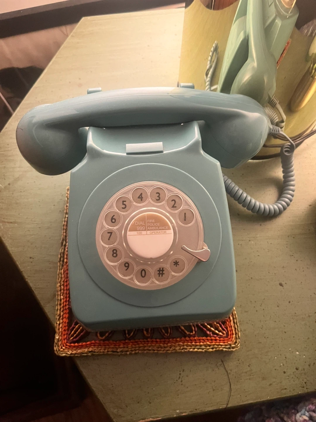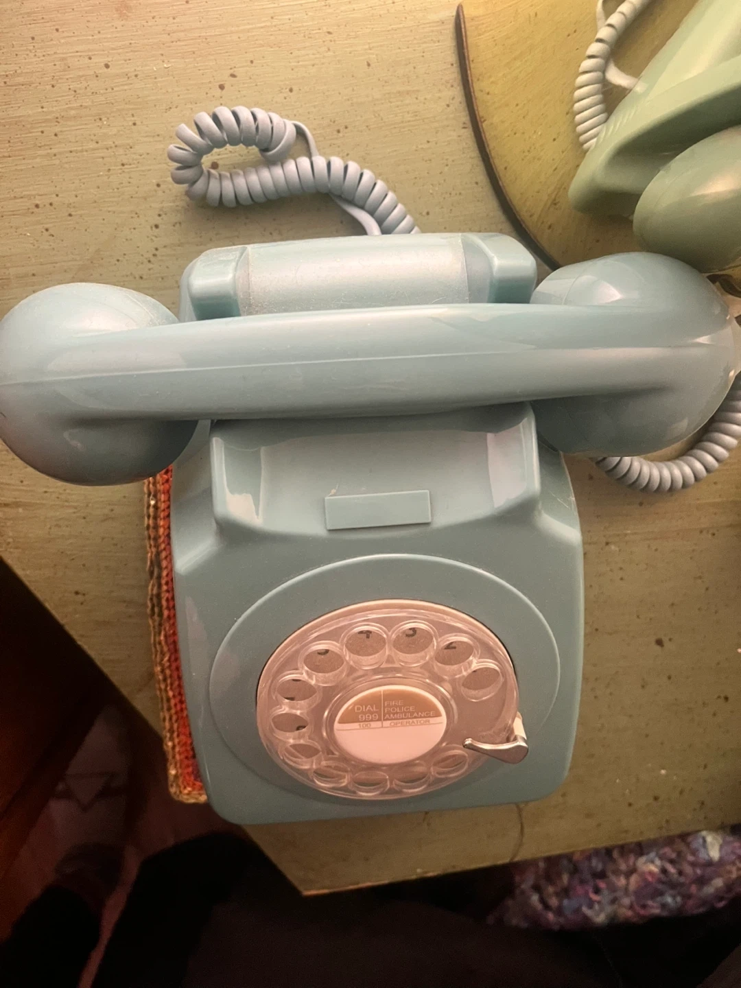 Selling a vintage reproduction rotary phone in a charming light blue color. It's a classic piece that would add a retro touch to any home. The phone features a traditional rotary dial. Perfect for collectors or anyone who appreciates vintage decor! No cord included.
