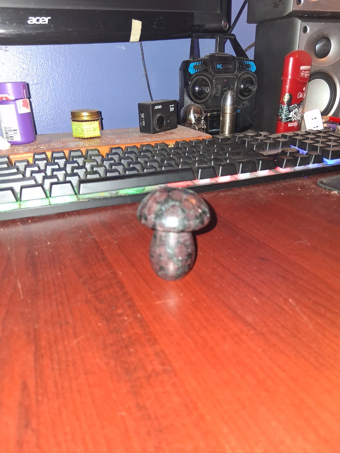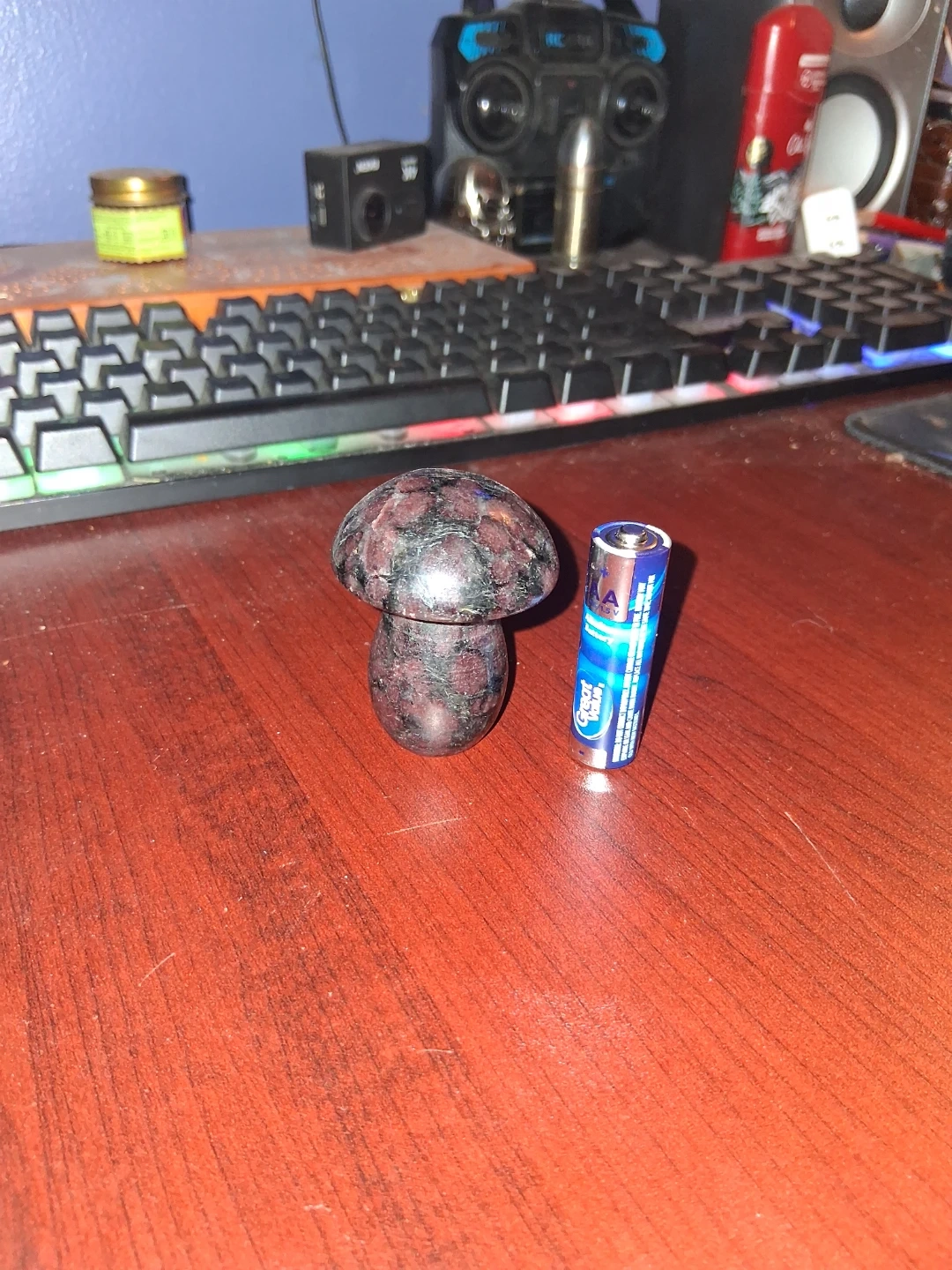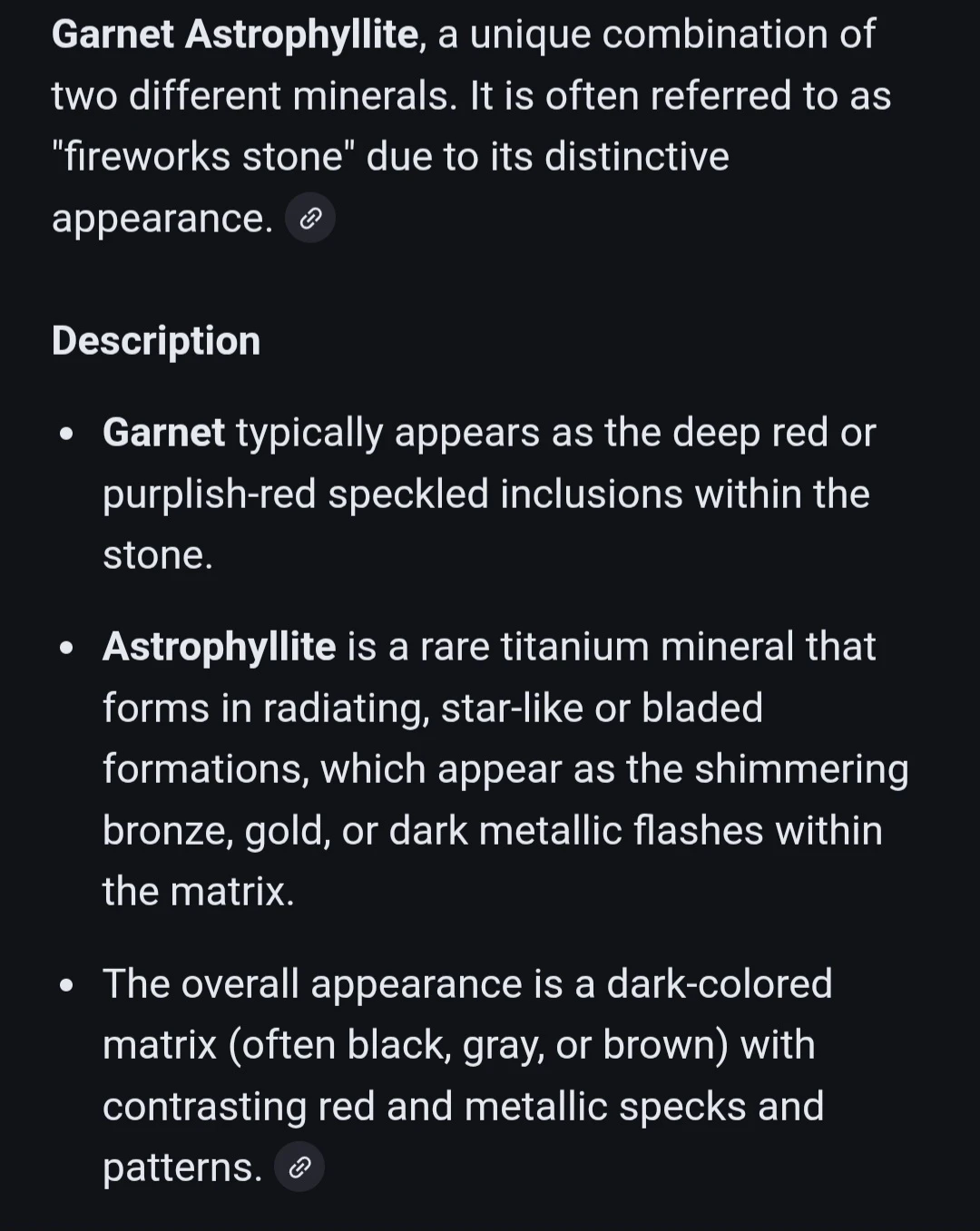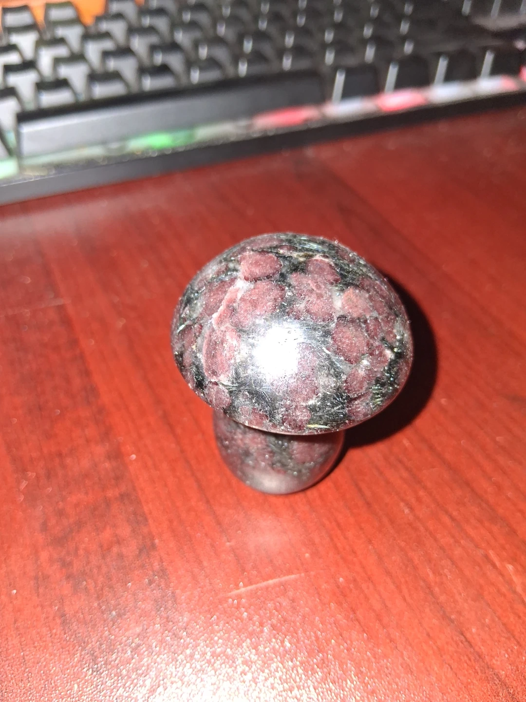Here's a unique Garnet Astrophyllite mushroom figurine! It's a combination of two different minerals. Garnet typically appears as the deep red or purplish-red speckled inclusions within the stone. Astrophyllite is a rare titanium mineral that forms in radiating, star-like or bladed formations with shimmering bronze, gold, or dark metallic flashes within the matrix. The overall appearance is a dark-colored matrix (often black, gray, or brown) with contrasting red and metallic specks and patterns