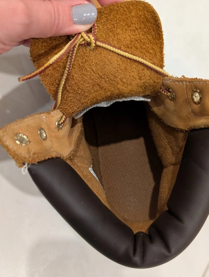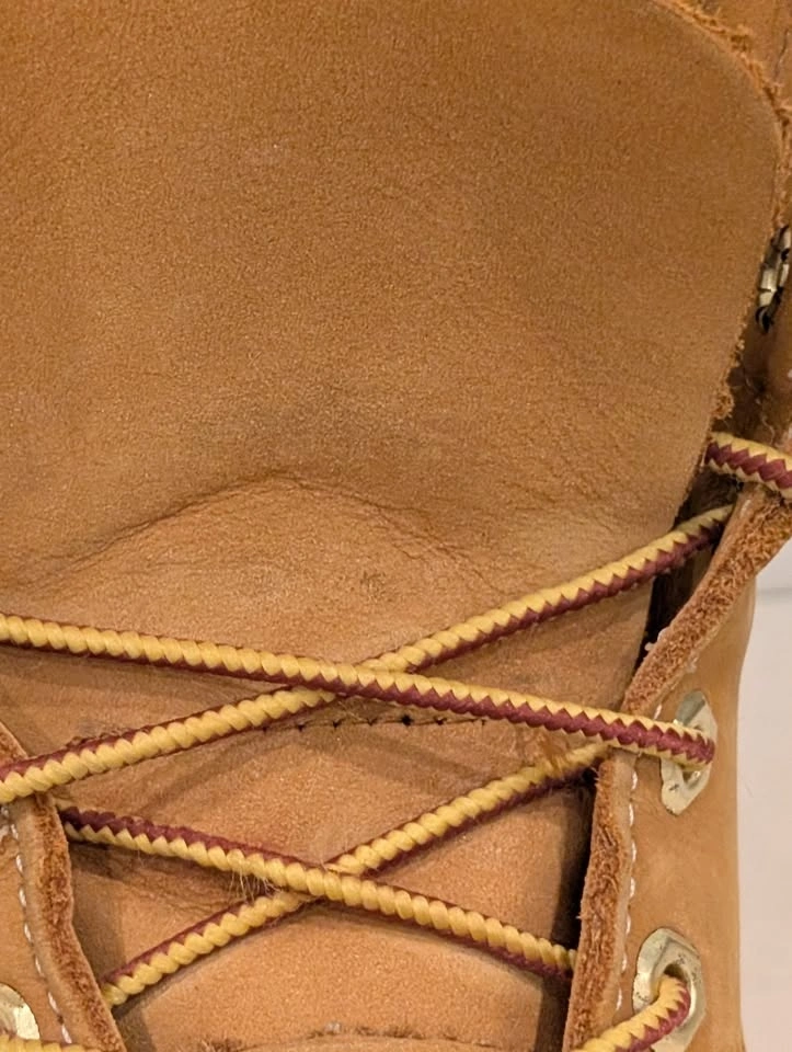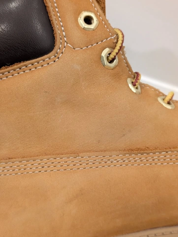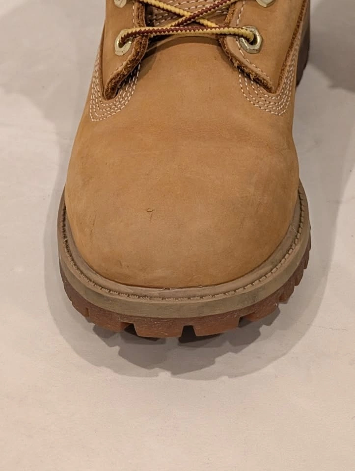 There is a good amount of wear to the shoe from use, including scuff marks and a small cut to the right toe on the top.