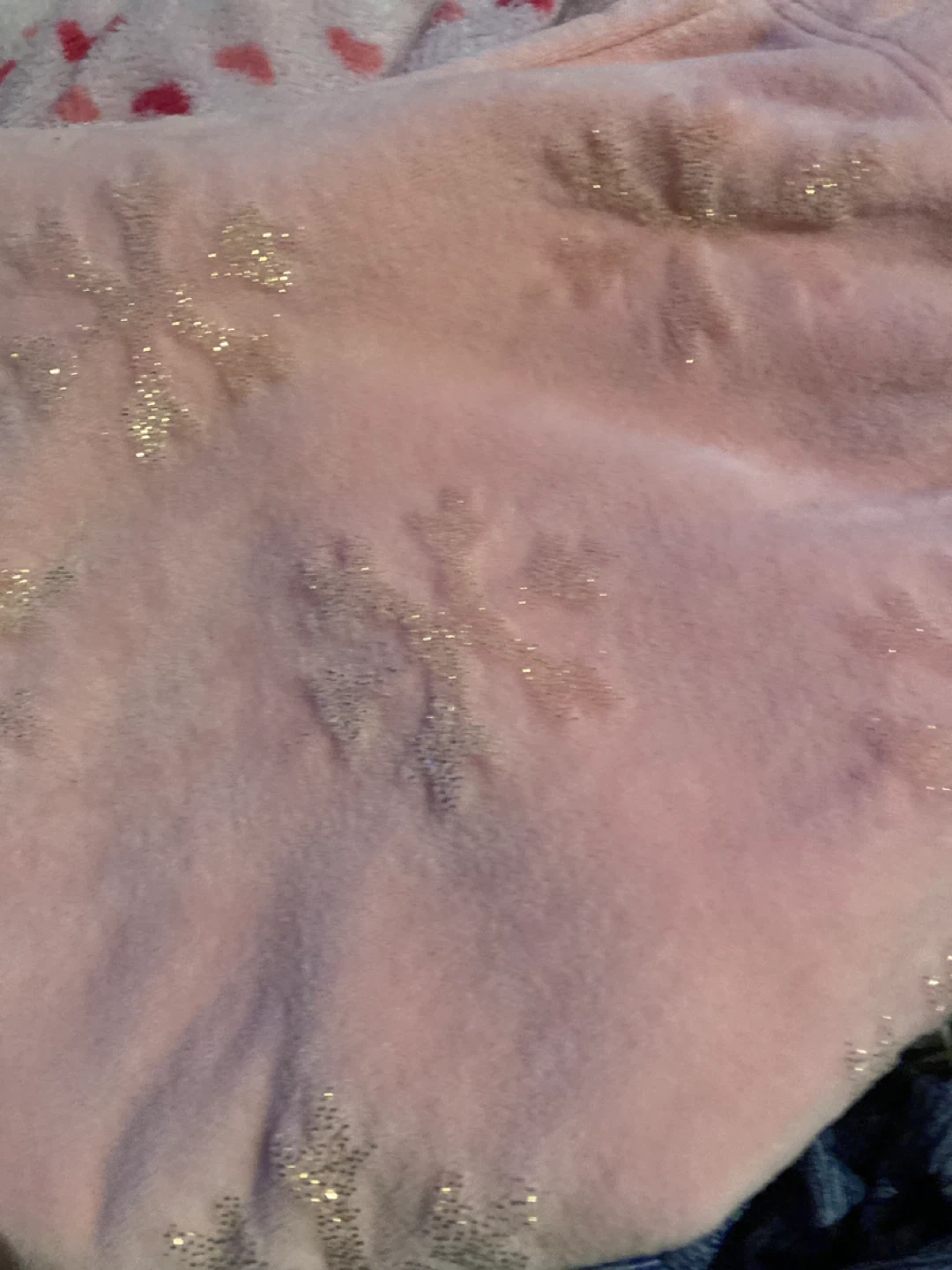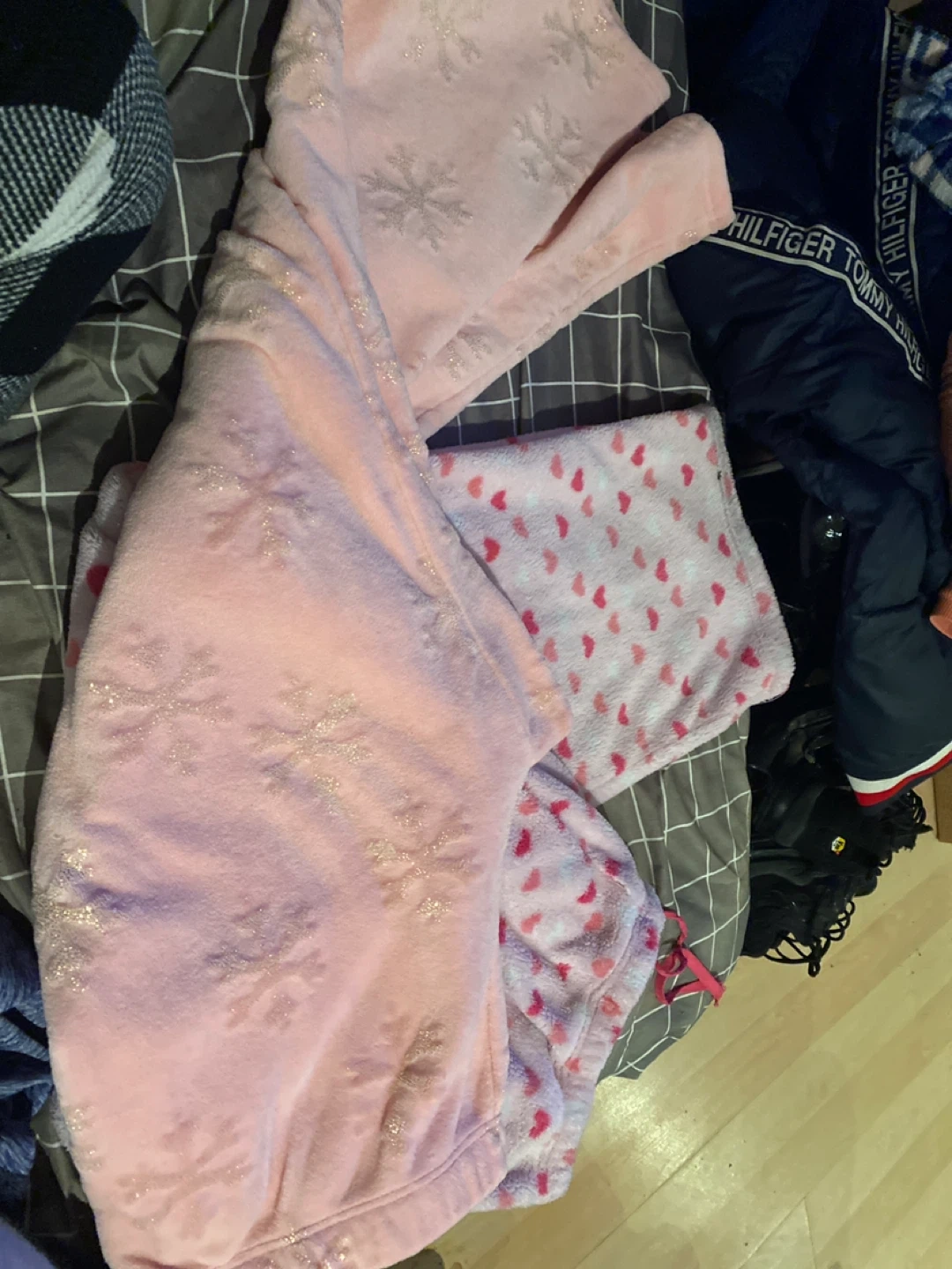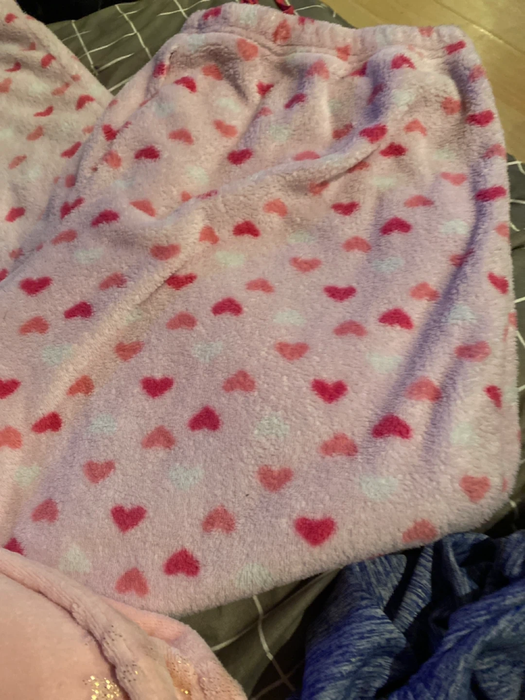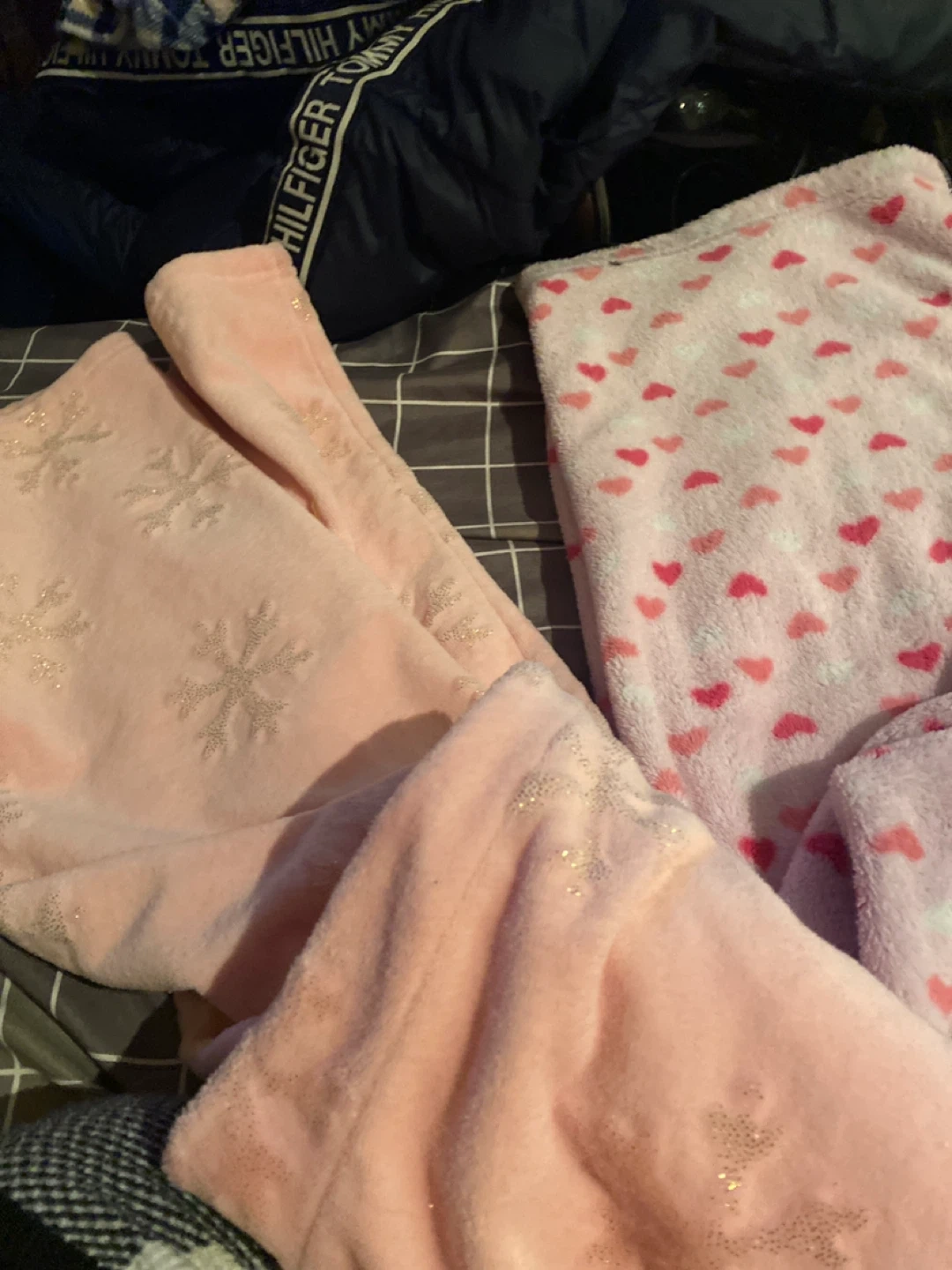 Super comfy pink lounge pants with a heart pattern on one side and snowflakes on the other! They're in great condition and perfect for cozy nights in both size large and clean condition