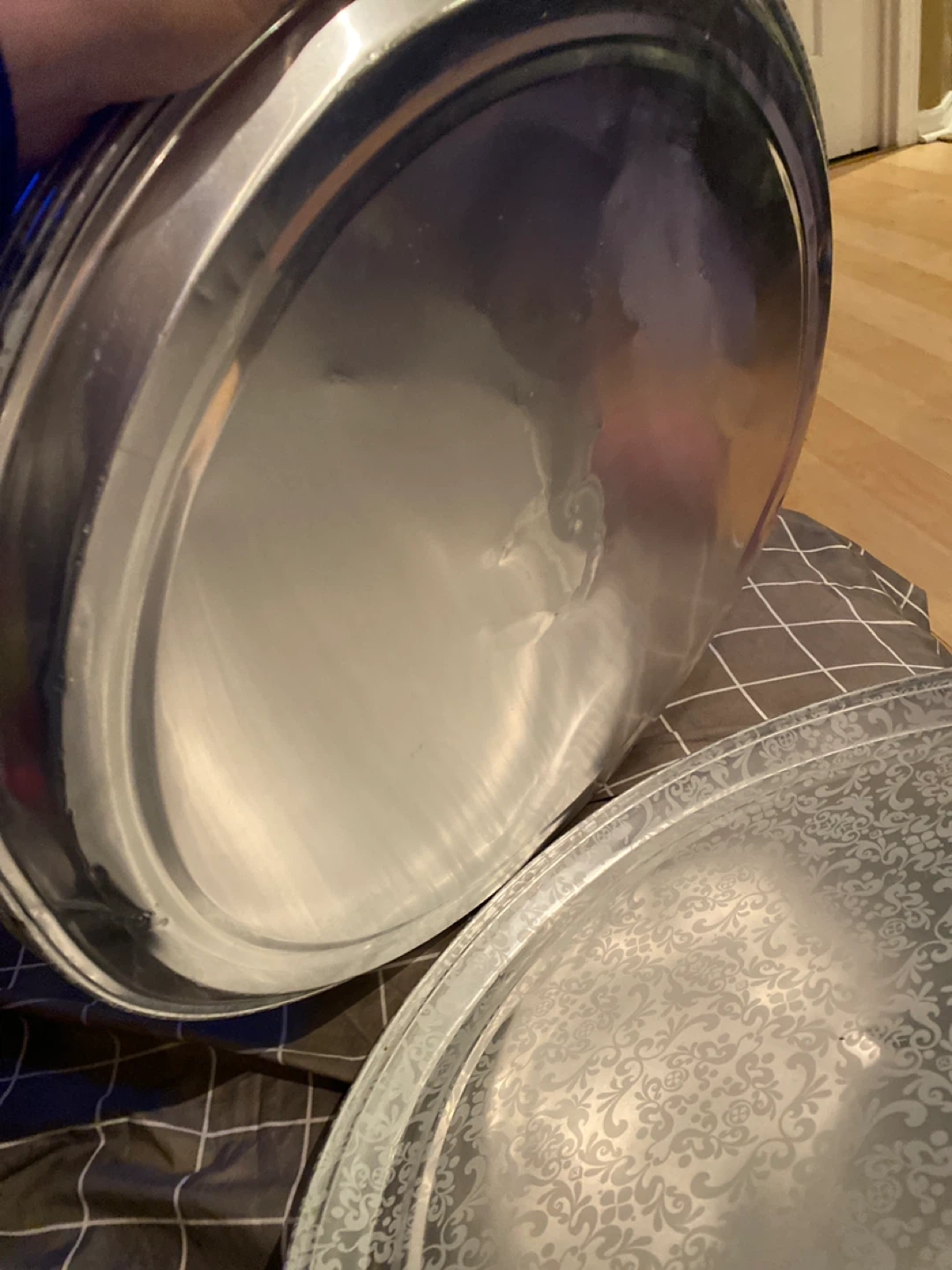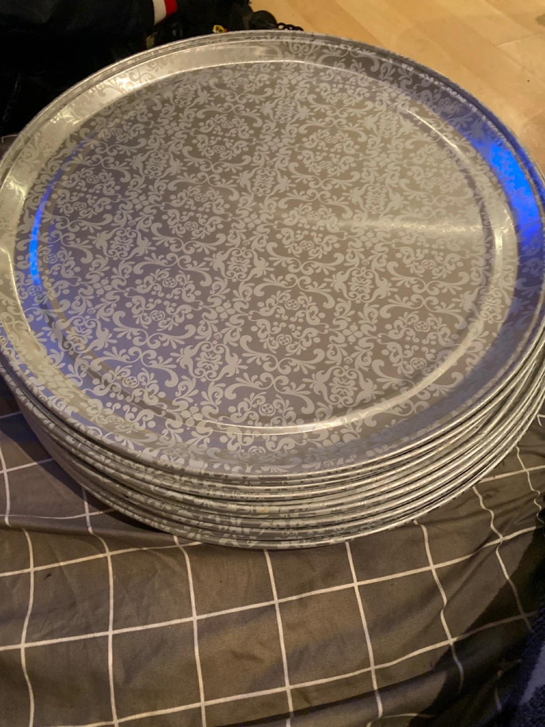 Selling a set of 10 pizza pans with a pretty silver pattern! They're in good condition and ready for your next pizza night. Perfect for baking or serving up your favourite homemade pizzas