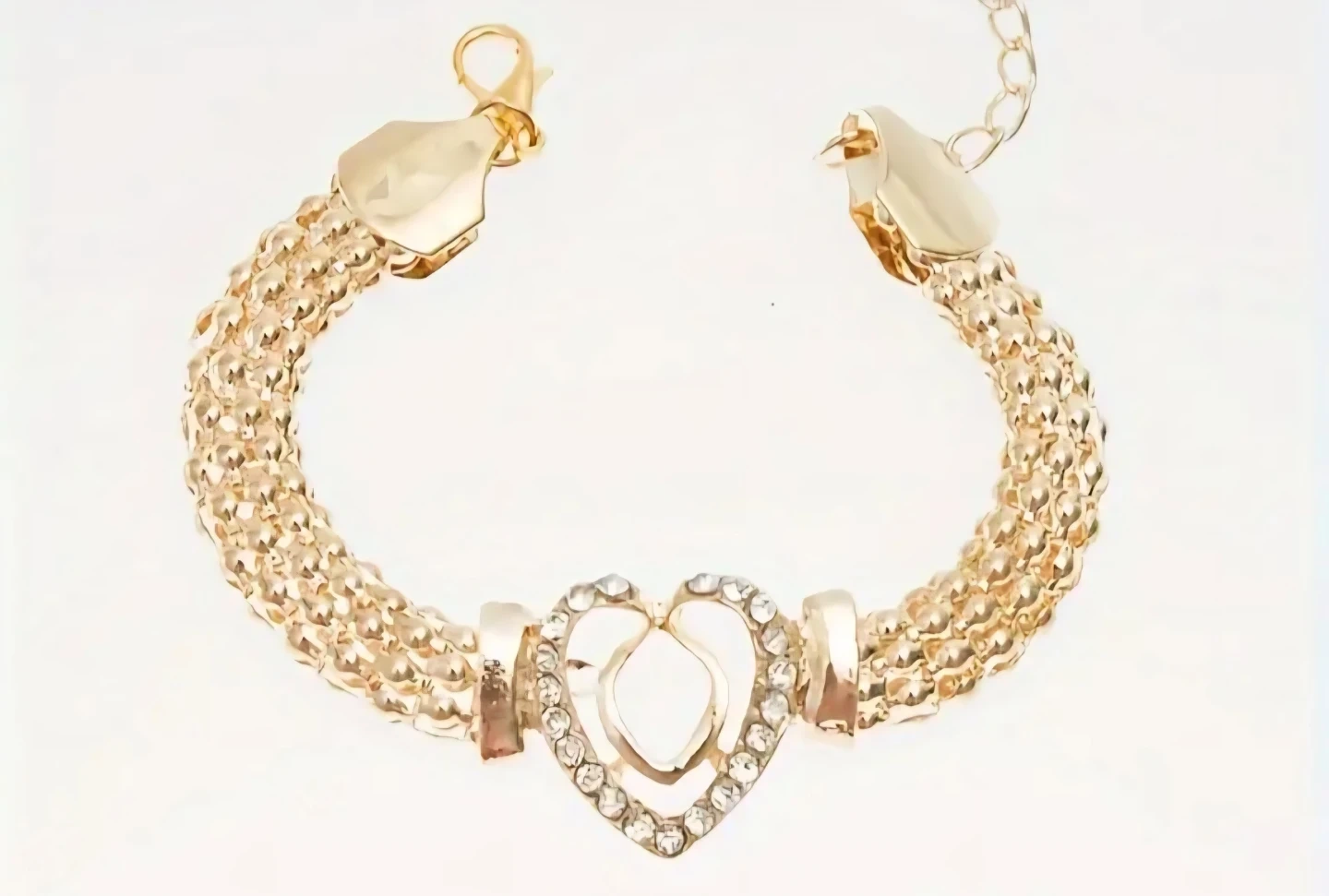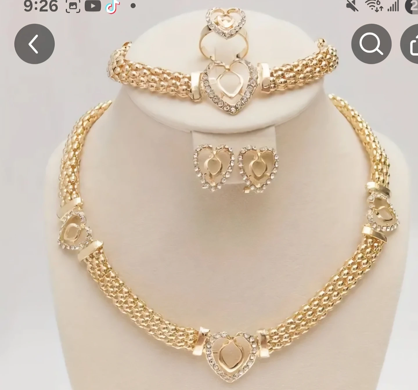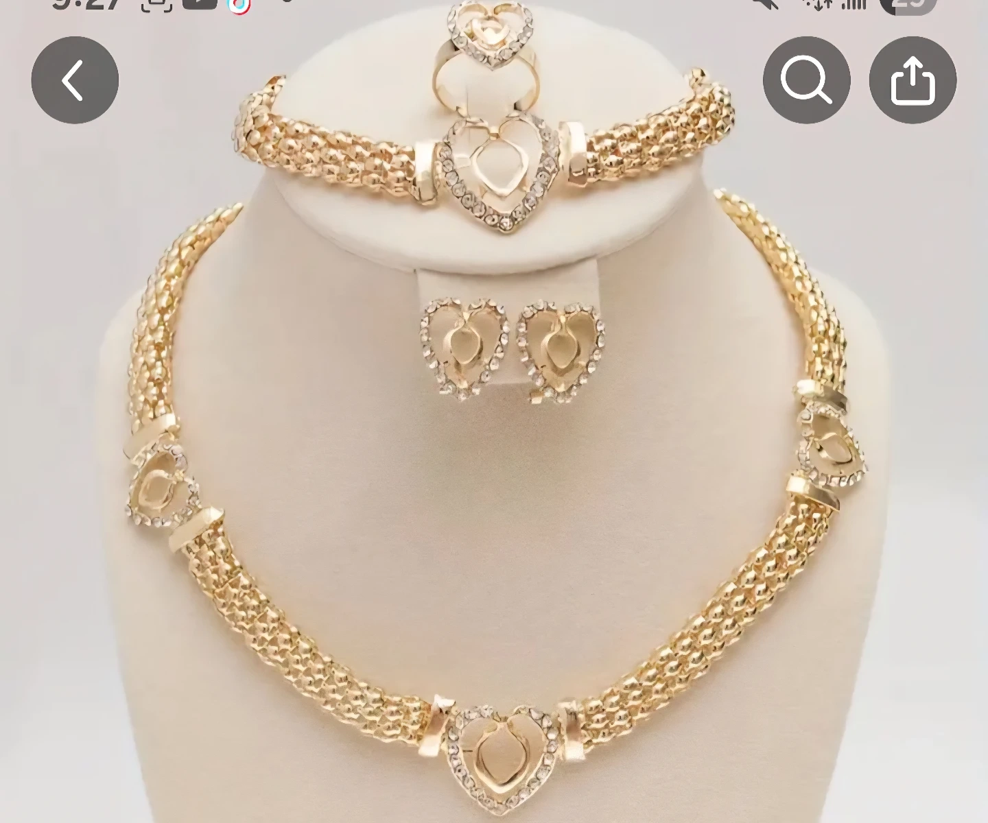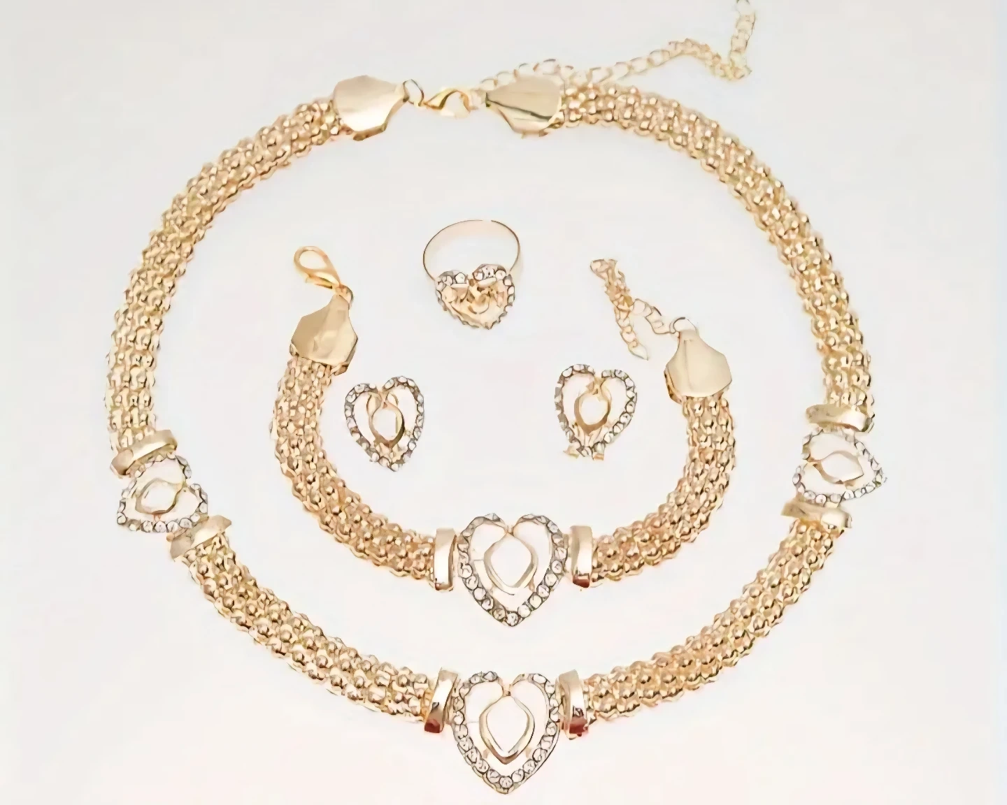 Selling a beautiful Gold Plated jewelry set! It includes a necklace, bracelet, ring, and earrings, all featuring a heart design. Perfect for adding a touch of sparkle to any outfit