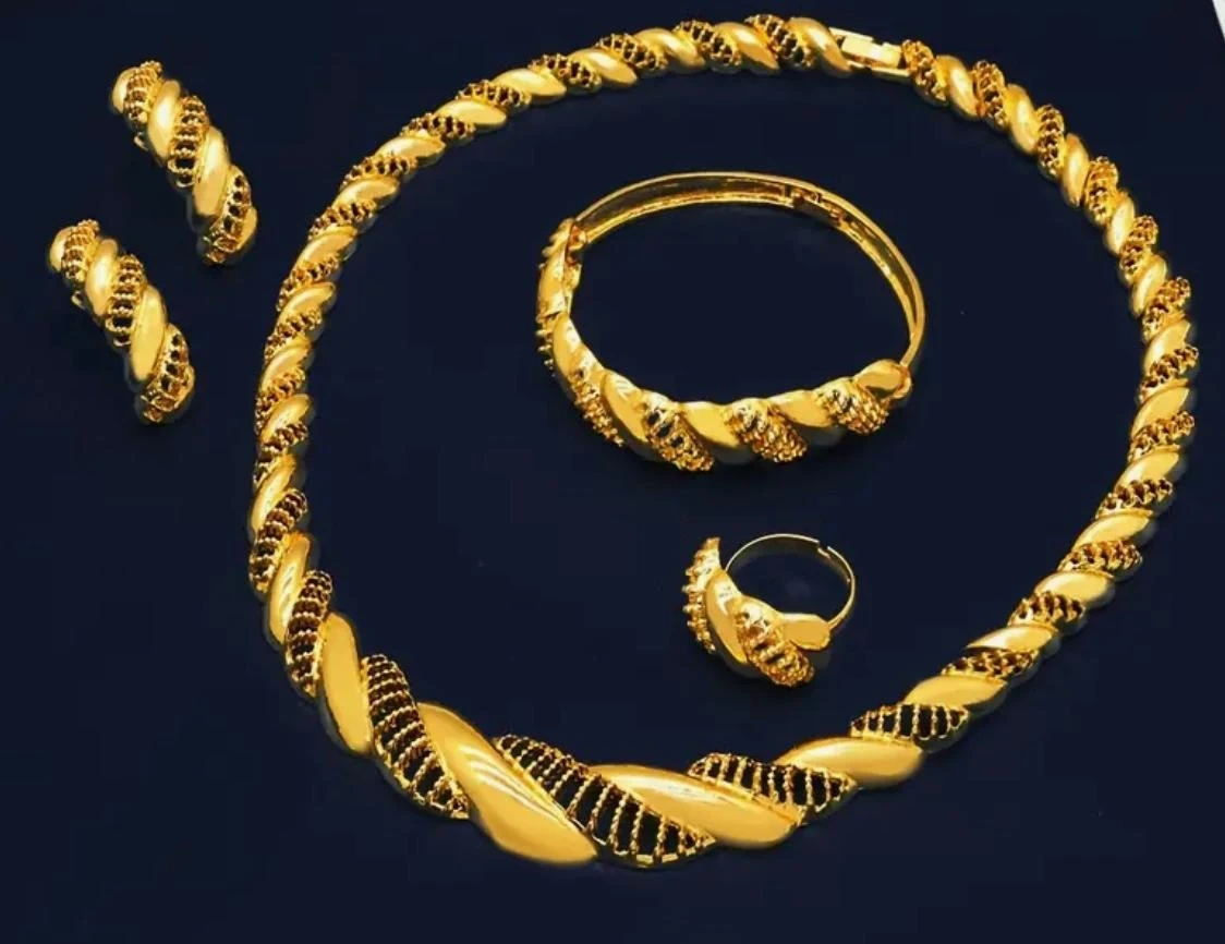 Selling a beautiful gold-toned jewellery set, including a necklace, bracelet, ring, and earrings! This set is perfect for adding a touch of elegance to any outfit
