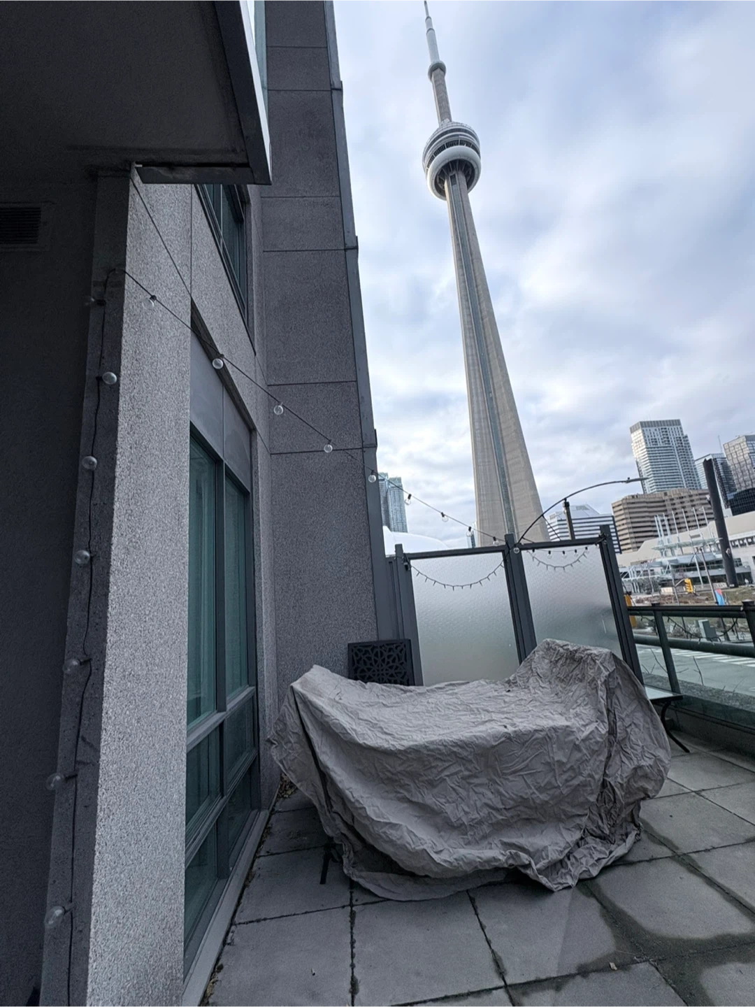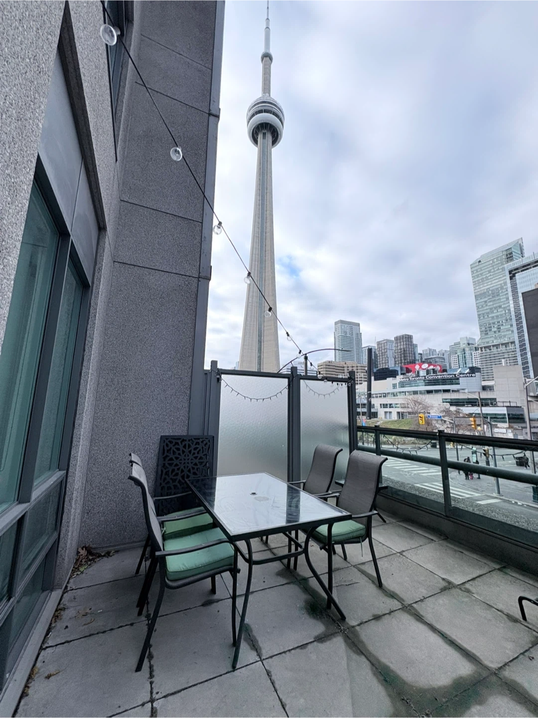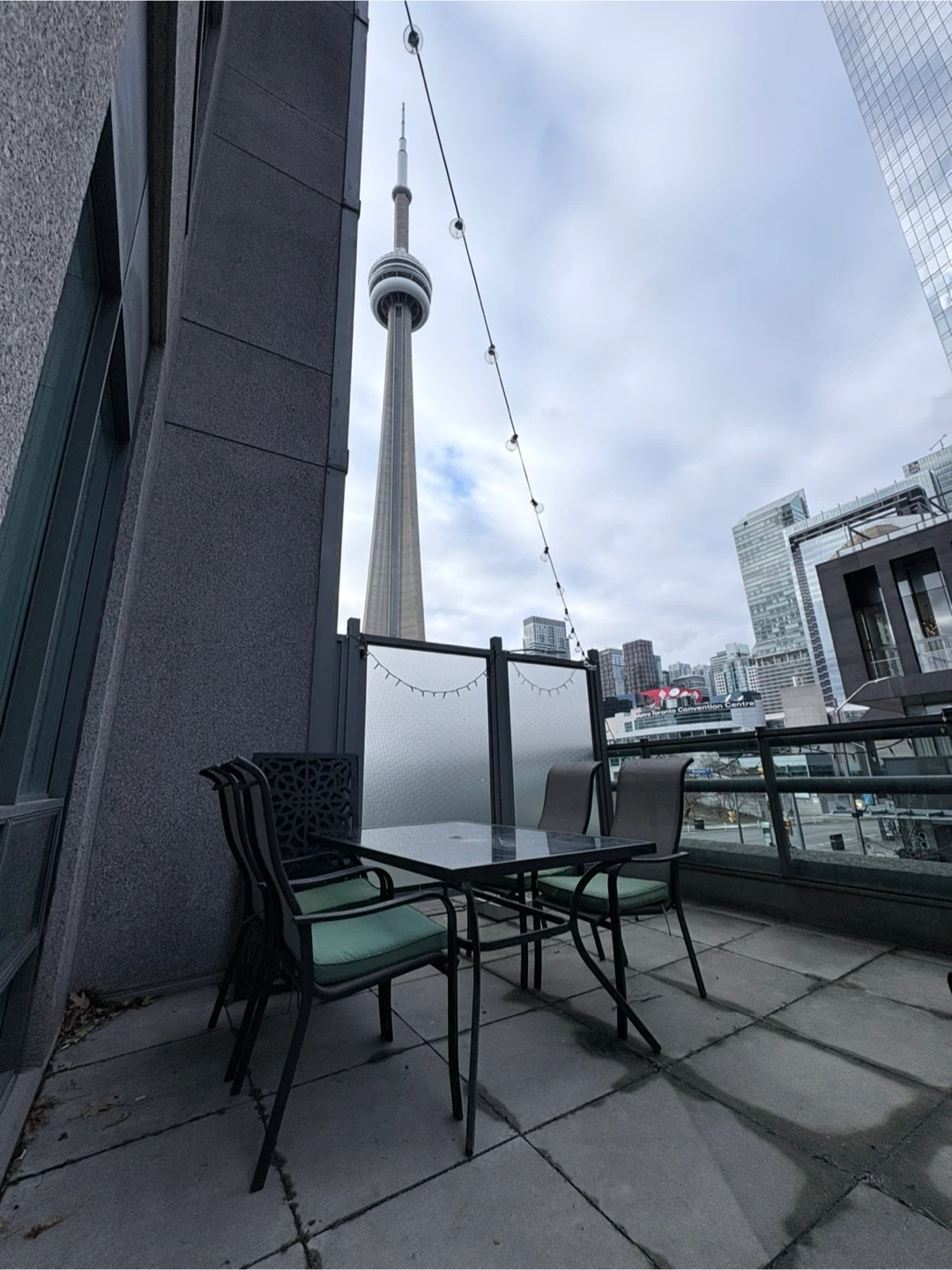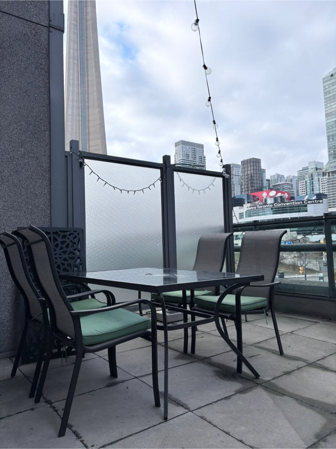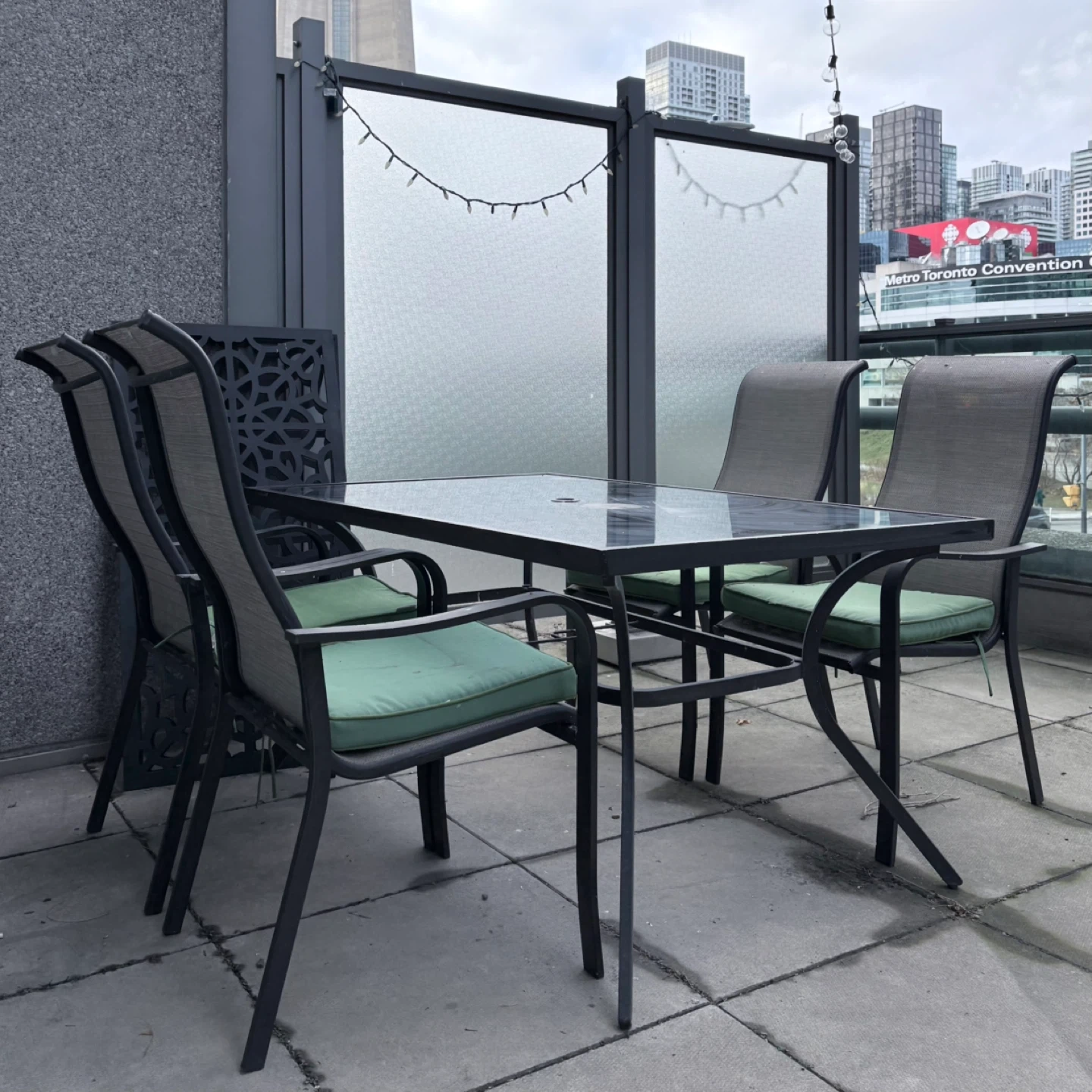 Selling a patio table with four chairs! The set has a glass table top and comfortable washable cushions. Perfect for enjoying the outdoors on your balcony or patio