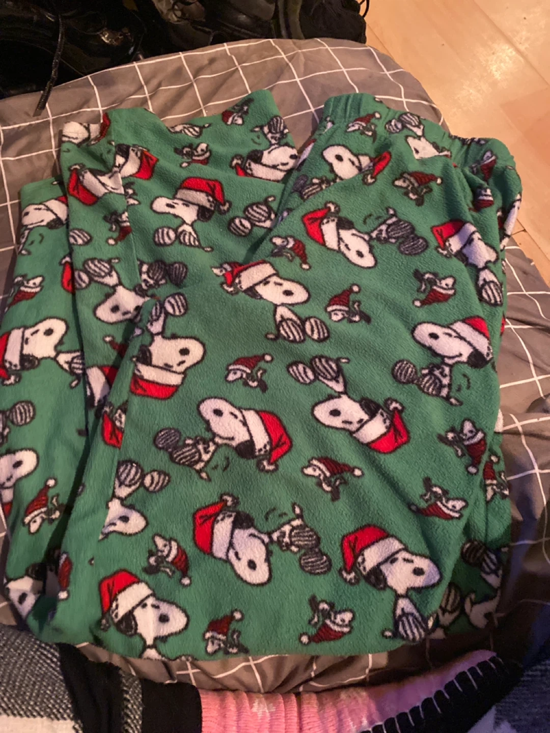Cozy up with these fun Peanuts pajama pants! They feature an all-over print of Snoopy wearing a Santa hat on a green fleece material. Perfect for lounging around the house during the holidays or any time of year! Size large and fun to wear
