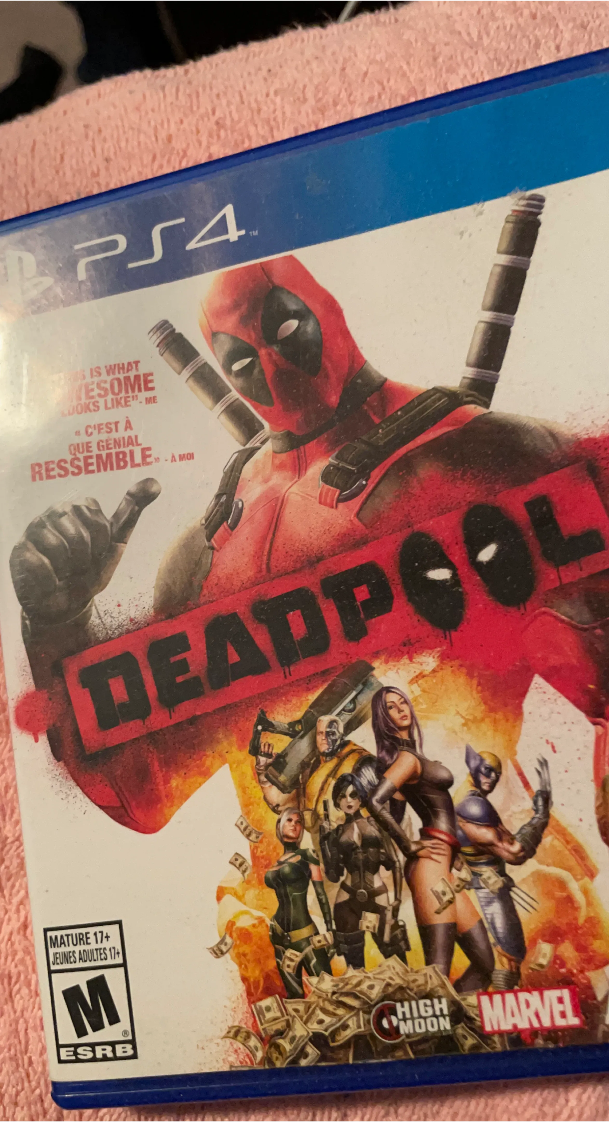 Selling a used copy of Deadpool for the PS4. It's rated M for Mature 17+ by the ESRB. The cover features Deadpool and other Marvel characters. If you're a fan of the comics, this is a must-have!
