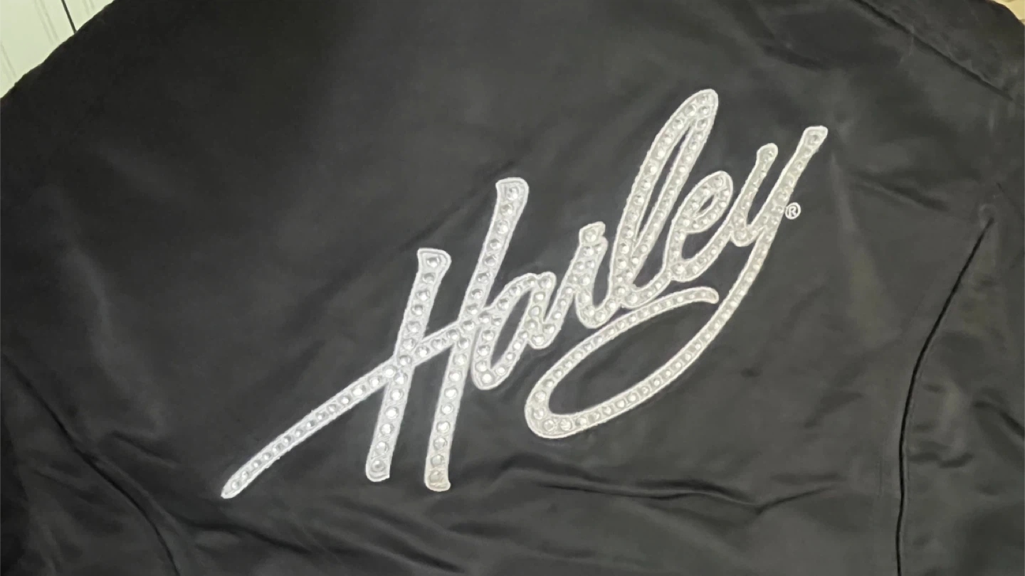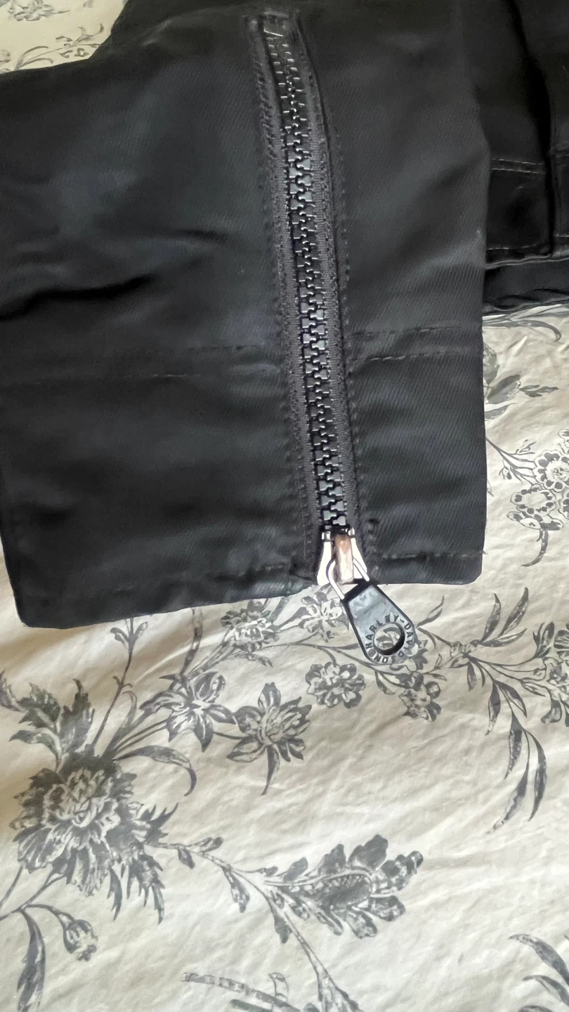 Harley-Davidson black jacket. It's made of 53% polyester and 47% nylon. The lining is 100% polyester. Perfect for any Harley enthusiast!