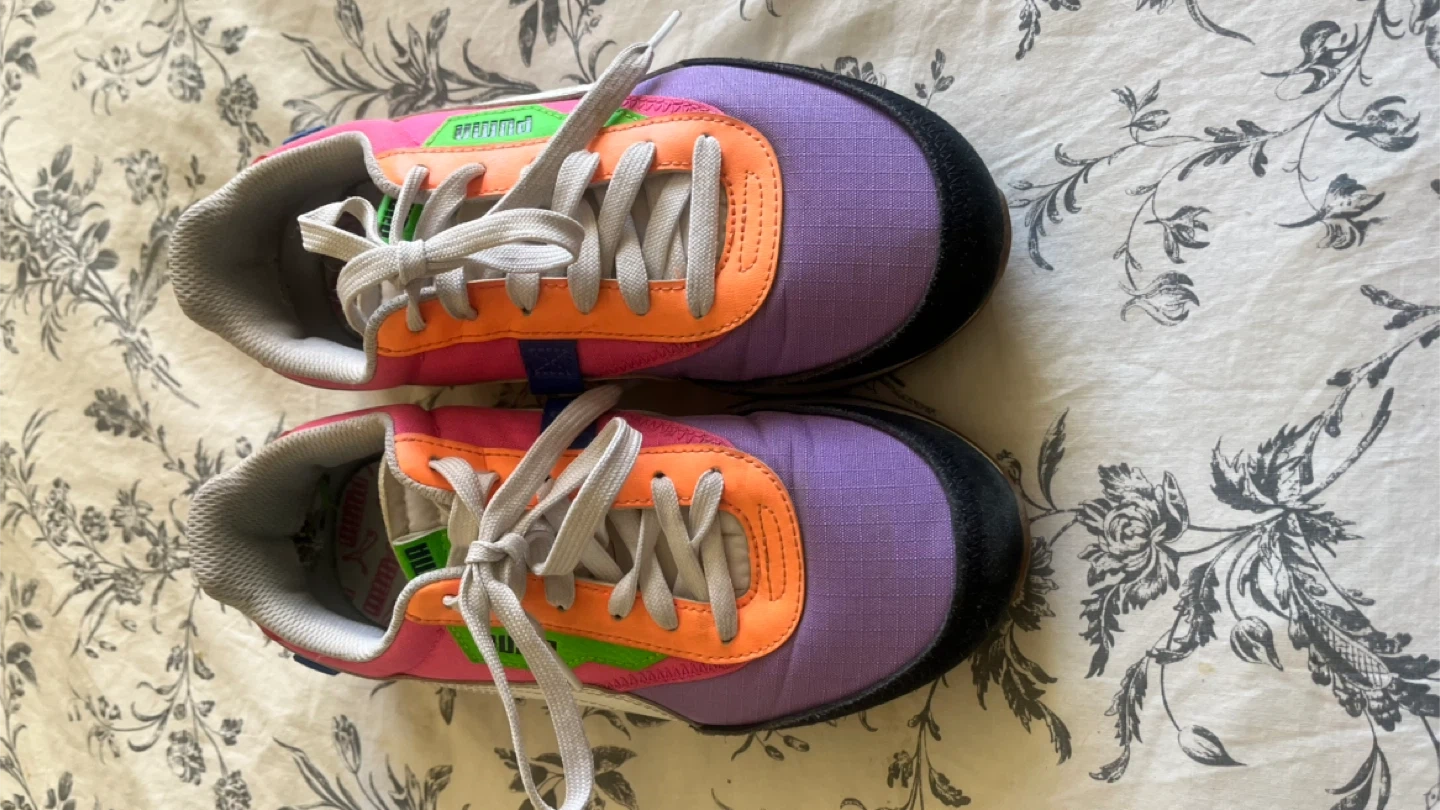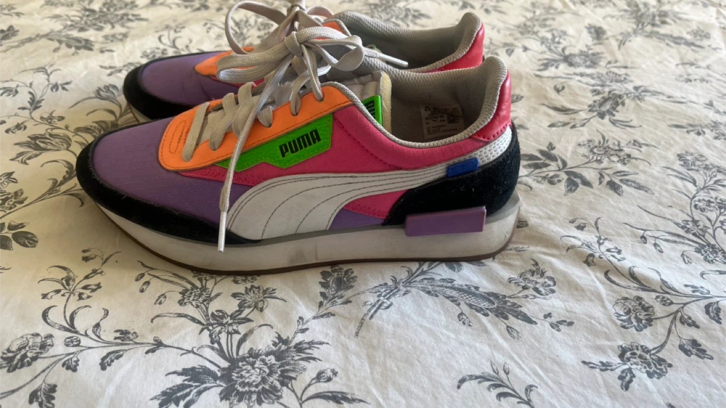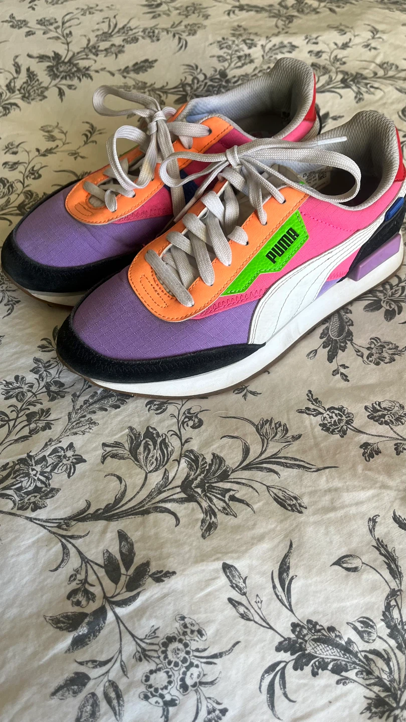Selling a pair of Puma Future Rider sneakers! They feature a fun and colourful design with shades of purple, pink, orange, and black. Perfect for adding a pop of colour to your outfit!