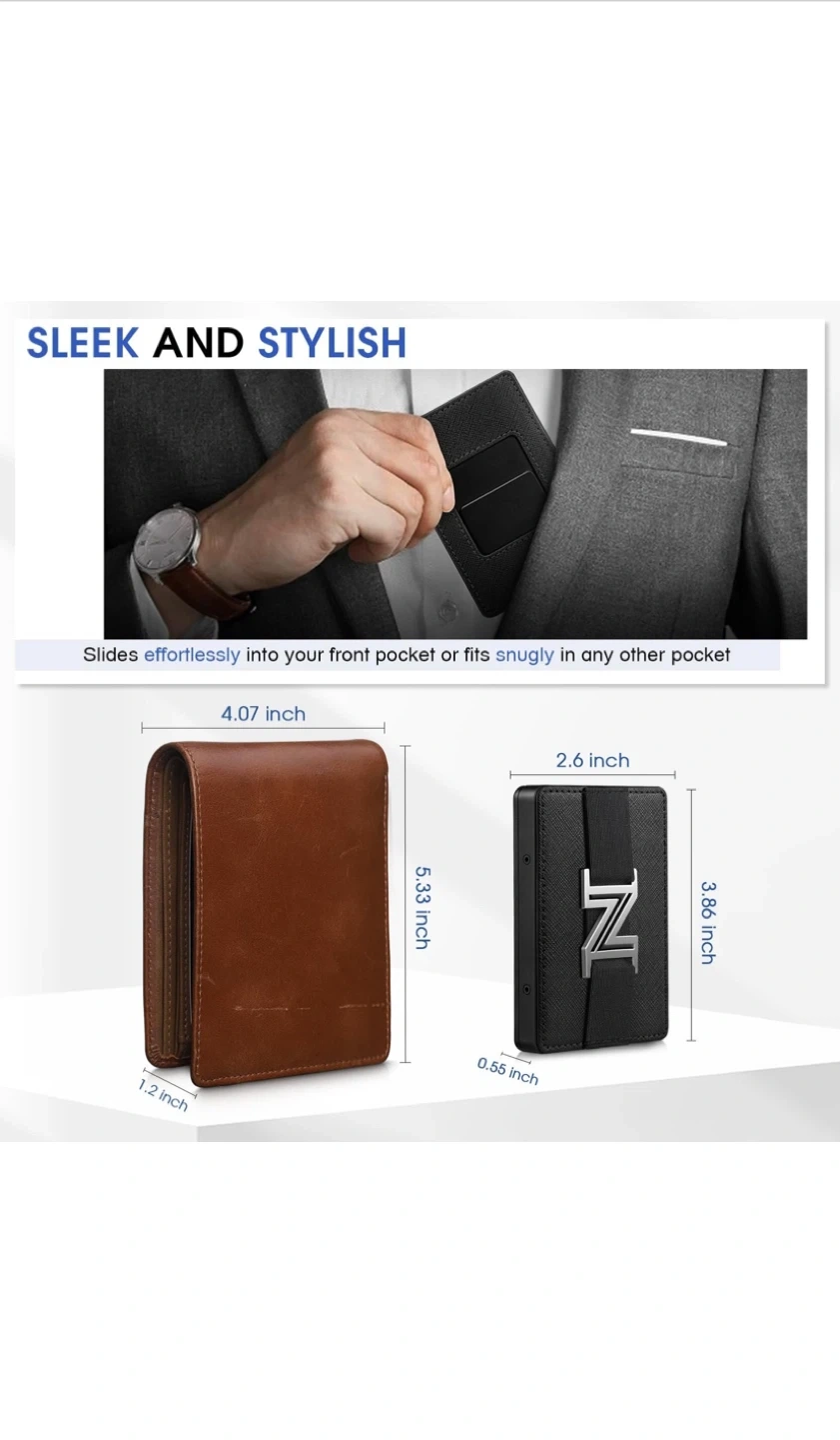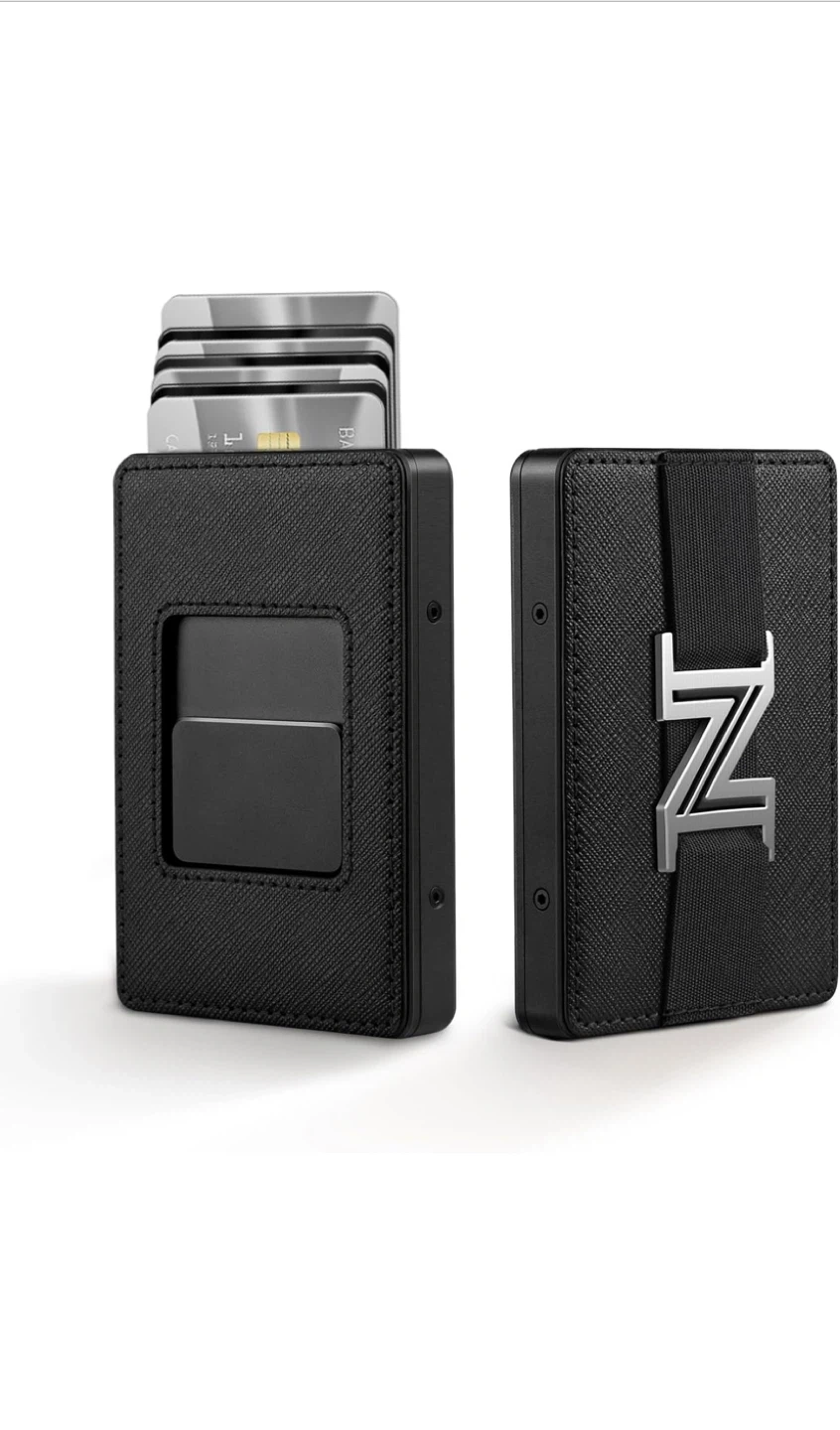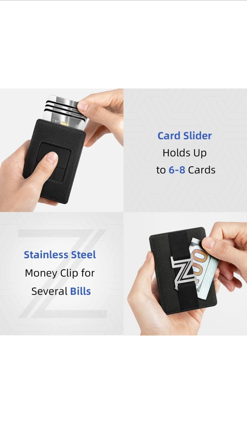 This Zavelio card holder wallet is in great condition and comes with its original box! It features a card slider that can hold up to 6-8 cards and a stainless steel money clip for bills. It also has RFID blocking to safeguard your personal data