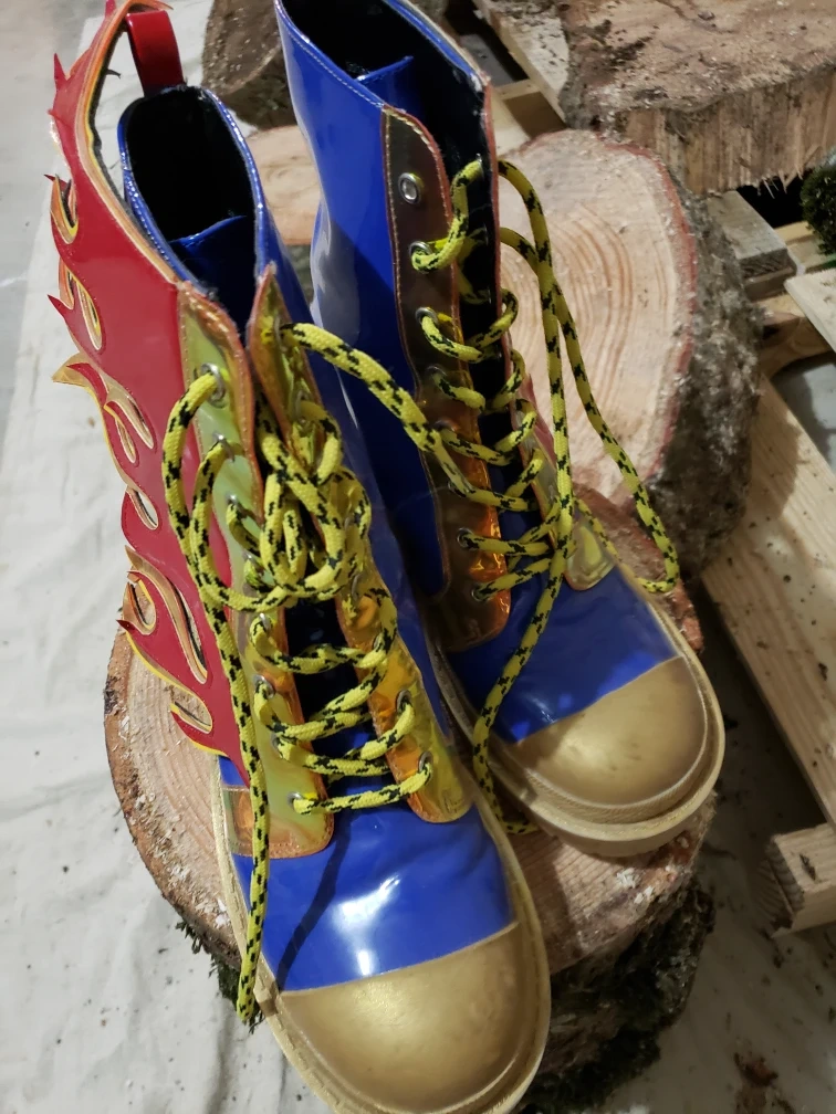 These are some really unique boots with a flame design! great for outdoor dance party. They're a size 9 and have a cool colour scheme with red, blue, and gold accents. They've got a lug sole too!