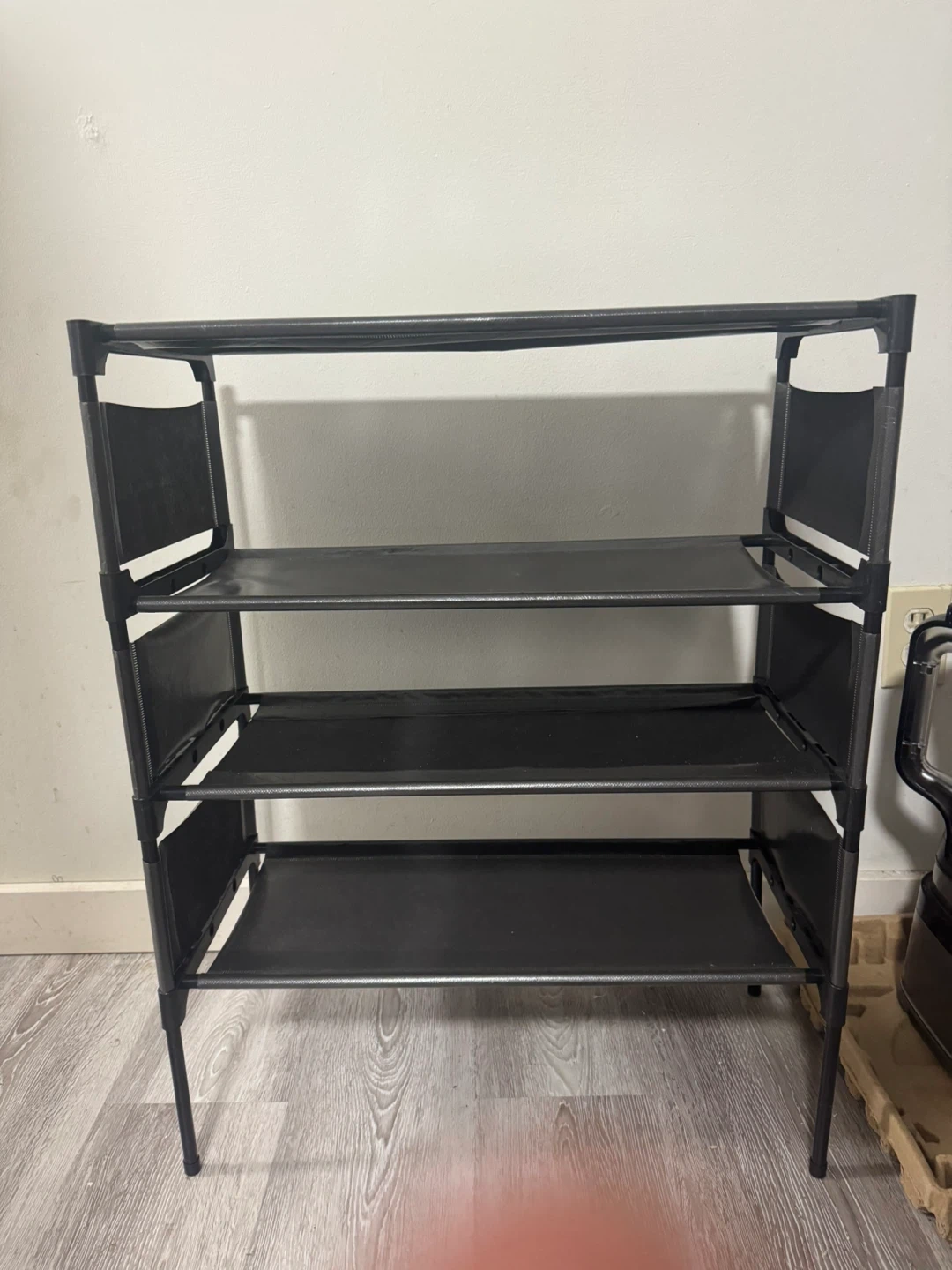 Selling a handy black 4-tier shoe rack! It's in great shape and ready to help organize your footwear collection. Perfect for keeping your entryway tidy or adding extra storage to your closet