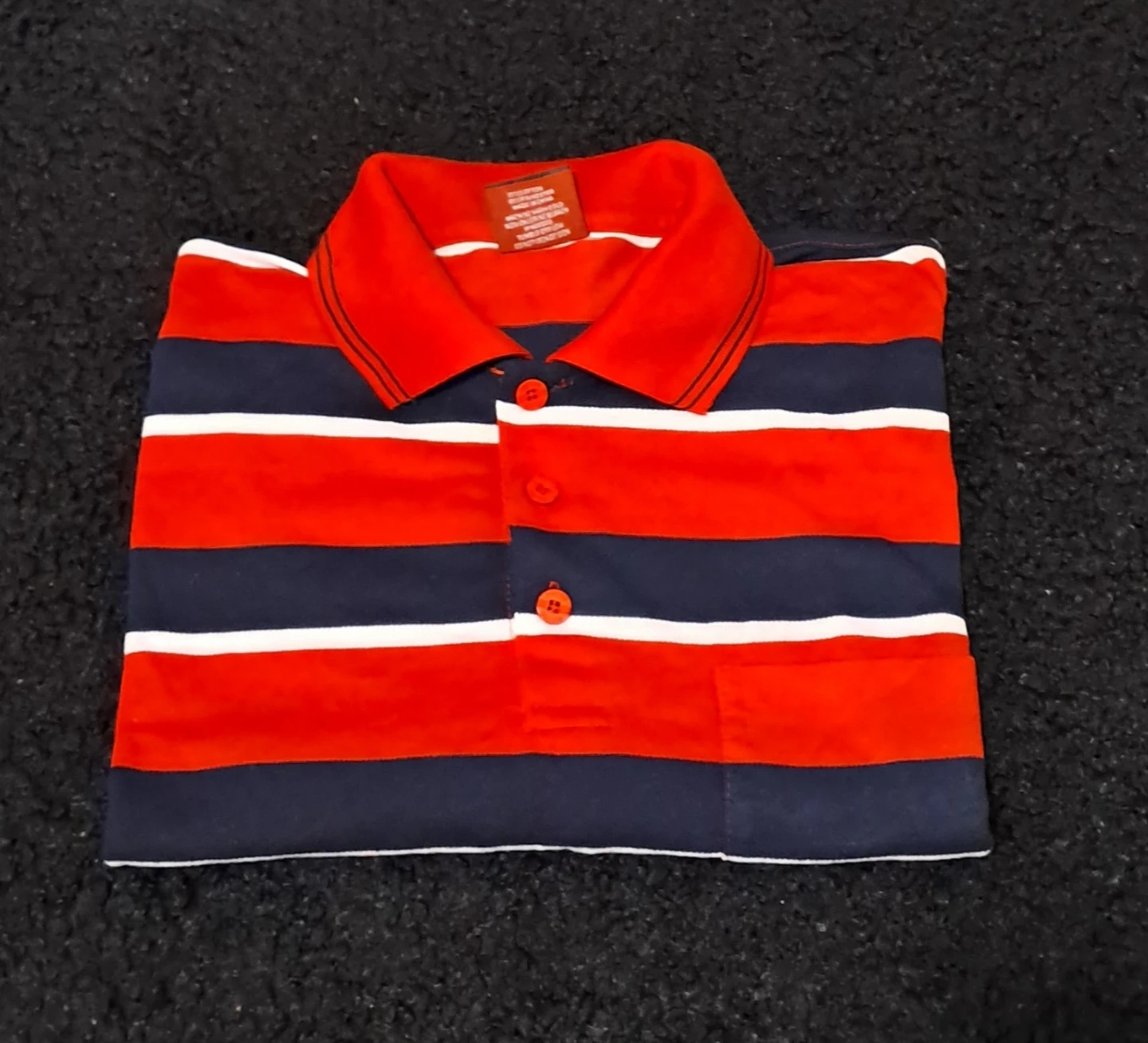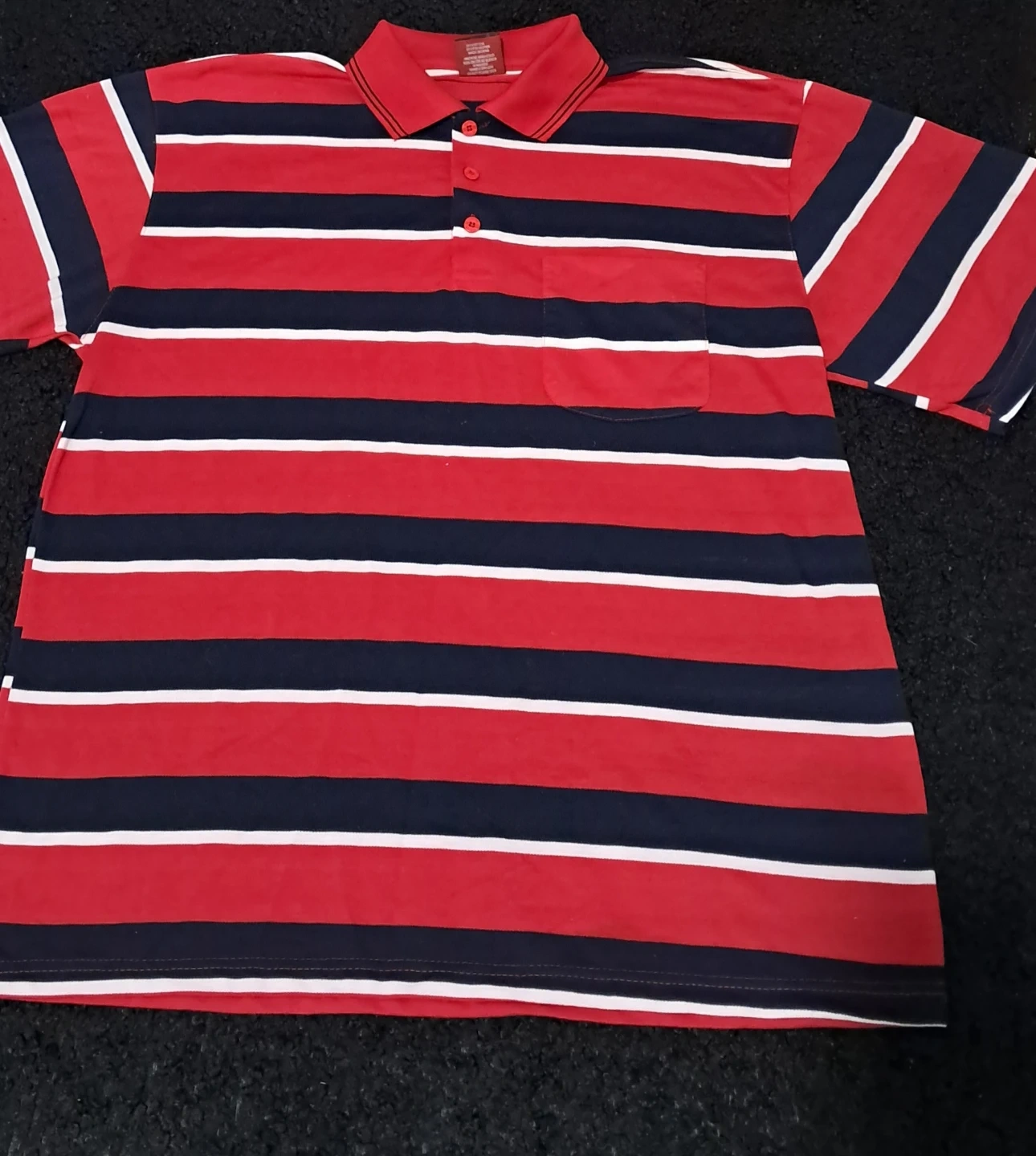 Here's a striped polo shirt in red, white, and navy. It features a classic polo collar and a chest pocket. Perfect for a casual look!