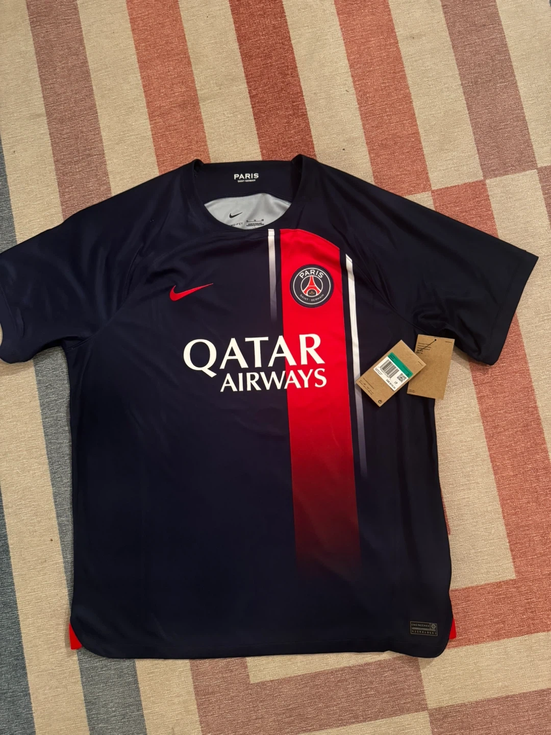 I'm selling a brand new Nike Paris Saint-Germain jersey in size XL! It's a men's home jersey, perfect for any fan. The suggested retail price on the tag is CAD $115.00