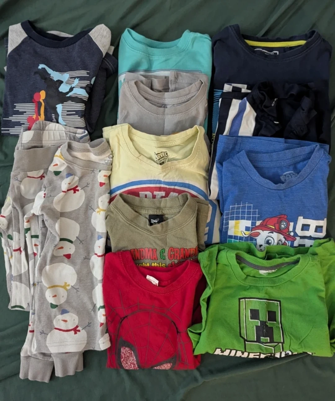 Selling a bundle of boys' graphic t-shirts and a pajama set. There's a variety of colours and designs, including characters like Spiderman, Paw Patrol, and Minecraft. Also includes a snowman themed pajama set. Perfect for a growing kiddo!