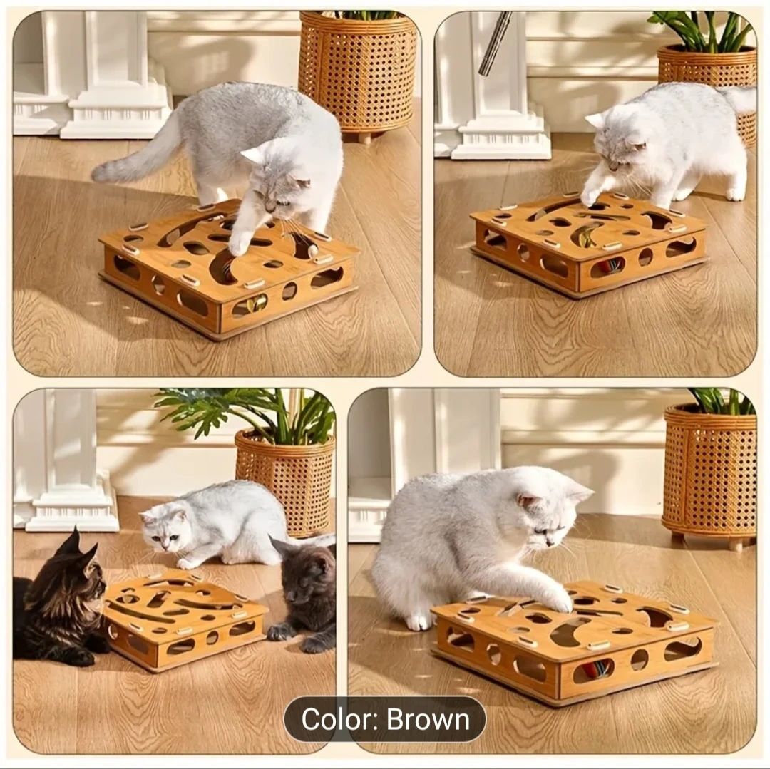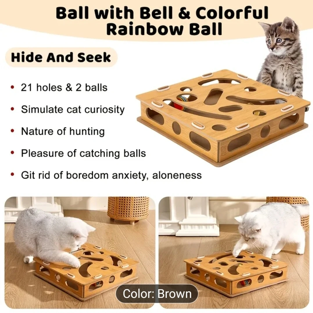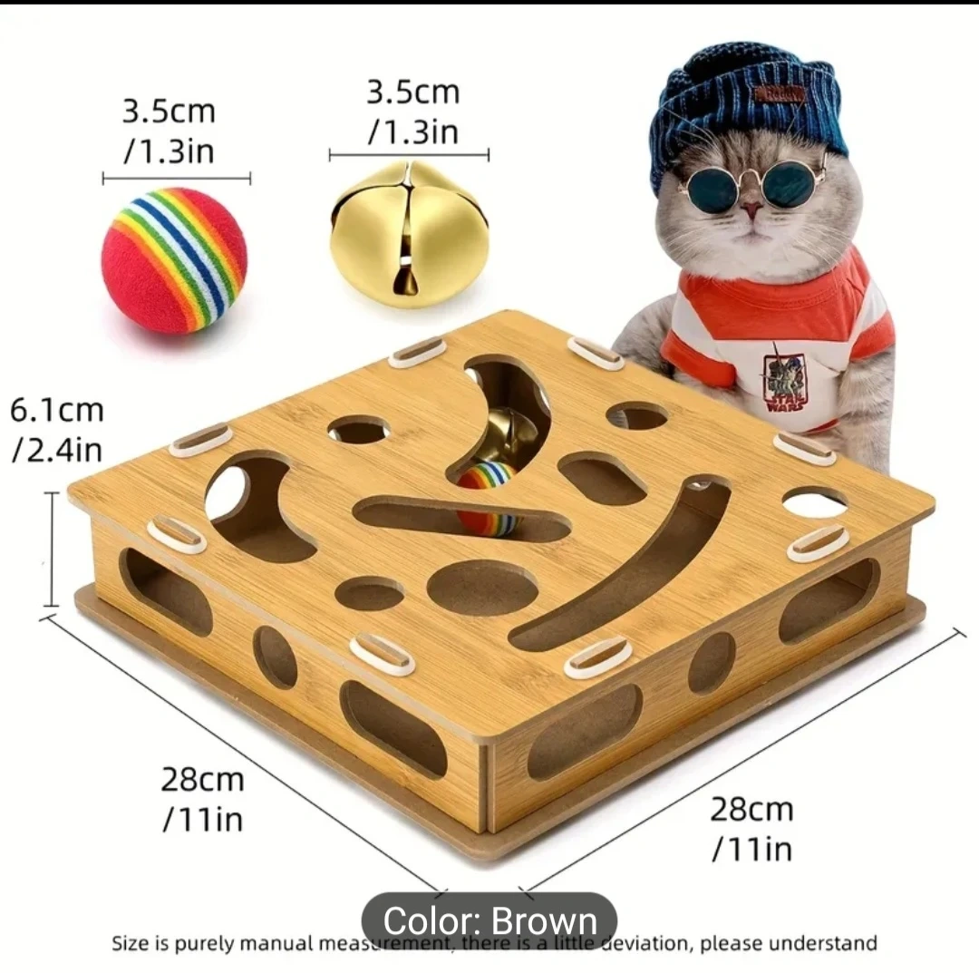Keep your kitty entertained with this interactive wooden cat toy! It features 21 holes and 2 balls to simulate your cat's natural hunting instincts. It's designed to help get rid of boredom, anxiety, and loneliness. This toy is easy to assemble and is made of wood. The toy is brown and measures 11 inches by 11 inches.