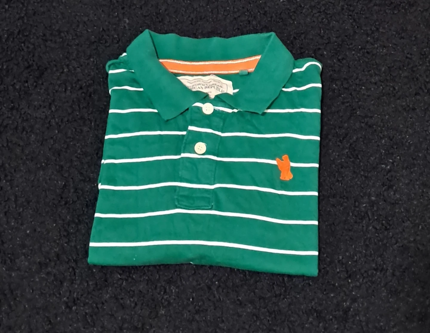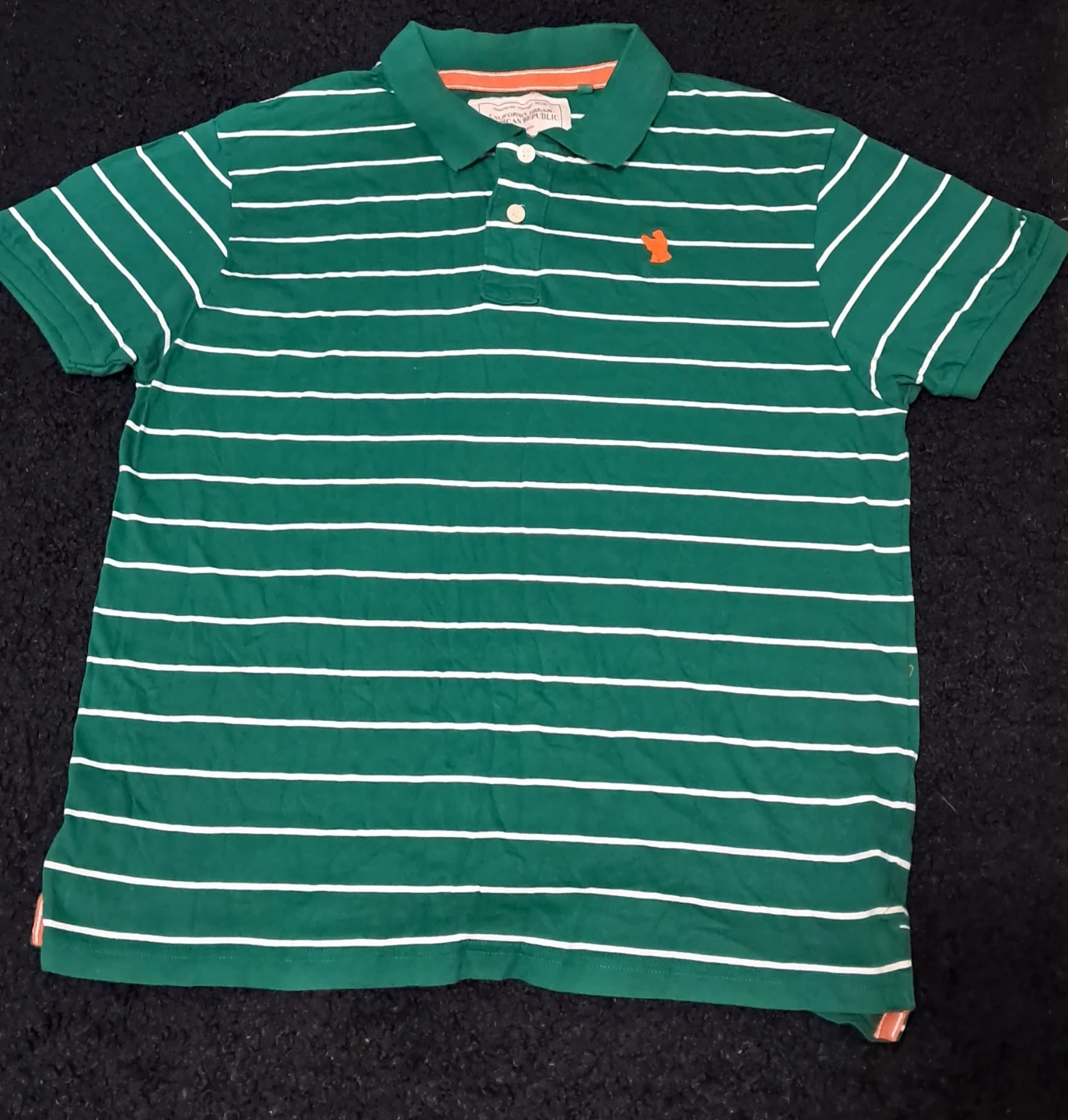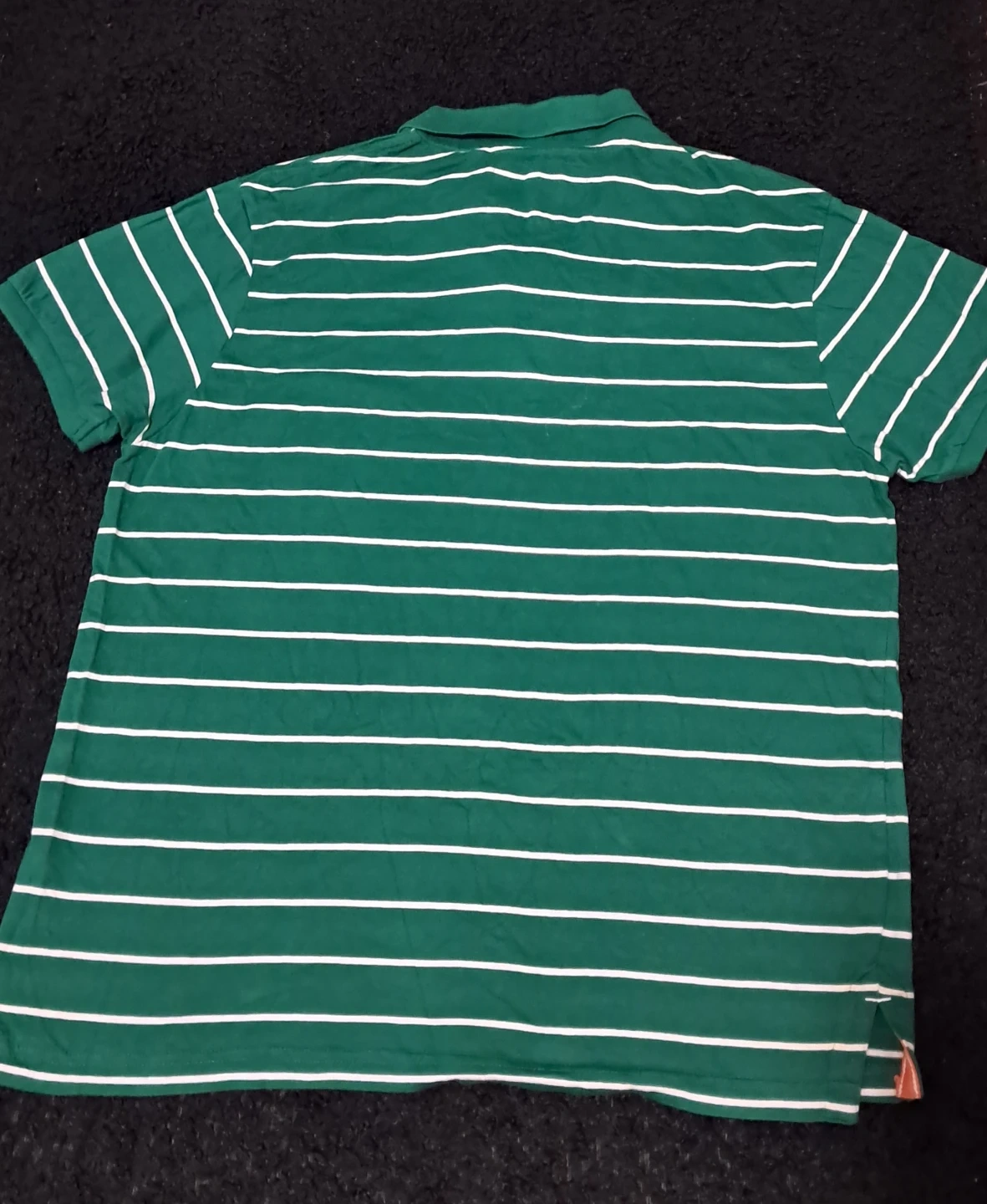 Here's a cool Original Penguin polo shirt! It's green with white stripes and has a small orange penguin logo on the chest. It's in great shape and ready for a new owner!