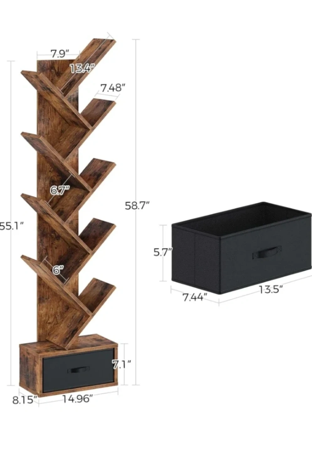 Selling a grey tree bookshelf. It has a unique design and includes a drawer at the bottom for extra storage. The dimensions are in the 3rd photo.Final sale,no returns or exchanges