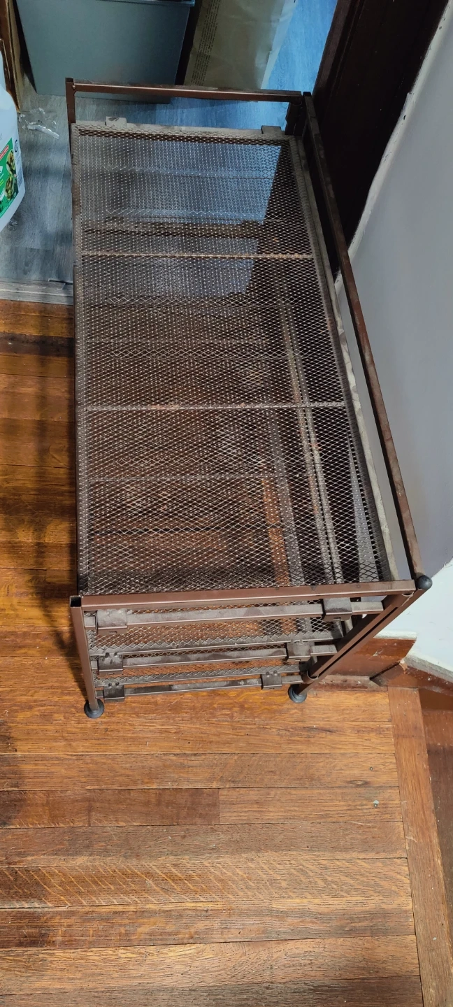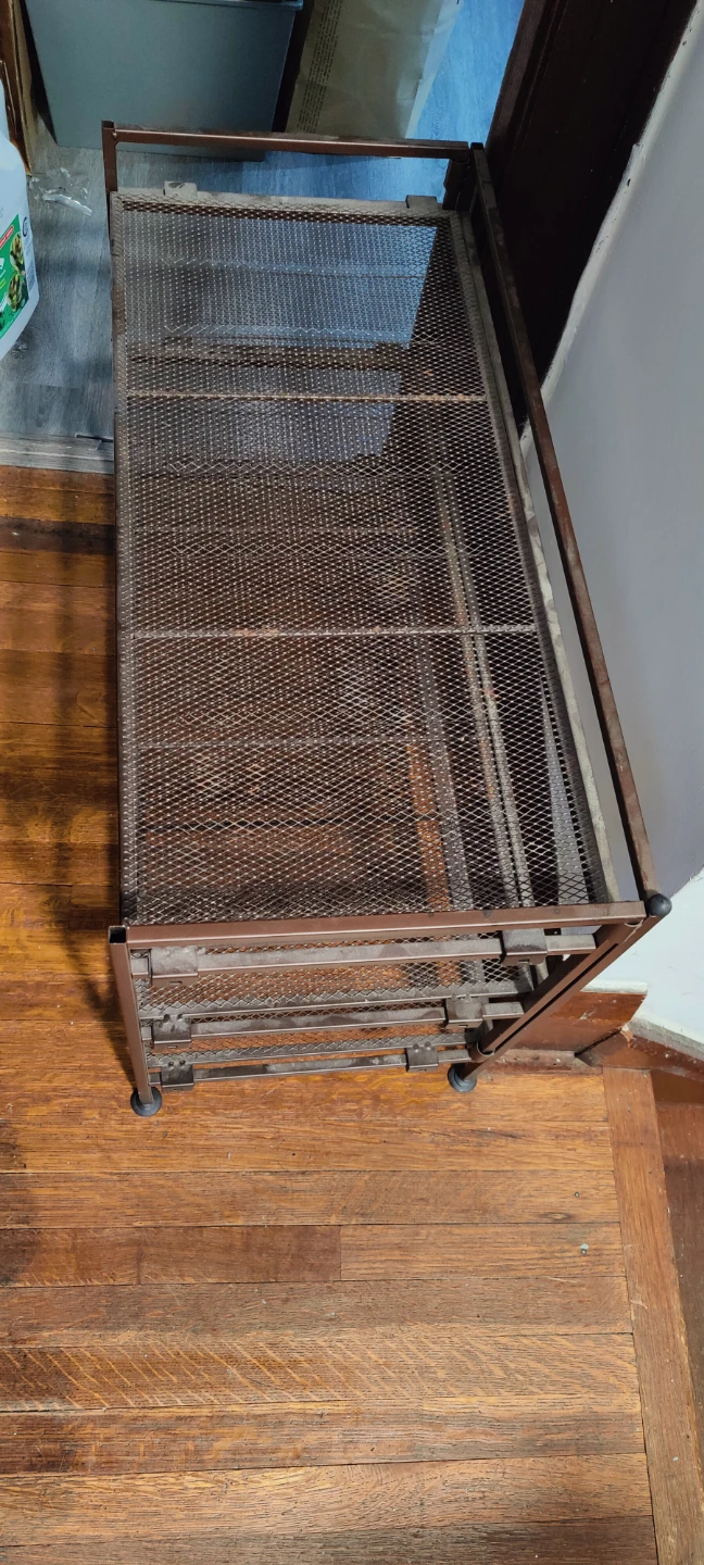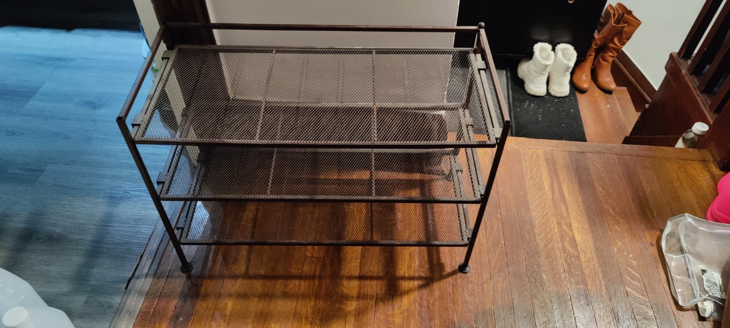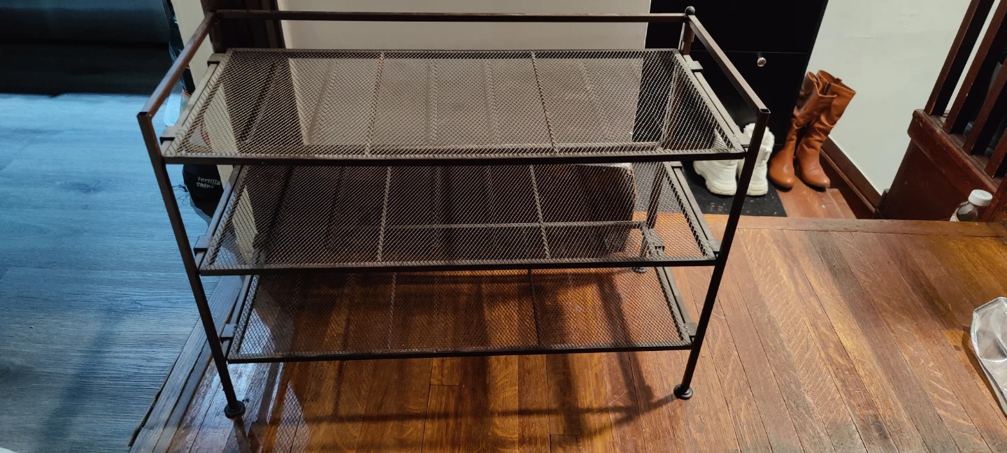 Here's a handy metal shoe rack with three tiers! It's perfect for keeping your entryway or closet organized. The rack is a dark brown colour and has a mesh design on each shelf. Great for storing shoes or other items.