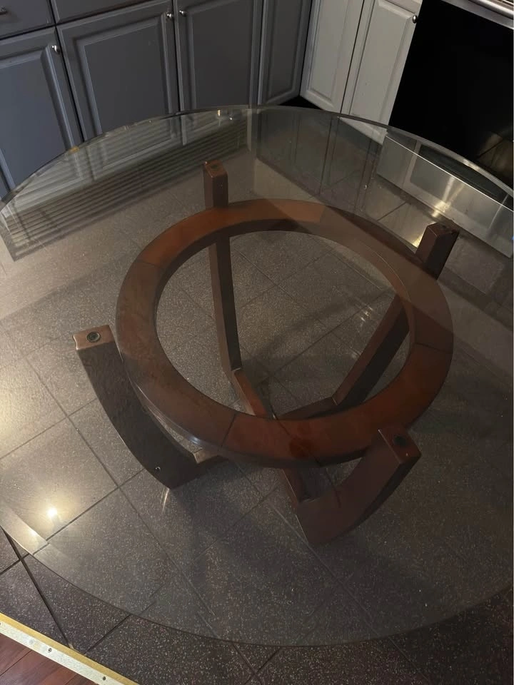 Round glass dining table featuring a real, solid wood base. Clean look that fits well in kitchens or dining areas.