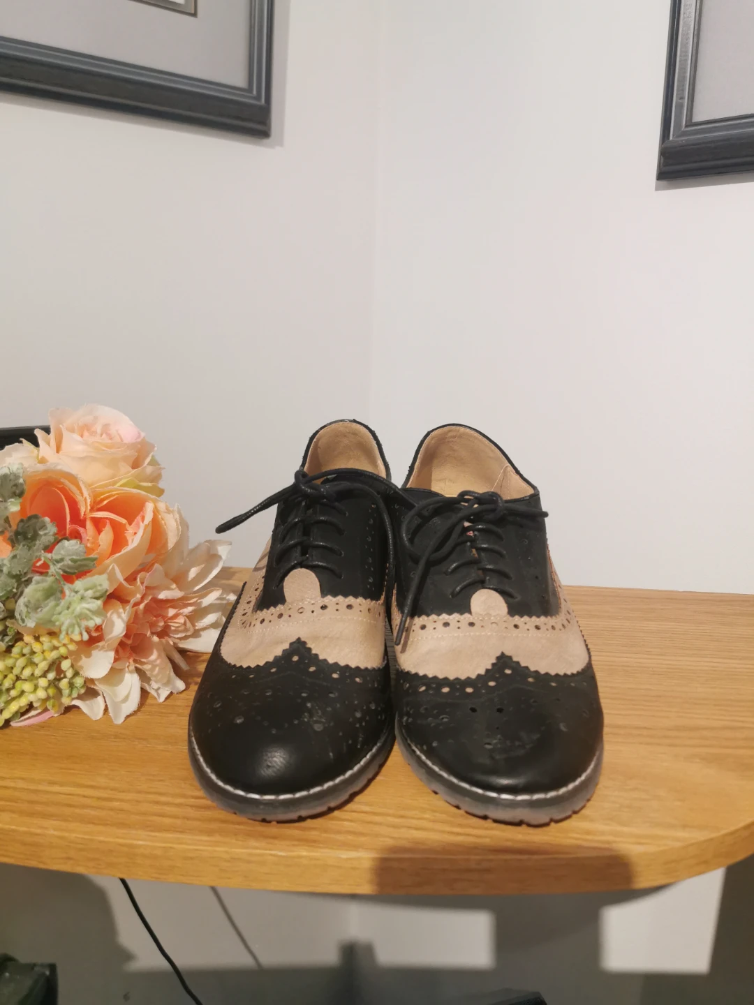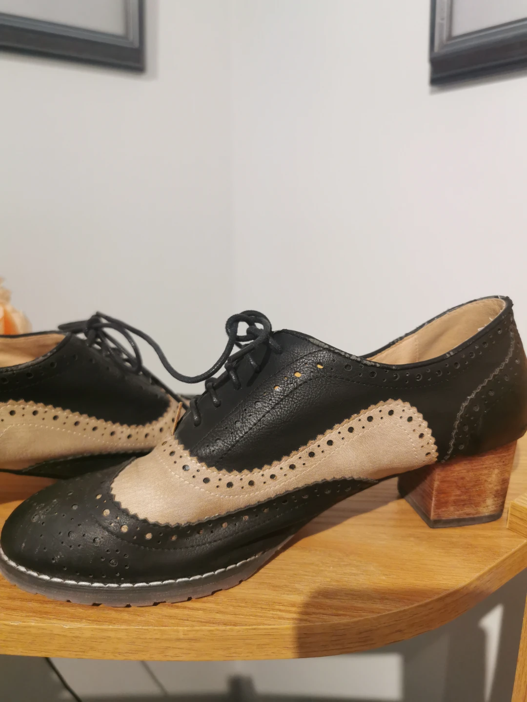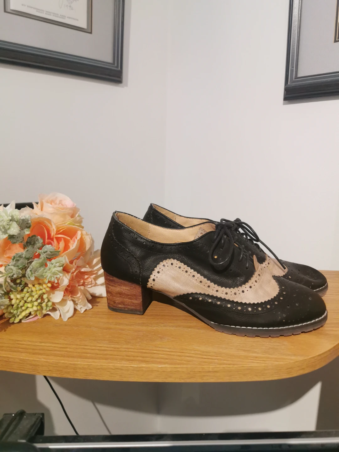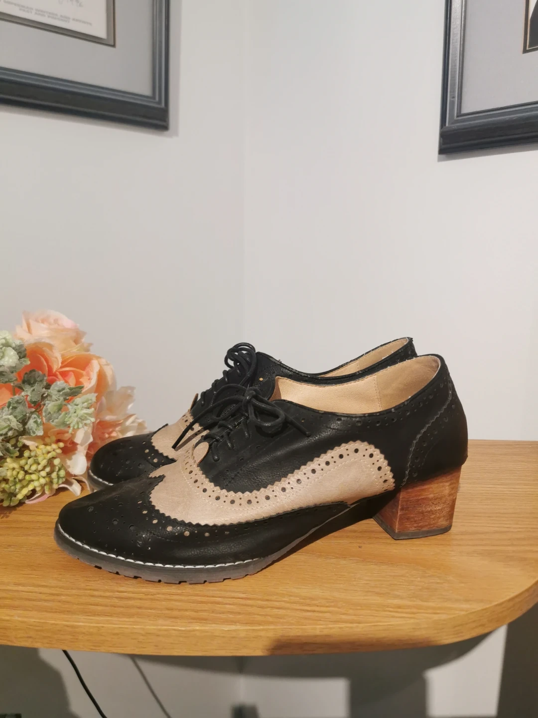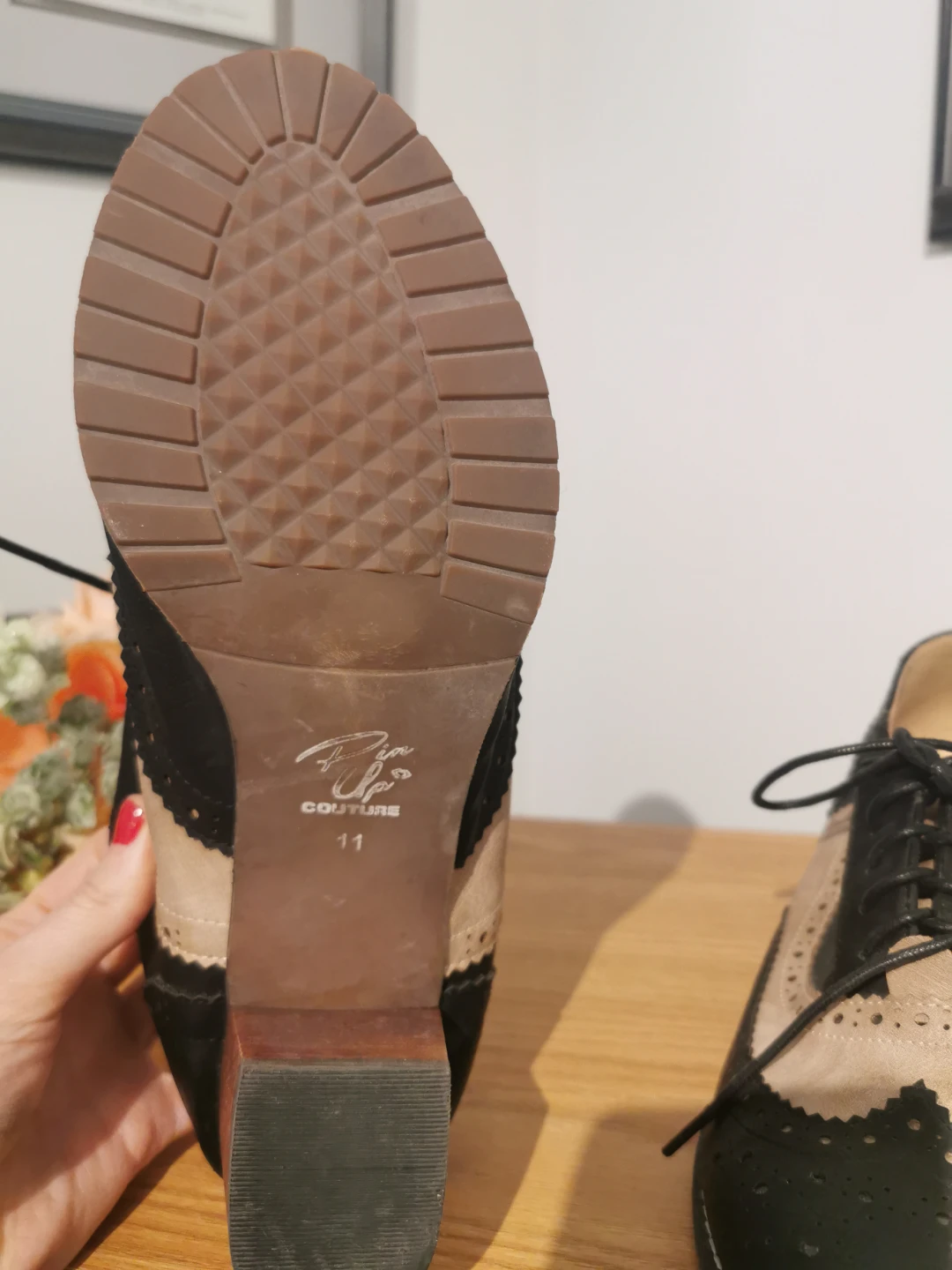 Selling a pair pinup Couture size 11. They feature a classic wingtip design with a unique heel. These shoes are in good condition and would be a stylish addition to your wardrobe!