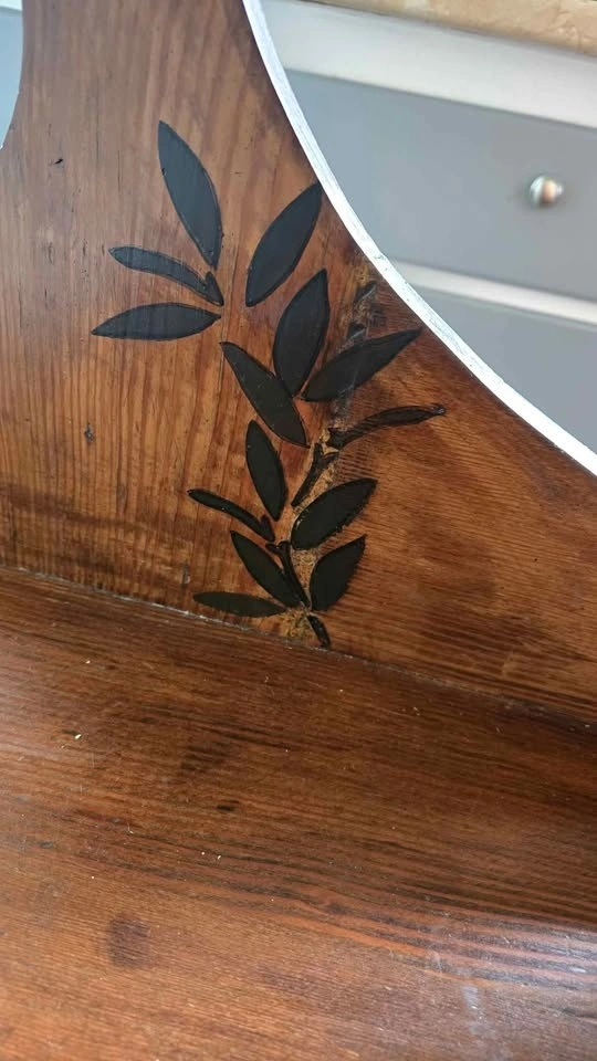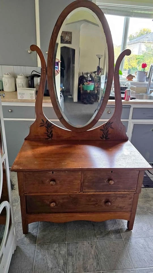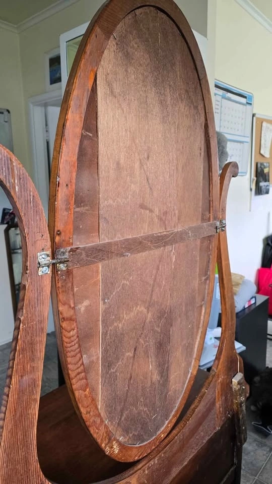 Very very old antique, real wood, bench with attached mirror. Not sure how old it is, no stamp, very sturdy.