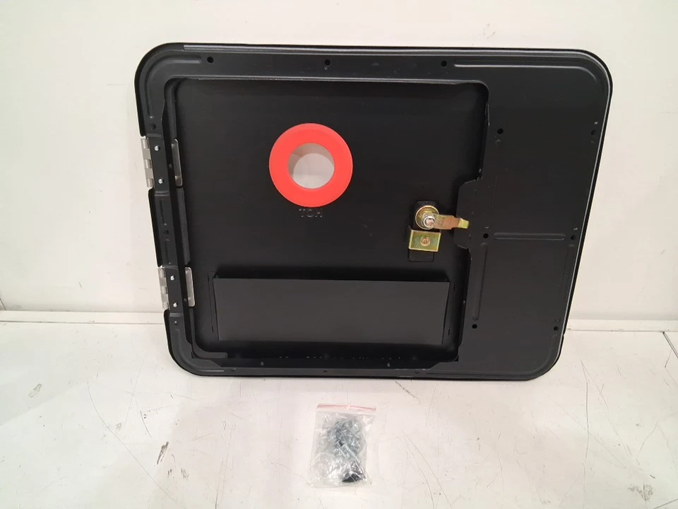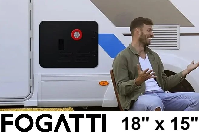 This is a brand new Fogatti RV water heater door, sized at 15" x 18" designed for RV water heaters. This door is constructed from galvanized steel, ensuring durability and resistance to the elements. Its robust design is professionally crafted to be waterproof and keep mosquitoes away from your water heater. Anti-bump hinges are equipped with the doors to withstand the bumps during the journey.