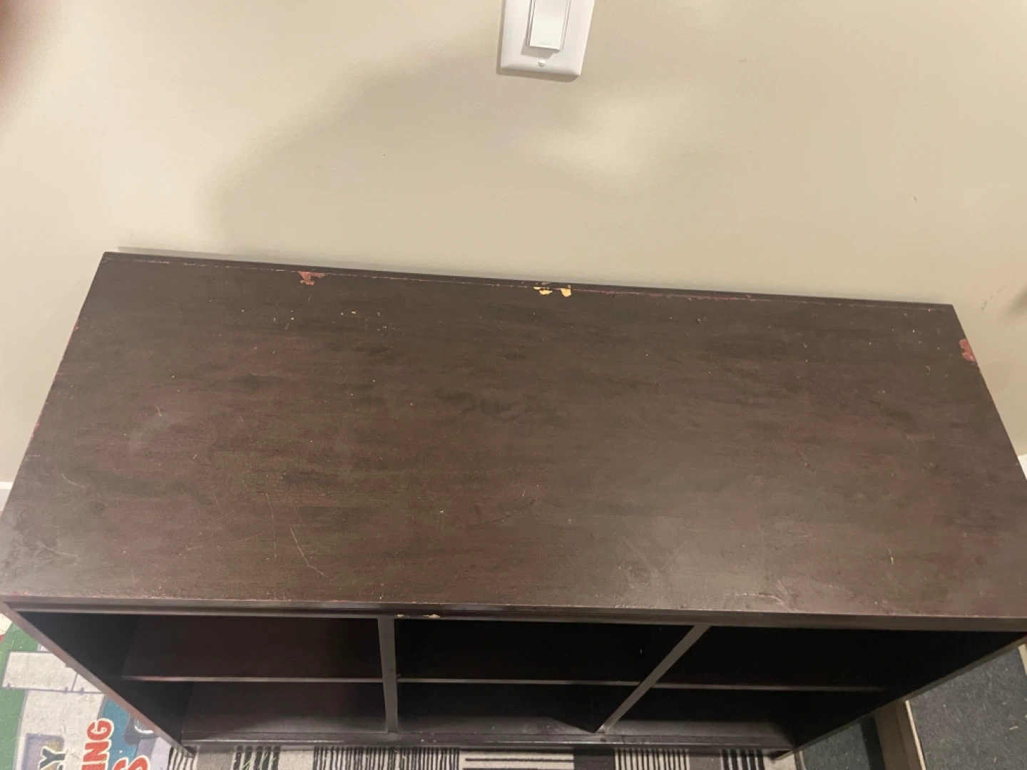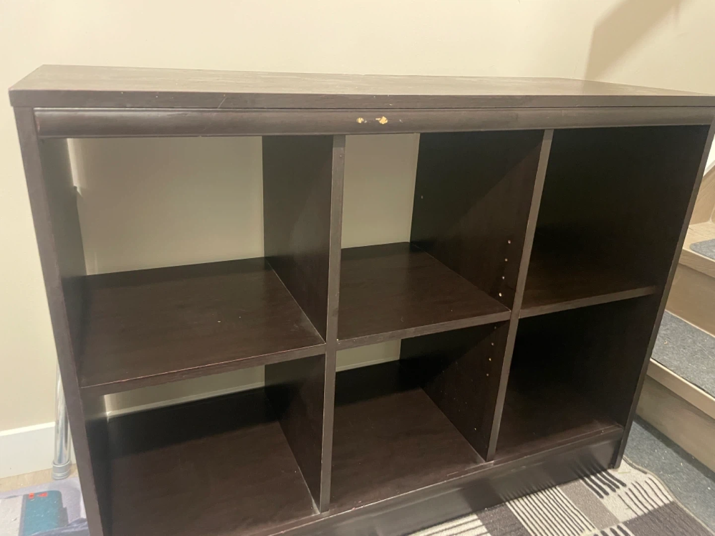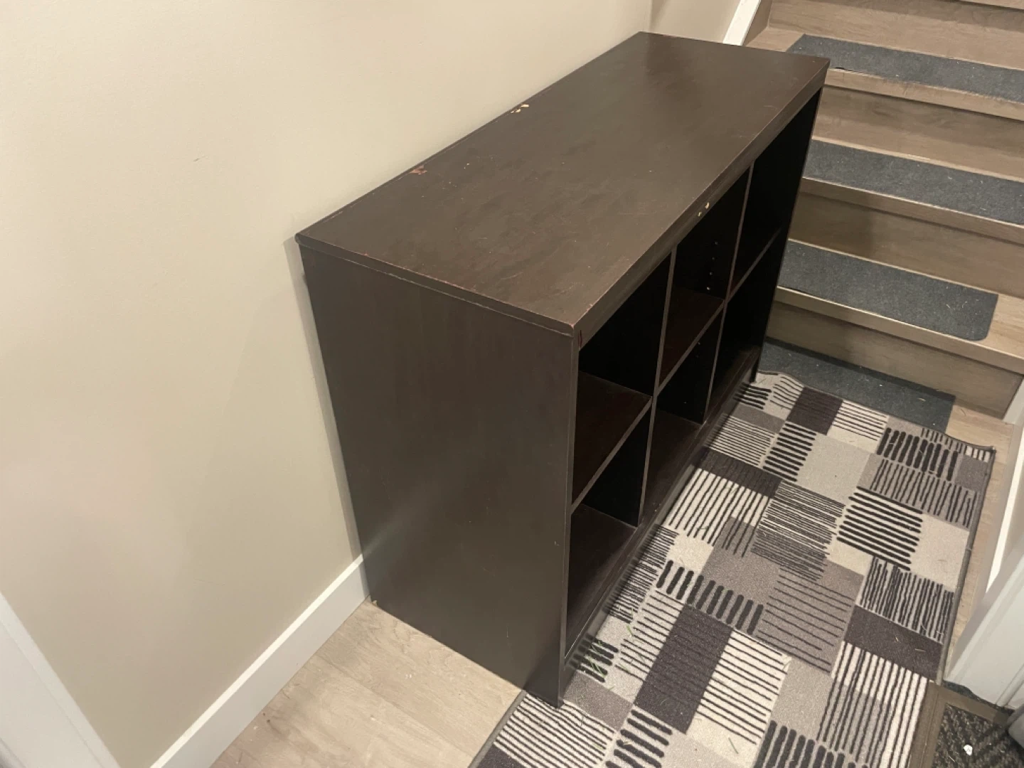 Here's a brown wooden shelf unit, perfect for organizing your space! It has signs of wear on the top surface, as you can see in the photos. It's sturdy and has multiple compartments for storage. I had purchased collapsible totes from Dollarama for a couple bucks each that fit well in the cubbies.