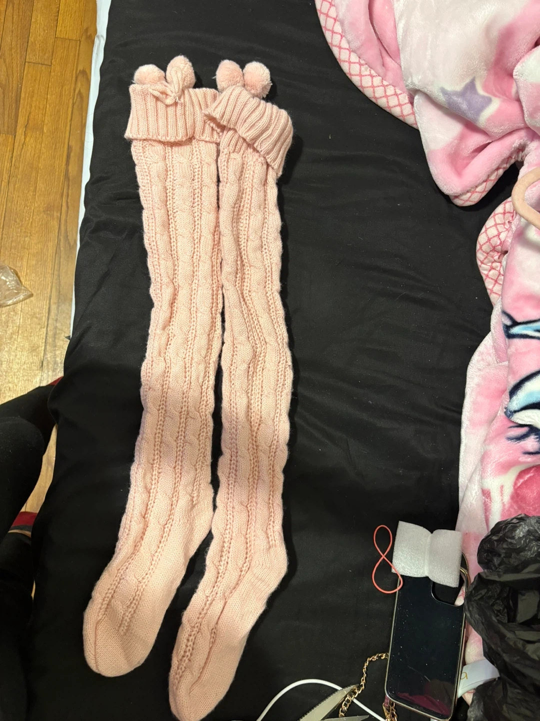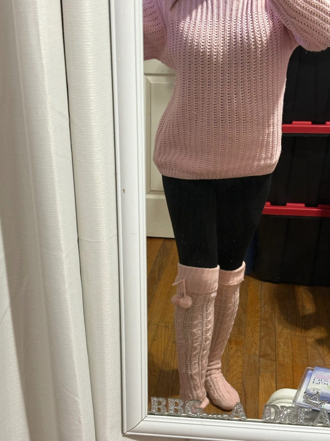 Selling a cute matching knit sweater and thigh-high socks set! The sweater has a cozy turtleneck style, and the socks have adorable pom-poms. Perfect for staying warm and stylish!