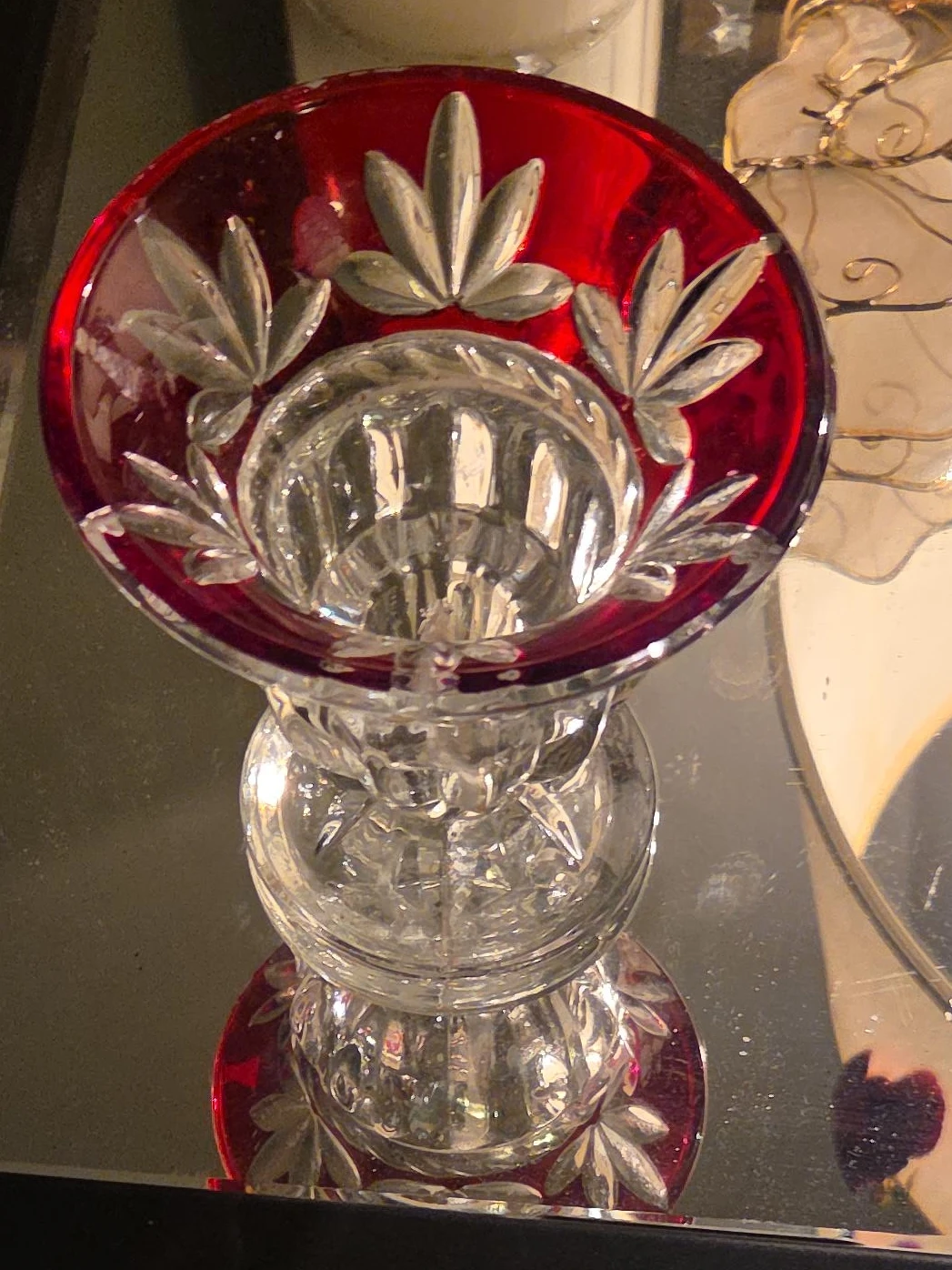 Selling a lovely red and clear crystal vase. It has a beautiful design with leaf-like patterns. It would look great as a centrepiece or decorative item in your home!