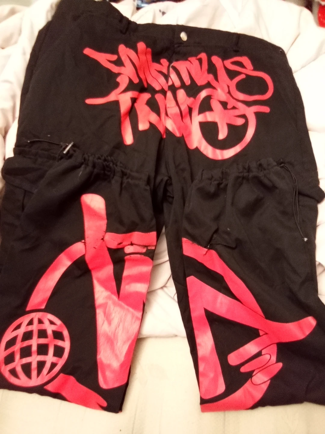 Selling a pair of Minus Two black pants. They feature a red graphic design. Great for adding a unique touch to your wardrobe! Plus it's extra baggy.