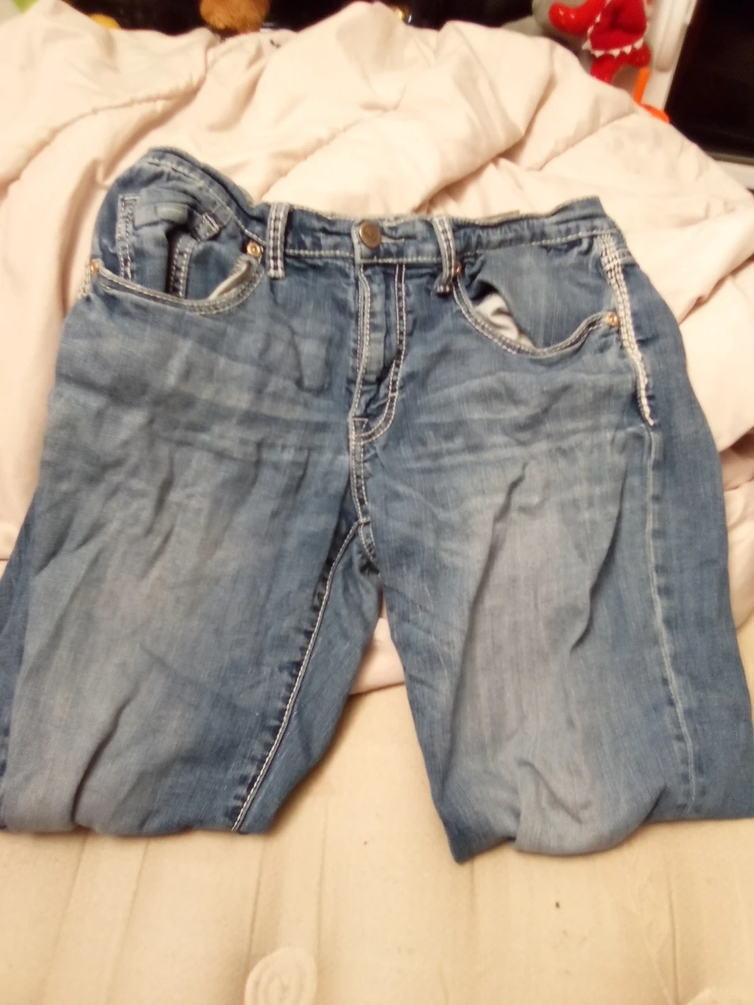 Selling a pair of BKE Jake denim jeans in size 32R. They're in good condition and have a classic look with detailed stitching on the pockets. Perfect for everyday wear!