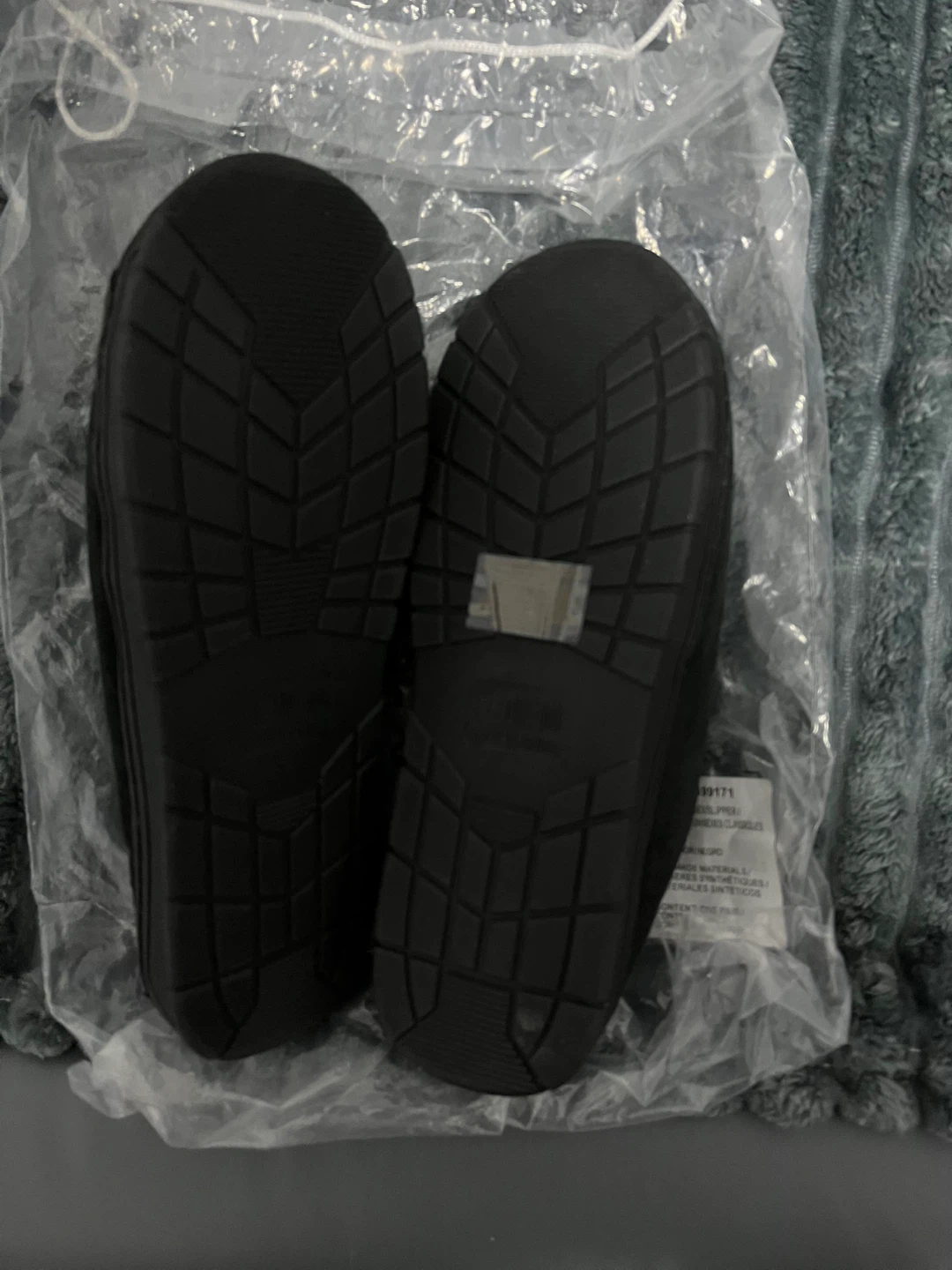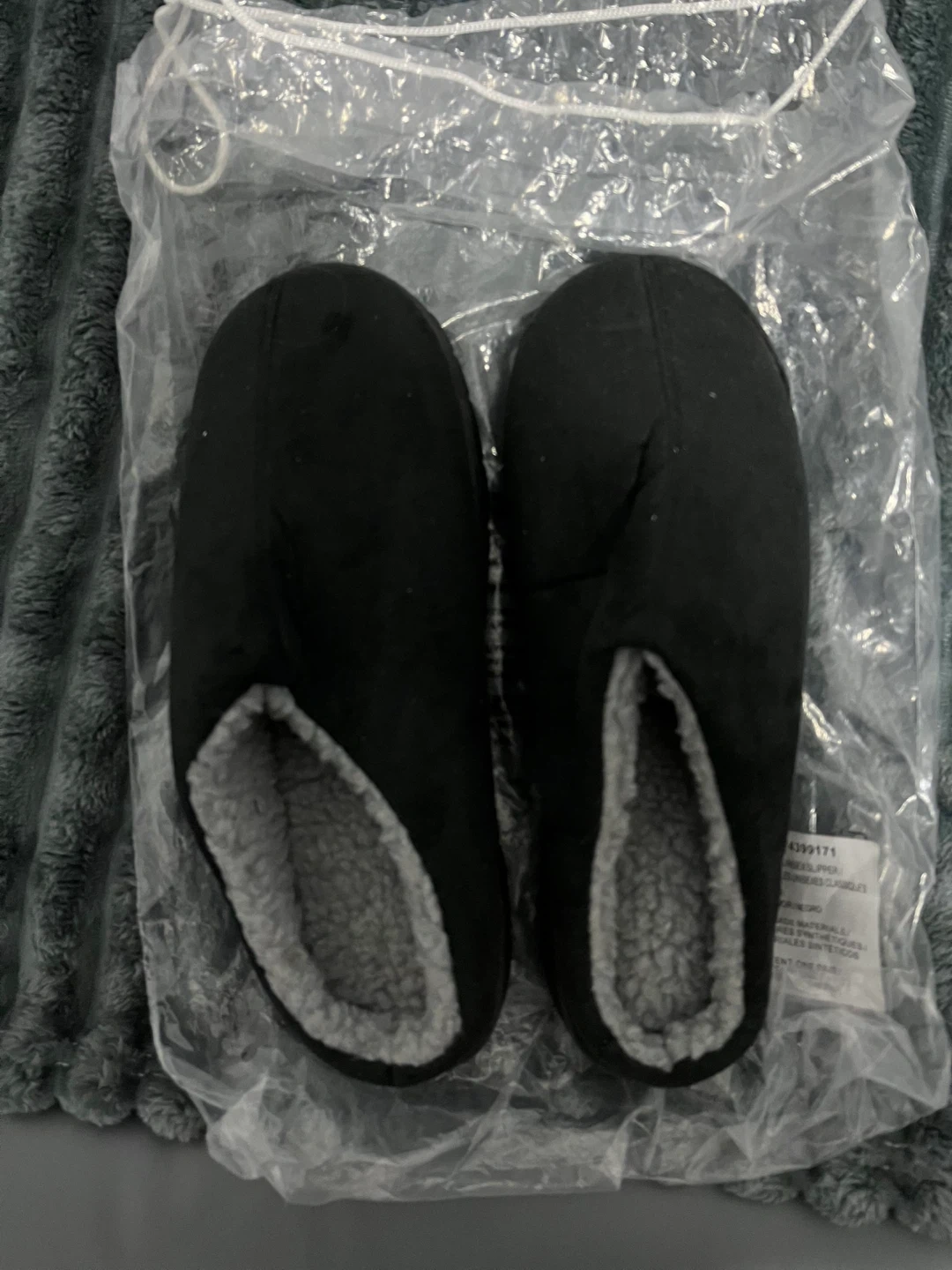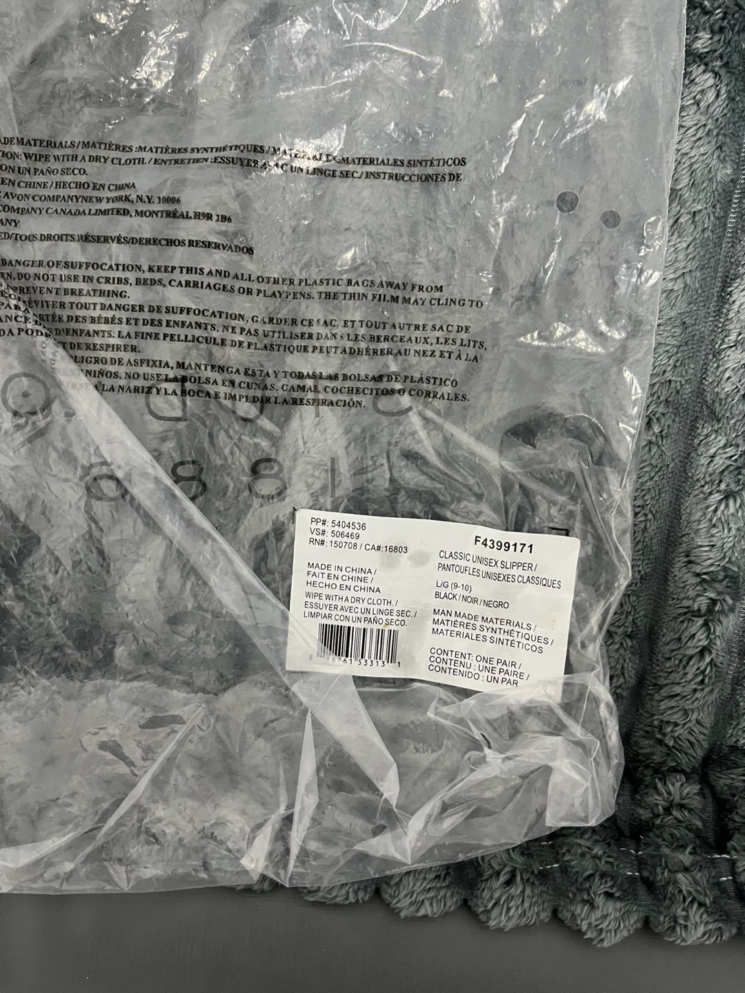 Selling a pair of classic unisex slippers in size L/G (9-10). They are black in colour and made of synthetic materials. Comes with the original packaging