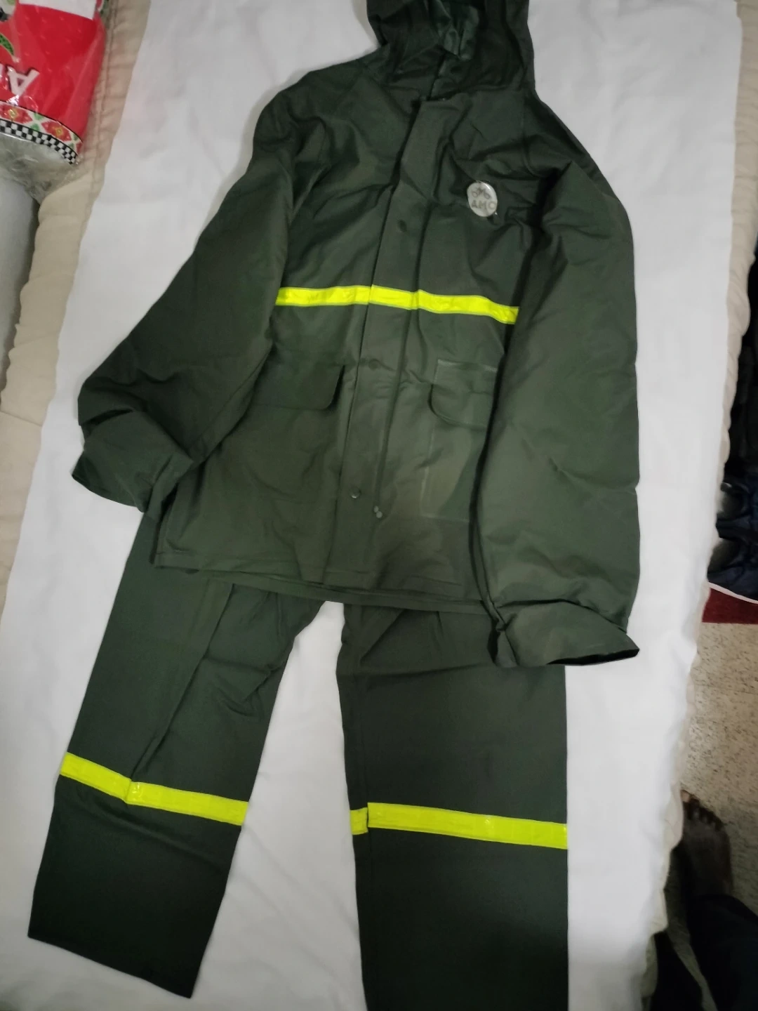 Selling a green AMO rain suit. It includes both a pair of pants and jacket with hood.. The suit has yellow reflective stripes for visibility. Great for staying dry during rainy days