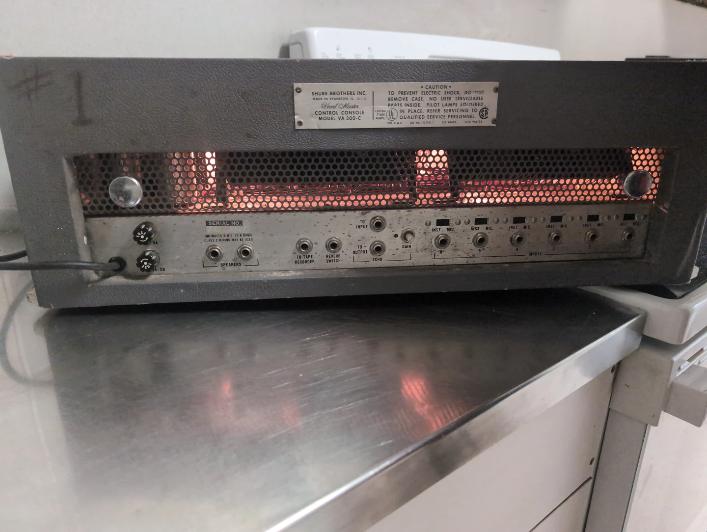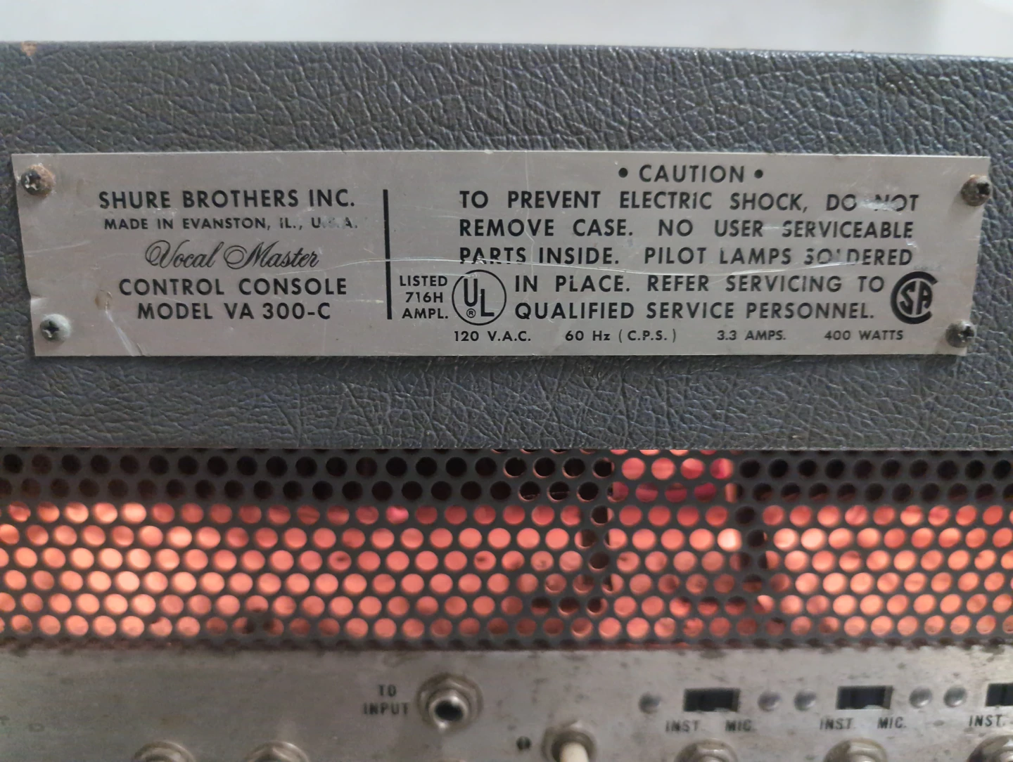 Selling a Shure Vocal Master Control Console, model VA 300-C. It's a vintage piece, made in Evanston, Illinois by Shure Brothers Inc. It requires 120V AC, 60 Hz, and 400 Watts. It's in used but mostly cared for condition. Turns on and works fine!