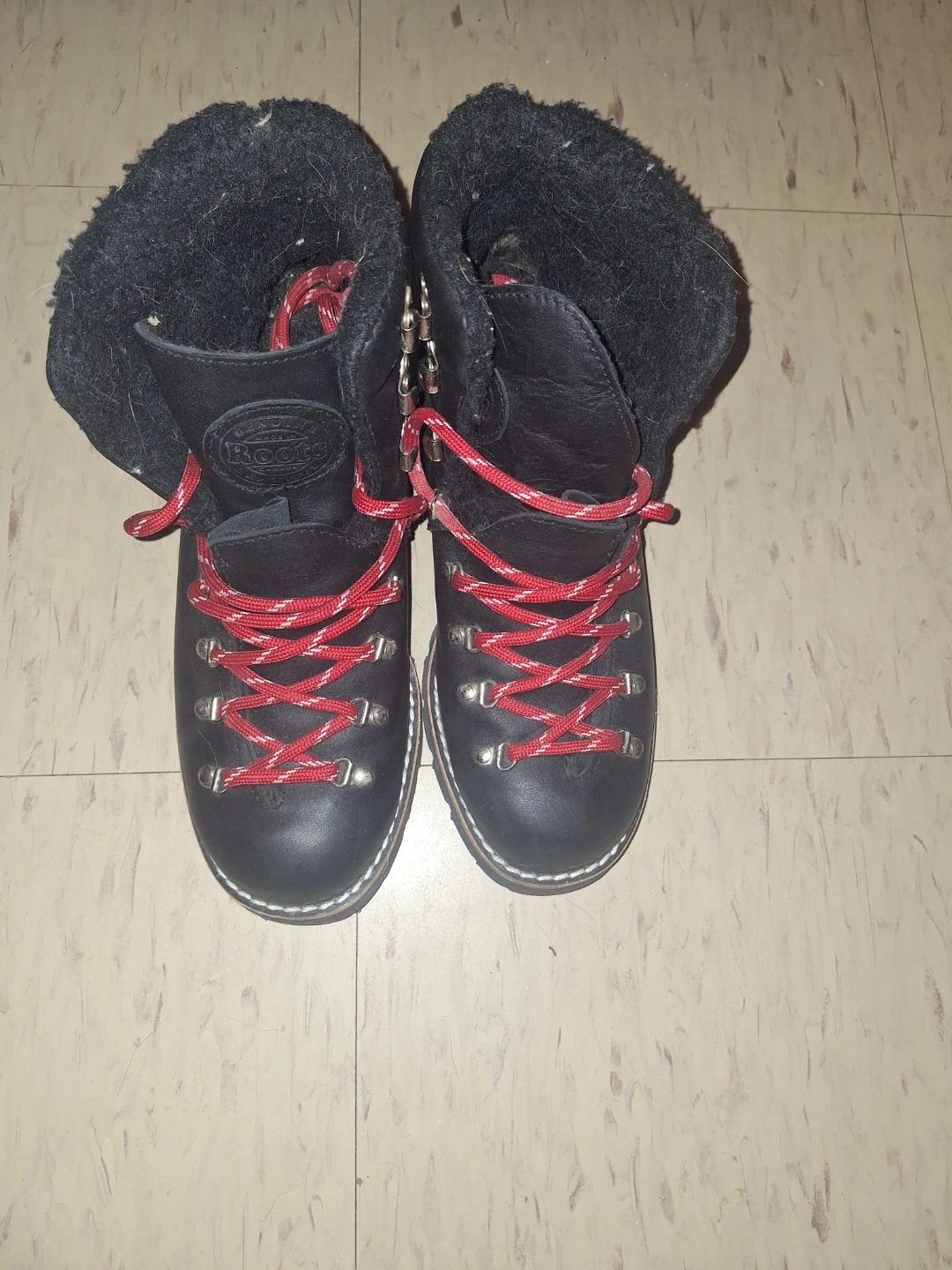 Selling a pair of Rosta hiking boots! They're black leather with red laces and have a cozy, warm lining. They've got some wear on the soles, but plenty of life left for your next adventure!