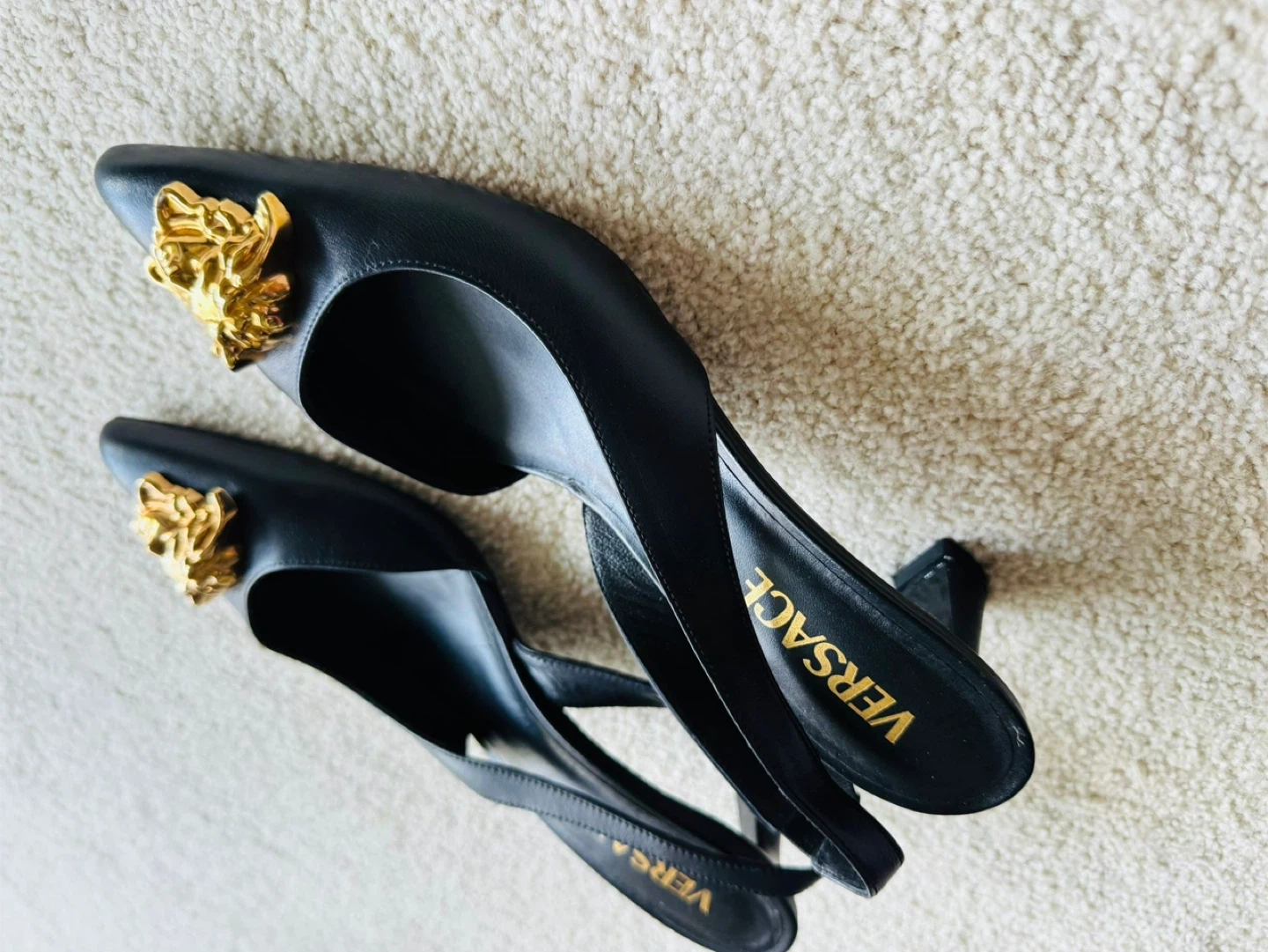Elegant and timeless authentic Versace black slingback heels featuring the iconic gold Medusa head detail. A classic luxury piece that elevates any outfit—perfect for formal events, dinners, or evening wear.
