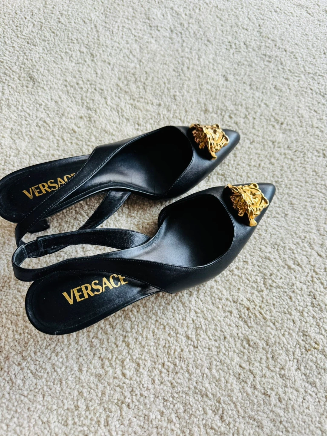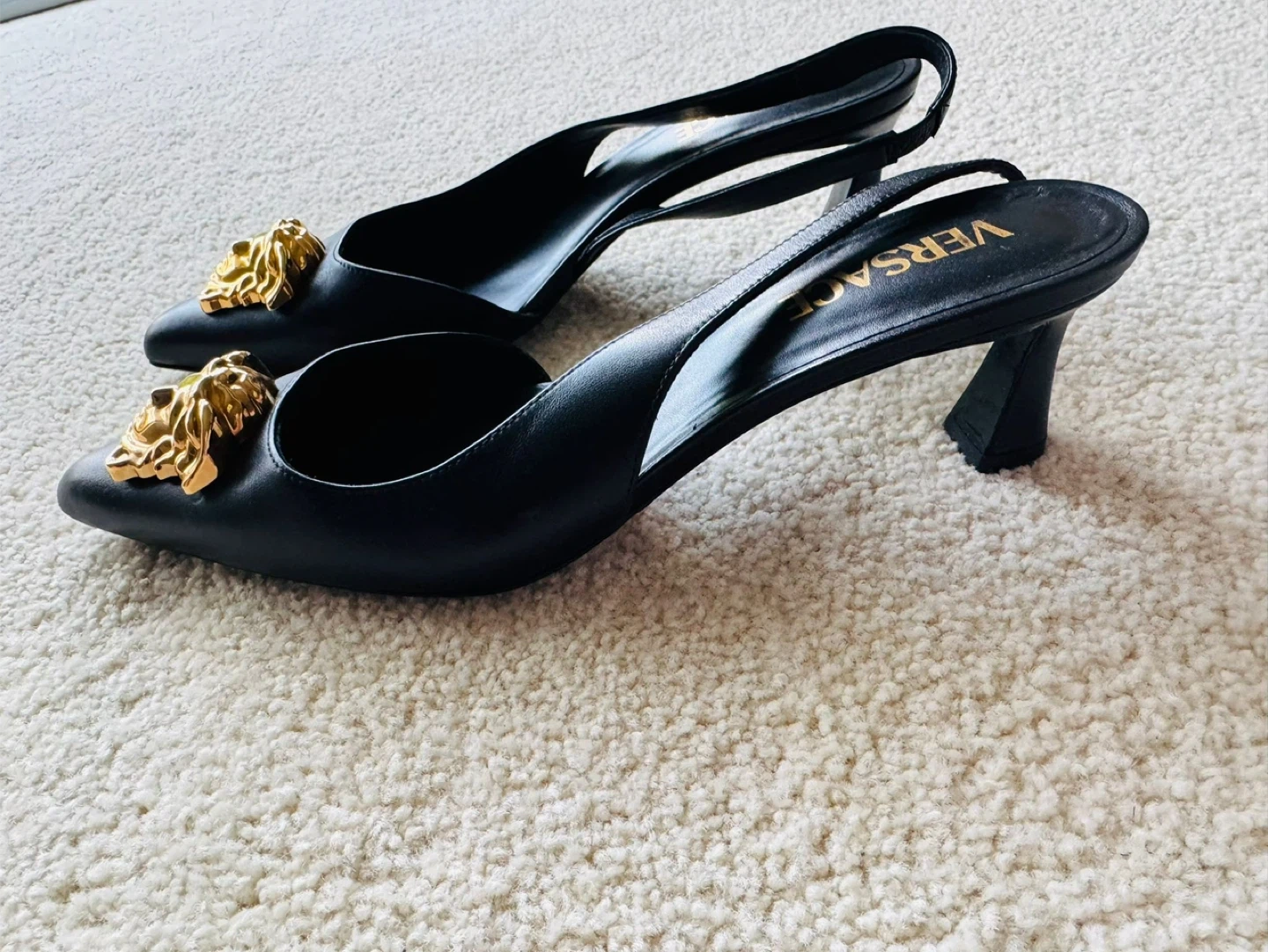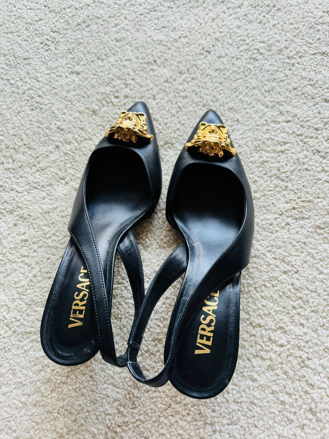 Selling a pair of Versace slingback heels in black. They feature the iconic gold Medusa emblem. These shoes are in great condition and ready for a new home!