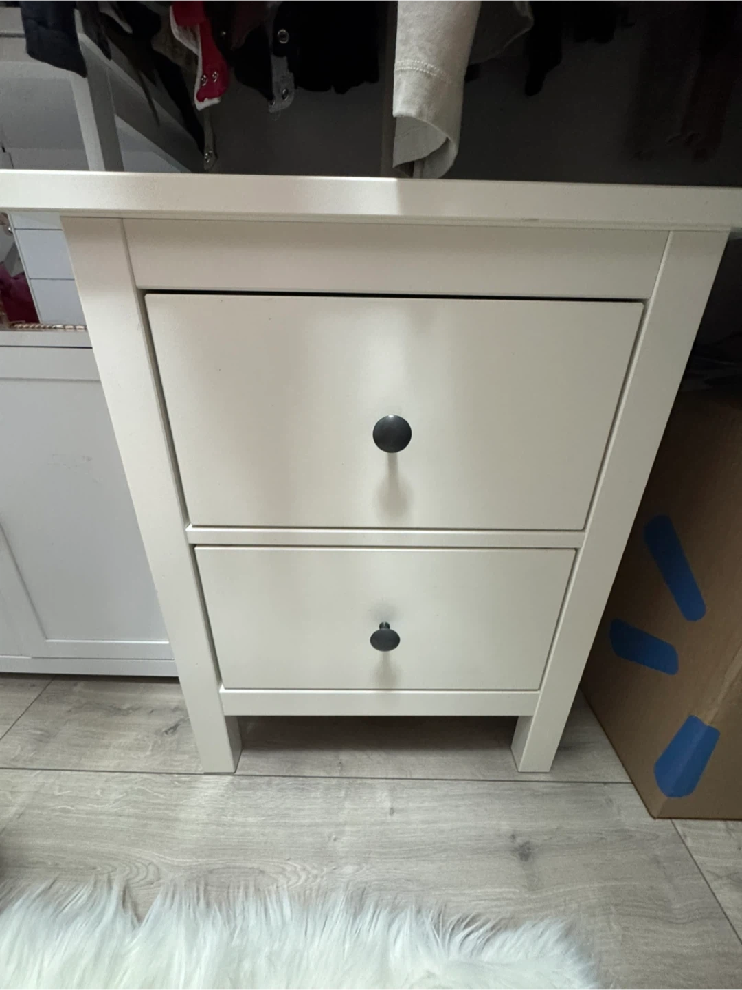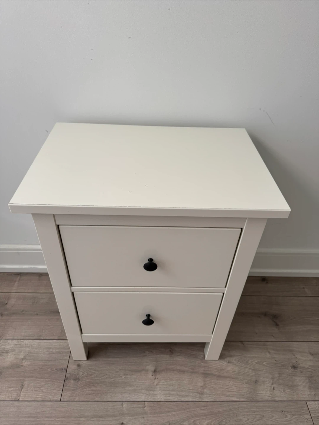 Selling 2 white IKEA Hemnes nightstand. It's in good condition, few very minor small scratches. Each nightstand has two drawers for storage. Perfect for a bedside table!