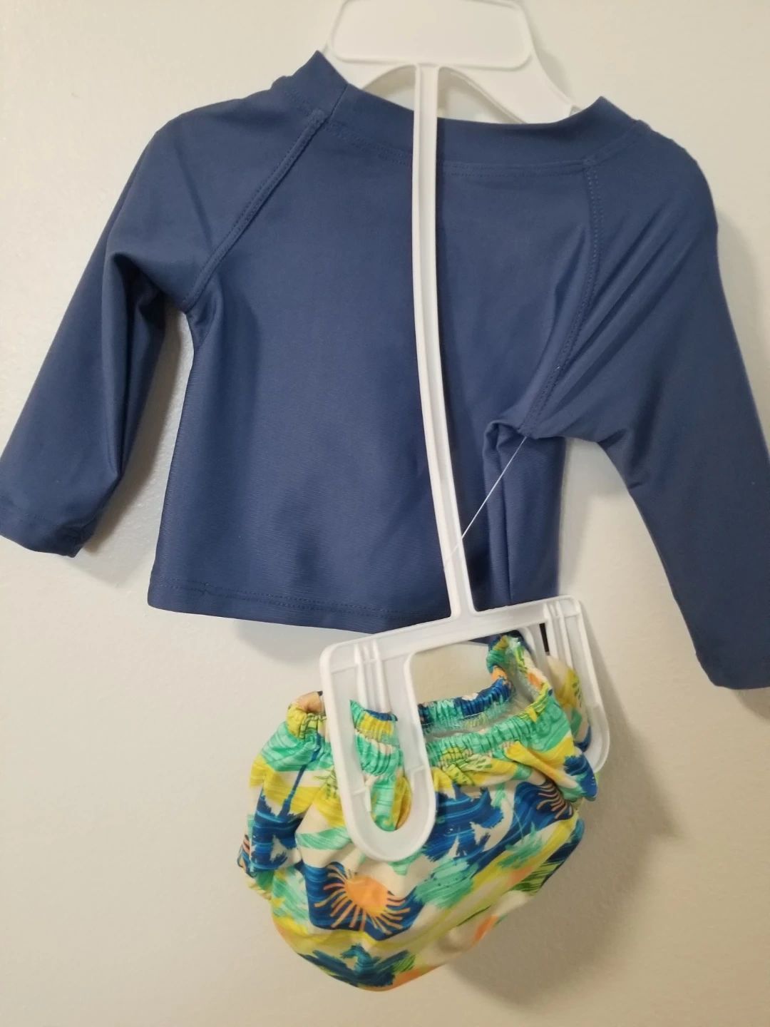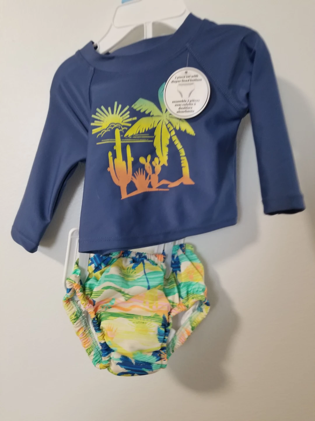 Cute 2-piece rash guard set for toddlers! The set includes a long-sleeved rash guard top and swim diaper bottom. Perfect for protecting your little one from the sun during beach days or pool time! New with tag