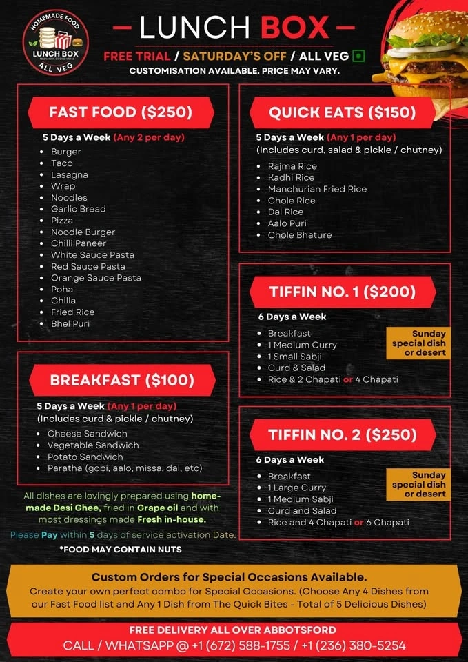 Buy & SellHome-Made TiffinHome-Made Tiffin$100FULLY CUSTOMISED Best quality fresh home-made food prepared in only home-made DESI GHEE and fried in GRAPE SEEDS OIL. Starts @ $100 onwardsWHERE TO MEETCheck LocationView MapSELLERJvMt. Lehman Interchange50 reviews0 chats·0 favorites·8 viewsSEND CHAT TO SELLERHi Jv! I’m interested in your listing.Hi Jv! I’m interested in your listing.Get the Karrot app to chatSign In to chat