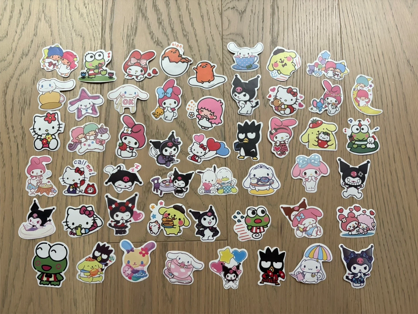 A bunch of cute Sanrio character stickers! There are a variety of characters like Hello Kitty, My Melody, Keroppi, and more! Perfect for decorating laptops, water bottles, or anything else you can think of