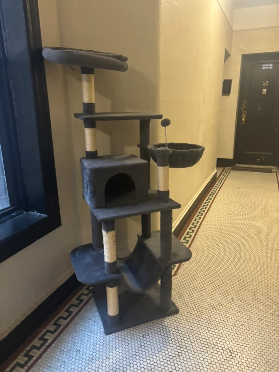 Selling a cat tree that's perfect for your furry friend! It features multiple levels, scratching posts, and a cozy condo for your cat to relax in. It's in great condition and ready for a new home.