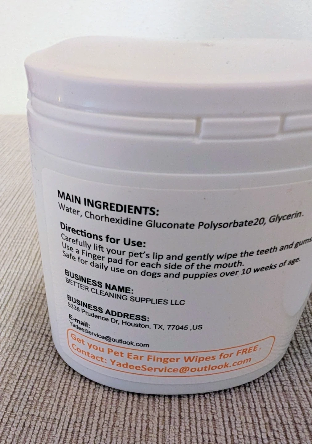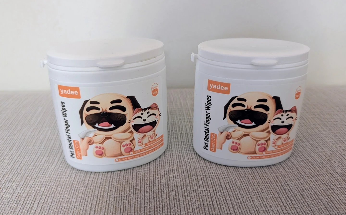 Selling a container of Yadee Pet Dental Finger Wipes for dogs and cats. These wipes are designed to clean teeth and remove tartar and plaque. They are safe for daily use on dogs and puppies over 10 weeks of age. Main ingredients include water, chlorhexidine gluconate, polysorbate 20, and glycerin